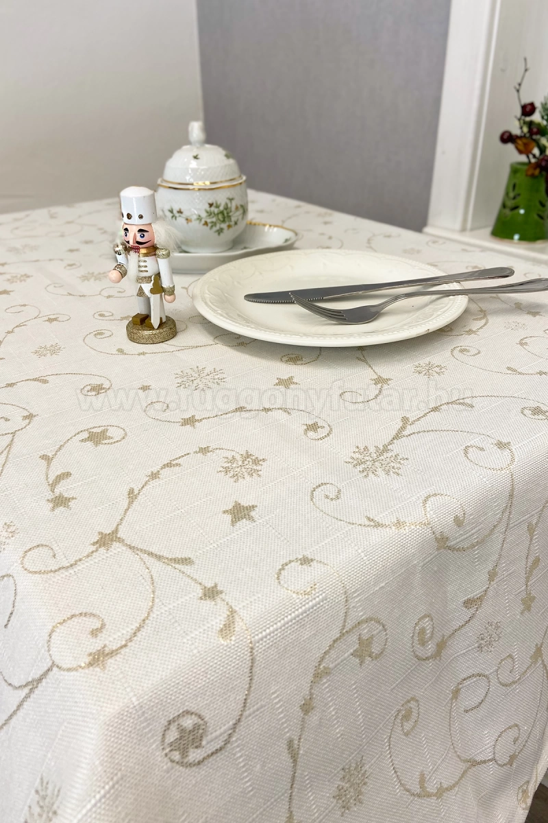 Fényes arany szállal szövött karácsonyi mintás rusztikus szálbeszövésekkel díszített vászon dekor anyag. Elsősorban asztalterítőnek vagy díszpárna huzatnak ajánljuk.