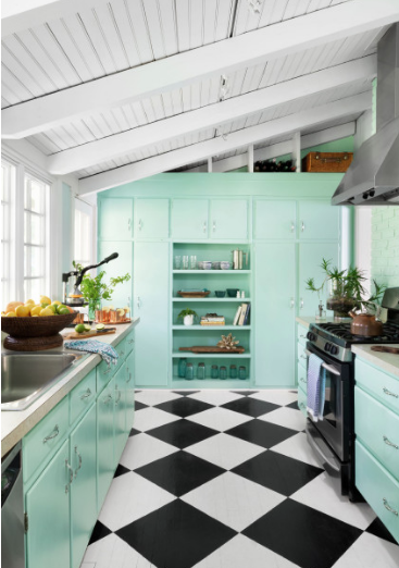 A ház főbejárata közvetlenül a konyhába nyílik, korábban pedig közvetlenül a kamrába nyílt. Kicserélték a készülékeket, de megtartották az eredeti szekrényeket, mosogatót és munkalapokat. A házaspár a konyha linóleumpadlóját is felszedte, és az eredeti kockakő padlót sértetlenül fedezték fel alatta. A szekrényeket a víz színét idéző kékes zöldre festették. Bár vízparti hangulatot akartak, nem szerették volna túlzásba vinni.