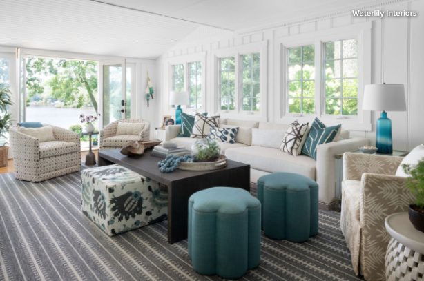 A helyiség extra hosszú mérete megfelelő méretarányú bútorokat igényelt.  A kanapé a tévé felé néz és egy extra nagy dohányzóasztal illik a helyhez. A szobában lévő összes fotel forgatható, így a vízre néző kilátás, a kandalló, a TV vagy egymás felé fordulhatnak.