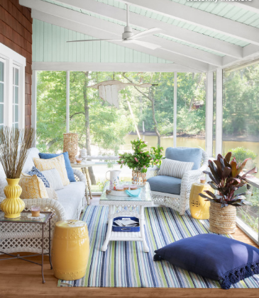 A szellős, árnyékolt veranda már megvolt. Miklós és Tündi leszedte a festéket a padlóról, és újrafestette, hogy illeszkedjen a belső terekhez, és kékes-zöld festékkel festették be a mennyezet lambéria deszkáját. A kényelmes fehér fonott bútorok és a zöld-kék csíkos szőnyeg vízparti hangulatot kölcsönöznek, élénksárga díszítéssel.