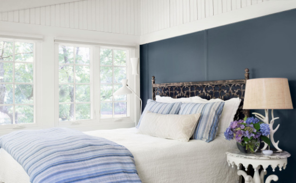 Tündi a vendéghálószoba fejtámlát a sötétkék fallal szerette volna hangsúlyozni. „A fém ágykeret antik megjelenésű, és tetszett a mintája” – mondja.
