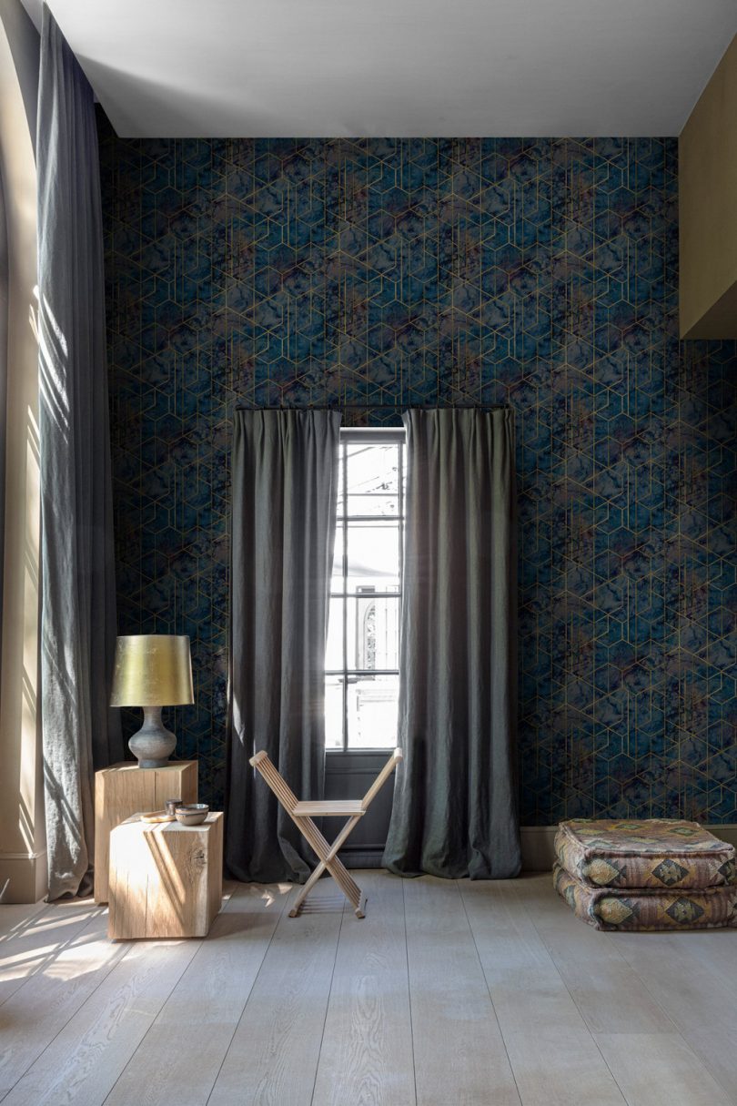 Nyomdai klisék vagy esetleg régi írógép kalapácsai lehettek a tapéta mintázatát alkotó fém betűk és számok. Ritmusos ismétlődésük éredekes hangulatot kelt, nagyszerűen illik egy irodába, dolgozószobába vagy akár egy könyvesbolt belső terében is remekül mutat.