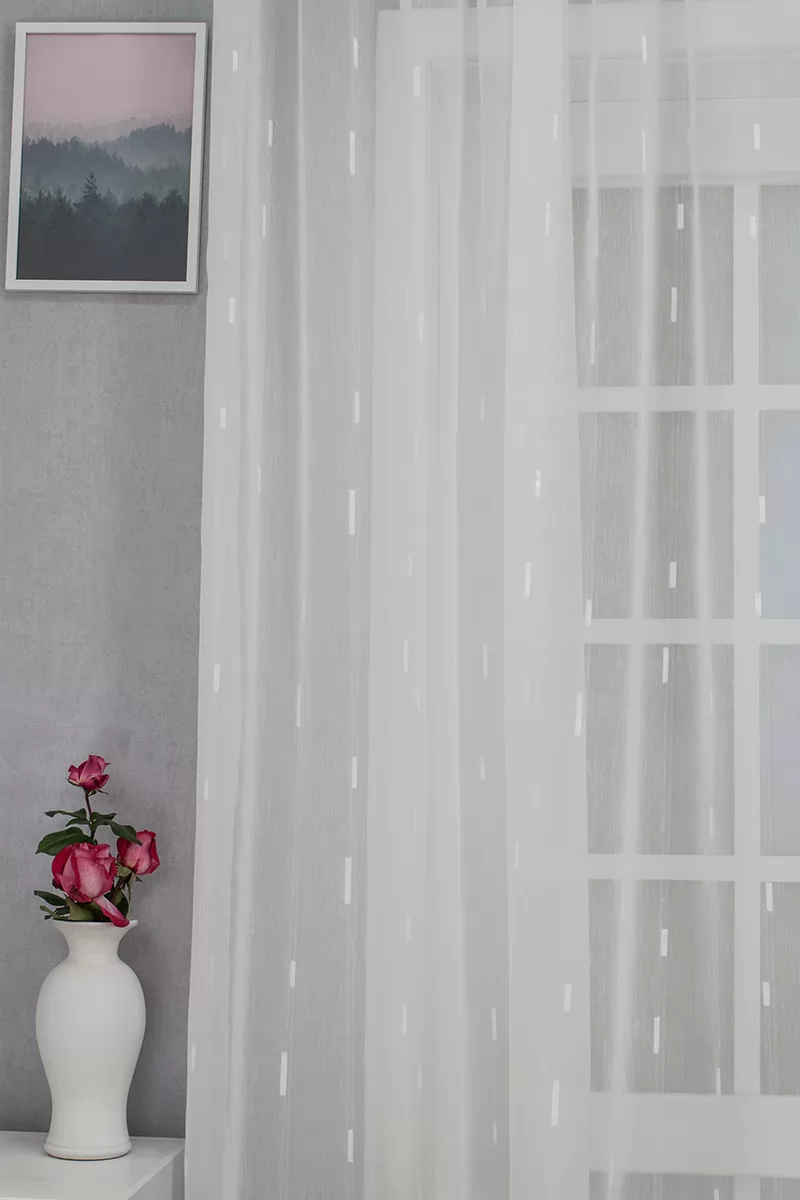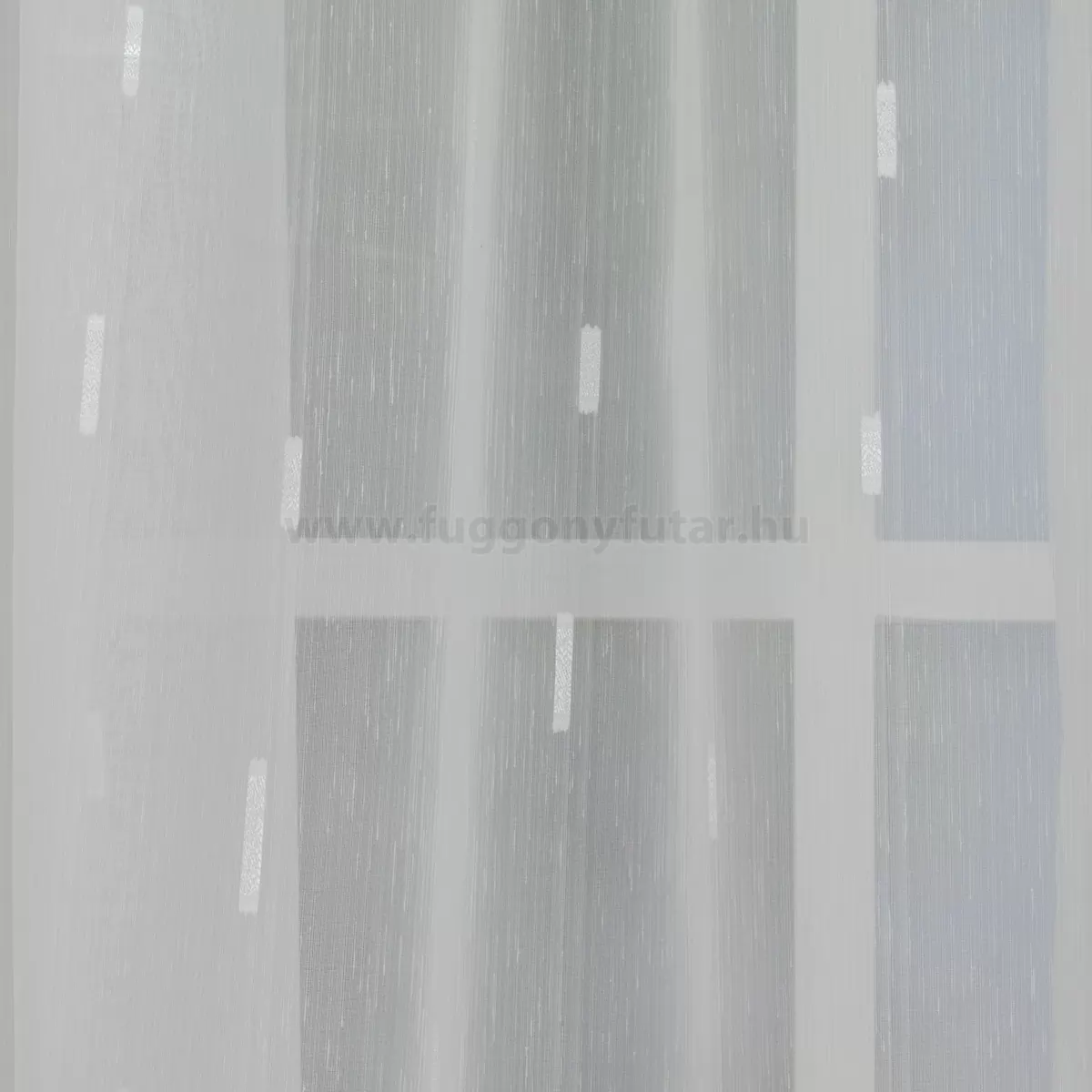 Egyszerű, elegáns, mégis vidám,  sokféle berendezéshez illik ez a kis,  4 cm-es fehér  téglalapokkal élénkített fehér sable függöny. Könnyen kezelhető, kevésbé gyűrődő,  mosás után helyére akasztva szárítható.  Alul ólomzsinór szegélyezi.A szórt mintás anyagok izgalmas felülete bármely helyiségben jól mutat Az anyag teljes felületén elszórtan megjelenő ritkább-sűrűbb szálbeszövések izgalmas felületet hoznak létre. Bármilyen, színben harmonizáló, mintás anyagot remekül párosíthatunk hozzá. A fehér szín légies és világos, fényt hoz a szobába  A fehér a világosság és a tisztaság színe, egész nap érezhetjük a friss tavaszi szellő simogatását, ha egy szép fehér függöny díszíti az ablakunkat.Ez a függöny többféle lakberendezési stílushoz is jól illeszthető Ez a függöny több lakberendezési irányzathoz is tökéletesen illeszkedik – legyen szó a klasszikus eleganciáról, a minimál letisztultságról vagy a skandináv egyszerűségről. Anyaga diszkréten simul bele a térbe, miközben kiemeli a helyiség hangulatát. Ideális választás, ha olyan textilt keresünk, amely rugalmasan alkalmazkodik a meglévő bútorokhoz és kiegészítőkhöz.A légies elegancia harmóniája  A nyár típusú anyagok  a kifinomult, hűvös eleganciát képviselik. Színvilágukban a hideg pasztellek, mint a levendula, a menta, a púderrózsaszín és a törtfehérek uralkodnak. Könnyed, szellős anyagaikkal nyugalmat és szofisztikált hangulatot teremtenek. Ideális választás a higgadt, elegáns személyiségeknek. Anyaga diszkréten simul bele a térbe, miközben kiemeli a helyiség hangulatát. Ideális választás, ha olyan textilt keresünk, amely rugalmasan alkalmazkodik a meglévő bútorokhoz és kiegészítőkhöz.Anyaga: sablé Változó vastagságú szálakból szőtt anyag. Kevésbé hajlamos a gyűrődésre , mint a voile. 1.5x-es ráncolással ajánljuk.Terasz ajtókhoz, nagyobb ablakok függönyözéséhez jól használható A karnistól a felső szegéshez szükséges anyagot beleszámítva legfeljebb 298 cm hosszú függönyt lehet belőle varrni, ez alatt bármilyen méretben elkészítjük. Méreténél fogva alkalmas lehet terasz- és erkélyajtók, nagy belmagasságú helyiségek valamint normál ablakok függönyözésére  is.