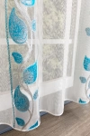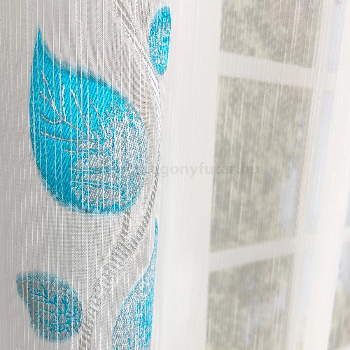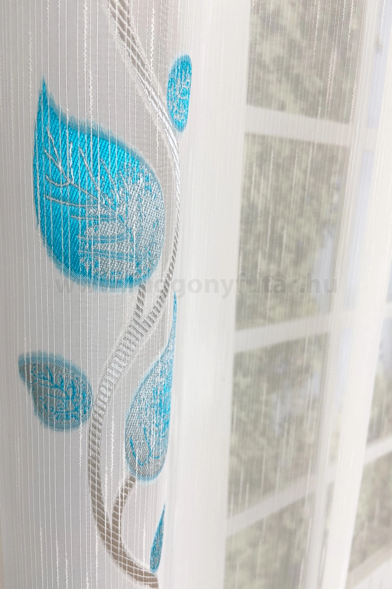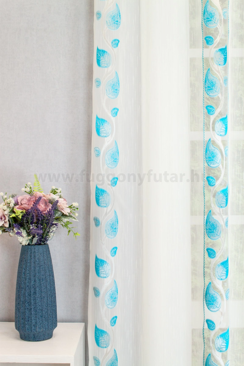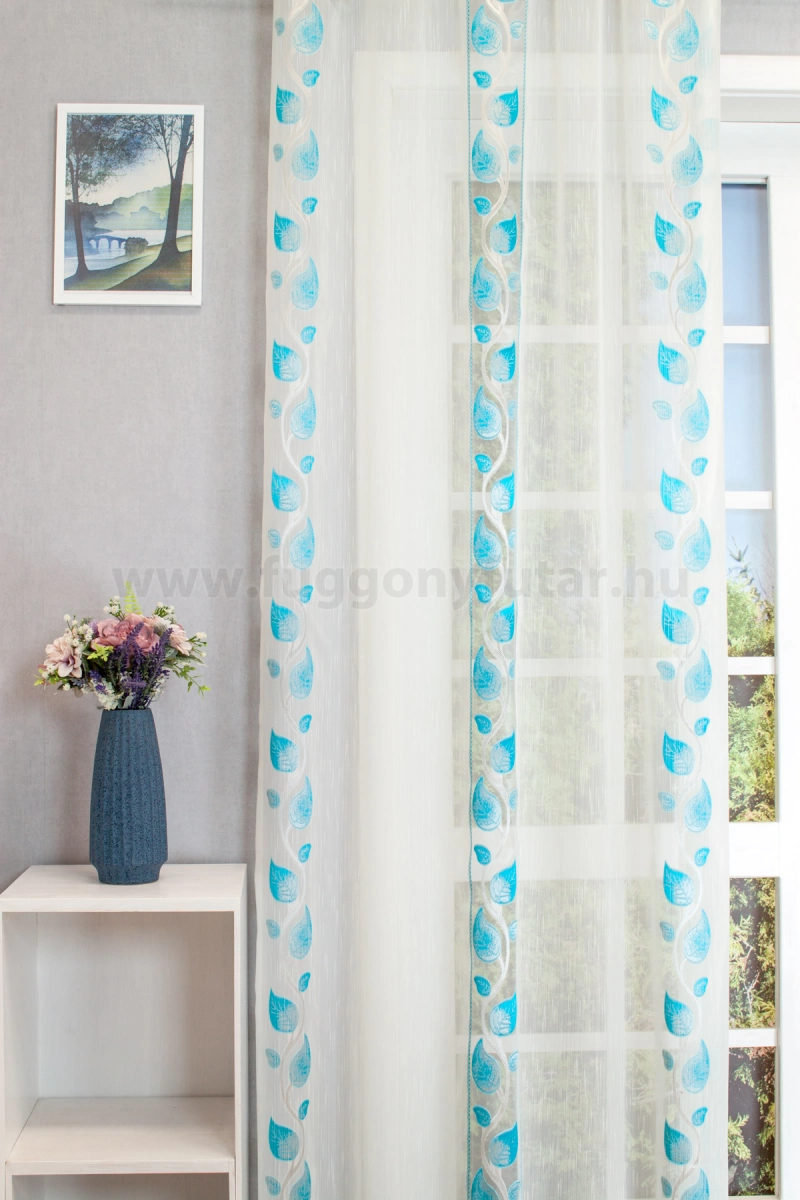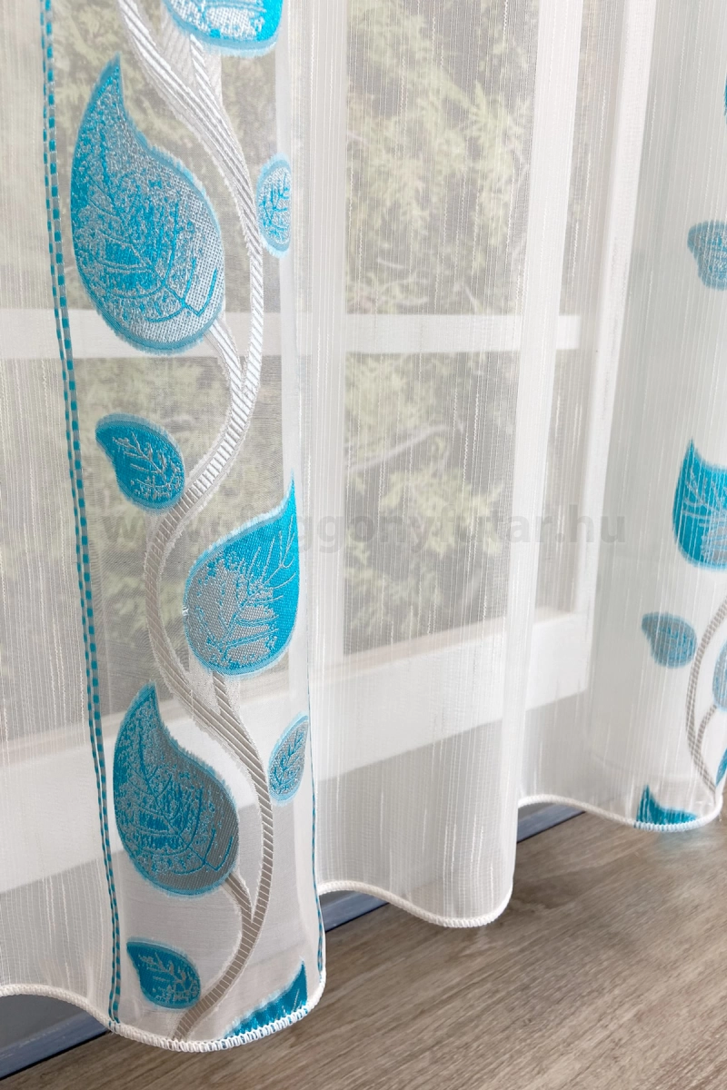 Teremtsünk romantikus hangulatot szobánkba ezzel a kellemes, növényi mintás anyaggal! A növényi minták mindig is népszerűek voltak a textiltervezők és lakberendezők körében, hiszen barátságossá és természetközelivé teszik otthonunkat. Egyszínű, színben harmonizáló textilekkel kombinálva romantikus stílust és kiegyensúlyozott megjelenést kölcsönözhetünk helyiségünknek. Tengert idéző türkiz Ez a tengert idéző kékeszöld árnyalatú anyag stílusos megjelenést ad bármelyik helyiségnek. Semleges meleg színnel vagy pasztell színekkel párosítva divatos színkombinációkat kreálhatunk. A türkiz mintás fényáteresztő függönyökhöz általában a hasonló tónusú türkiz, zöld, kék, sötétkék, sárga, fekete és szürke színű sötétítő és dekorfüggönyök illenek legjobban.Ez a függöny klasszikus lakberendezési stílushoz jól illeszthető Ez a függöny tökéletesen illeszkedik a klasszikus stílus eleganciájához. Anyaga diszkréten simul bele a térbe, miközben kiemeli a helyiség hangulatát. Ideális választás, ha olyan textilt keresünk, amely rugalmasan alkalmazkodik a meglévő bútorokhoz és kiegészítőkhöz.A megújulás energiája otthonában A tavasz típusú textíliák frissességet, optimizmust és energiát sugároznak. Színvilágukban a zsenge zöldek, a napsárgák, a barackos árnyalatok és a tiszta kékek dominálnak. Ez a stílus tökéletesen illik a dinamikus, vidám személyiségekhez. Anyaga diszkréten simul bele a térbe, miközben kiemeli a helyiség hangulatát. Ideális választás, ha olyan textilt keresünk, amely rugalmasan alkalmazkodik a meglévő bútorokhoz és kiegészítőkhöz.Anyaga: voile Vékony, könnyed, fátyolszerű anyag . Az organzához képest vastagabb szálakból szövik, így kevésbé átlátszó, nehezebben gyűrődik, bár vasalást azért igényel (gőzölős vasalóval viszonylag könnyen, sérülésmentesen vasalható). 1.5x v. 2x-es ráncolással ajánljuk.Terasz ajtókhoz, nagyobb ablakok függönyözéséhez jól használható A karnistól a felső szegéshez szükséges anyagot beleszámítva legfeljebb 288 cm hosszú függönyt lehet belőle varrni, ez alatt bármilyen méretben elkészítjük. Méreténél fogva alkalmas lehet terasz- és erkélyajtók, nagy belmagasságú helyiségek valamint normál ablakok függönyözésére is. A függöny aljába gyárilag varrt ólomzsinór megfelelő esést kölcsönöz a függönynek, megakadályozza az indokolatlan fellebbenést és az apróbb ráncokat is kisimítja.Vasalást kevésbé igénylő anyag Az anyag kevesebb vasalást igényel, mint az átlag függöny. Sokszor elég, ha mosás után még nedvesen a helyükre akasztjuk, így kilógva magát a ráncok kisimulnak és a függönyünk teljes pompájában ragyog!