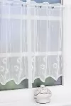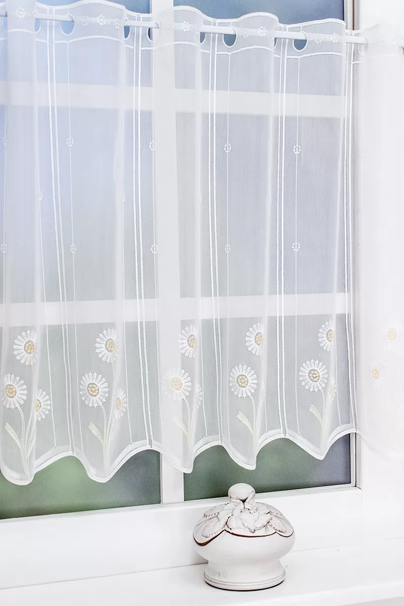 Romantikus, vidéki stílus kedvelőinek ajánljuk ezt a 10 cm-es oszlopokra osztott, kedves margarétákkal hímzett, fehér, sablé vitrázs függönyt. Felül egyenes, alul hullámos hímzett szegély zárja.Teremtsünk romantikus hangulatot szobánkba ezzel a kellemes, virágmintás anyaggal! A virágminták vagy növényi minták mindig is népszerűek voltak a textiltervezők és lakberendezők körében, hiszen barátságossá és természetközelivé teszik otthonunkat. Egyszínű, színben harmonizáló textilekkel kombinálva romantikus stílust és kiegyensúlyozott megjelenést kölcsönözhetünk helyiségünknek. A fehér szín légies és világos, fényt hoz a szobába A fehér a világosság és a tisztaság színe, egész nap érezhetjük a friss tavaszi szellő simogatását, ha egy szép fehér függöny díszíti az ablakunkat. A fehér színű fényáteresztő függönyöket bármilyen színű sötétítő függönnyel kombinálhatjuk, de a szoba falának színét mindig vegyük figyelembe.Ez a függöny vintage lakberendezési stílushoz jól illeszthető Ez a függöny tökéletesen illeszkedik a vintage stílus nosztalgiájához. Anyaga diszkréten simul bele a térbe, miközben kiemeli a helyiség hangulatát. Ideális választás, ha olyan textilt keresünk, amely rugalmasan alkalmazkodik a meglévő bútorokhoz és kiegészítőkhöz.A légies elegancia harmóniája A nyár típusú anyagok a kifinomult, hűvös eleganciát képviselik. Színvilágukban a hideg pasztellek, mint a levendula, a menta, a púderrózsaszín és a törtfehérek uralkodnak. Könnyed, szellős anyagaikkal nyugalmat és szofisztikált hangulatot teremtenek. Ideális választás a higgadt, elegáns személyiségeknek. Anyaga diszkréten simul bele a térbe, miközben kiemeli a helyiség hangulatát. Ideális választás, ha olyan textilt keresünk, amely rugalmasan alkalmazkodik a meglévő bútorokhoz és kiegészítőkhöz.Anyaga: sablé Változó vastagságú szálakból szőtt anyag. Kevésbé hajlamos a gyűrődésre , mint a voile. 1.5x-es ráncolással ajánljuk.Vitrázsrudakhoz alkalmas függöny A függöny 60 cm magas. Méreténél fogva ún. kávéházi vagy vitrázs függgönyként használható, az ablak egy részének takarására alkalmas.