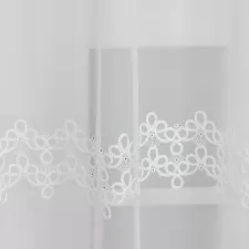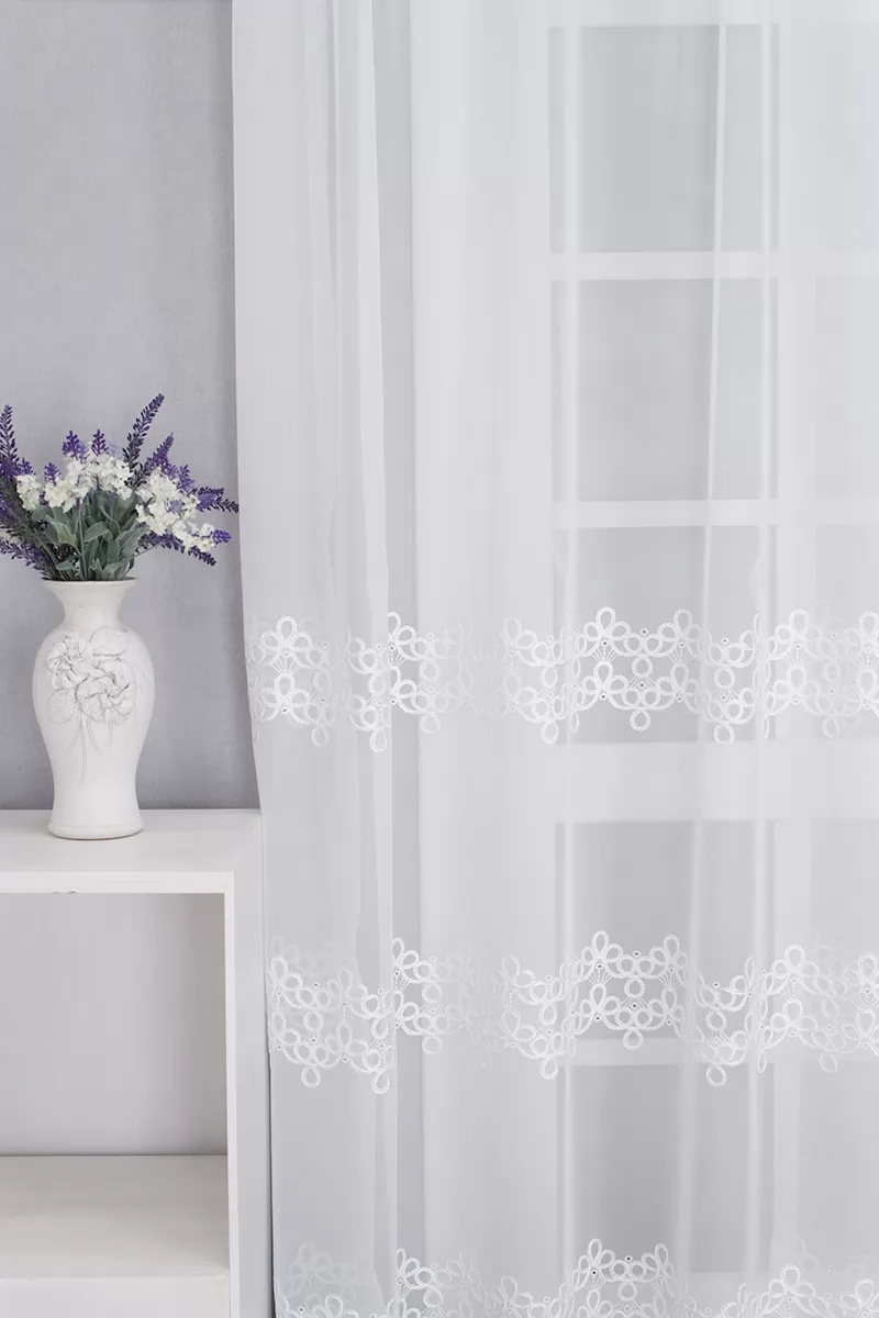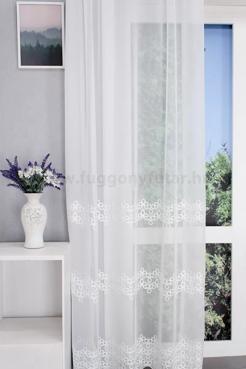 Klasszikus, romantikus stílusú szobákba ajánljuk ezt a bordűrös, tört fehér, voile függönyt. Alul hullámzó hímzés szegélyezi, három sorban 20 cm magas kacskaringós, hímzett, zsinóros indák díszítik. Fölötte két sorban ismétlődik ez a minta, súlyánál fogva jó tartást ad az anyagnak.Teremtsünk romantikus hangulatot szobánkba ezzel a kellemes, virágmintás anyaggal! A virágminták vagy növényi minták mindig is népszerűek voltak a textiltervezők és lakberendezők körében, hiszen barátságossá és természetközelivé teszik otthonunkat. Egyszínű, színben harmonizáló textilekkel kombinálva romantikus stílust és kiegyensúlyozott megjelenést kölcsönözhetünk helyiségünknek. A bézs szín kellemes melegséggel árasztja el szobánkat Ez a meleg, természetes árnyalatú anyag remekül mutat bármilyen térben, amit otthonos, meleg színekkel szeretnénk berendezni. A bézs színű fényáteresztő függönyökhöz általában a sötétbarna, sötétkék, bordó, zöld, narancs, lila és szürke színű sötétítő és dekorfüggönyök illenek legjobban.A megújulás energiája otthonában A tavasz típusú textíliák frissességet, optimizmust és energiát sugároznak. Színvilágukban a zsenge zöldek, a napsárgák, a barackos árnyalatok és a tiszta kékek dominálnak. Ez a stílus tökéletesen illik a dinamikus, vidám személyiségekhez. Anyaga diszkréten simul bele a térbe, miközben kiemeli a helyiség hangulatát. Ideális választás, ha olyan textilt keresünk, amely rugalmasan alkalmazkodik a meglévő bútorokhoz és kiegészítőkhöz.Anyaga: voile Vékony, könnyed, fátyolszerű anyag . Az organzához képest vastagabb szálakból szövik, így kevésbé átlátszó, nehezebben gyűrődik, bár vasalást azért igényel (gőzölős vasalóval viszonylag könnyen, sérülésmentesen vasalható). 1.5x v. 2x-es ráncolással ajánljuk.Normál ablakok függönyözéséhez használható A karnistól a felső szegéshez szükséges anyagot beleszámítva legfeljebb 208 cm hosszú függönyt lehet belőle varrni, ez alatt bármilyen méretben elkészítjük. Méreténél fogva normál méretű ablakok függönyözésére alkalmas. A függöny alsó szegélye hullámos, ólomzsinór nem található benne.