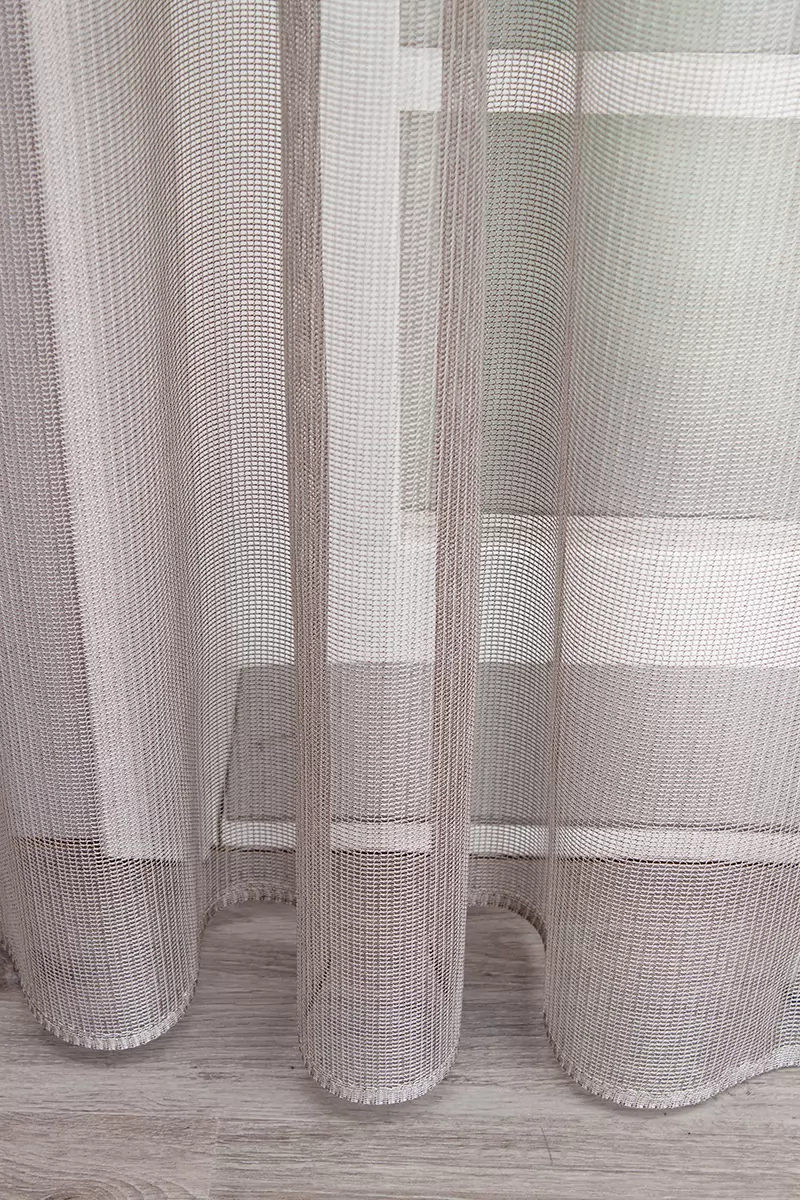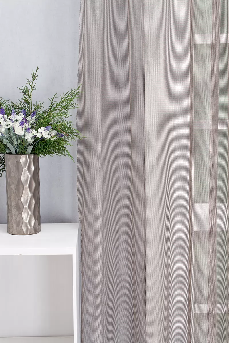 Minimál stílushoz jól illeszthető ez a rendkívül könnyen kezelhető, fényes felületű függöny. A kereszt és hosszanti szálak is többszörösen sodrott, hurkolt erős fonalakból állnak, melyek kiváló tartást, rugalmasságot biztosítanak. Az ezüst és vörösebarna fonalak keveredése gazdag,bronzos hatású fényt varázsol a felületére.