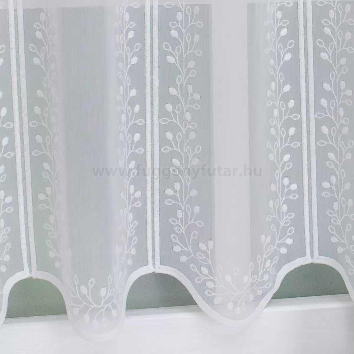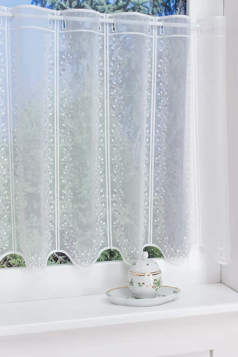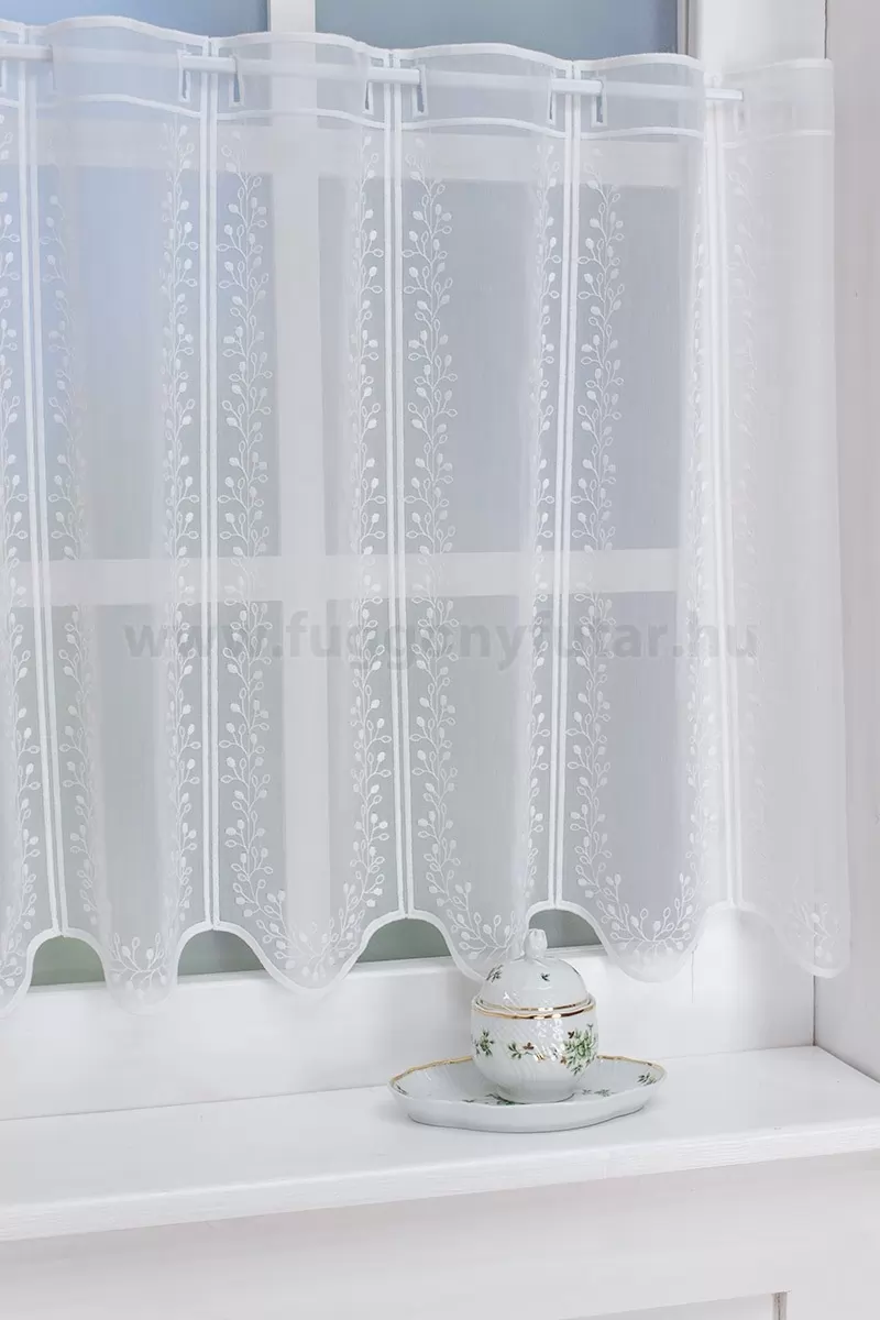 Romantikus, nosztalgikus stílus kedvelőinek ajánljuk ezt a pici virágbimbókkal hímzett,voile vitrázs függönyt. Alul hullámzó szegély zárja. Teremtsünk romantikus hangulatot szobánkba ezzel a kellemes, virágmintás anyaggal! A virágminták vagy növényi minták mindig is népszerűek voltak a textiltervezők és lakberendezők körében, hiszen barátságossá és természetközelivé teszik otthonunkat. Egyszínű, színben harmonizáló textilekkel kombinálva romantikus stílust és kiegyensúlyozott megjelenést kölcsönözhetünk helyiségünknek. A fehér szín légies és világos, fényt hoz a szobába A fehér a világosság és a tisztaság színe, egész nap érezhetjük a friss tavaszi szellő simogatását, ha egy szép fehér függöny díszíti az ablakunkat. A fehér színű fényáteresztő függönyöket bármilyen színű sötétítő függönnyel kombinálhatjuk, de a szoba falának színét mindig vegyük figyelembe.Ez a függöny vintage lakberendezési stílushoz jól illeszthető Ez a függöny tökéletesen illeszkedik a vintage stílus nosztalgiájához. Anyaga diszkréten simul bele a térbe, miközben kiemeli a helyiség hangulatát. Ideális választás, ha olyan textilt keresünk, amely rugalmasan alkalmazkodik a meglévő bútorokhoz és kiegészítőkhöz.A légies elegancia harmóniája A nyár típusú anyagok a kifinomult, hűvös eleganciát képviselik. Színvilágukban a hideg pasztellek, mint a levendula, a menta, a púderrózsaszín és a törtfehérek uralkodnak. Könnyed, szellős anyagaikkal nyugalmat és szofisztikált hangulatot teremtenek. Ideális választás a higgadt, elegáns személyiségeknek. Anyaga diszkréten simul bele a térbe, miközben kiemeli a helyiség hangulatát. Ideális választás, ha olyan textilt keresünk, amely rugalmasan alkalmazkodik a meglévő bútorokhoz és kiegészítőkhöz.Anyaga: sablé Változó vastagságú szálakból szőtt anyag. Kevésbé hajlamos a gyűrődésre , mint a voile. 1.5x-es ráncolással ajánljuk.Vitrázsrudakhoz alkalmas függöny A függöny 60 cm magas. Méreténél fogva ún. kávéházi vagy vitrázs függgönyként használható, az ablak egy részének takarására alkalmas. A függöny alsó szegélye hullámos, ólomzsinór nem található benne.