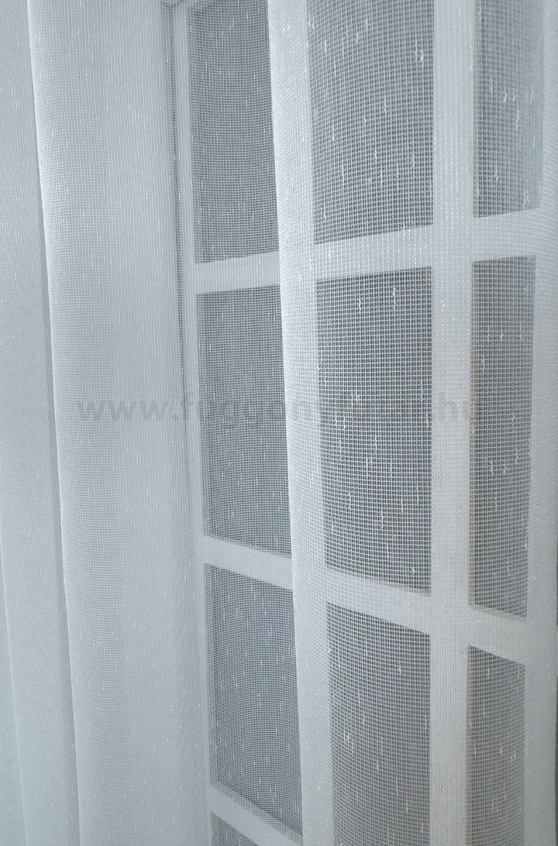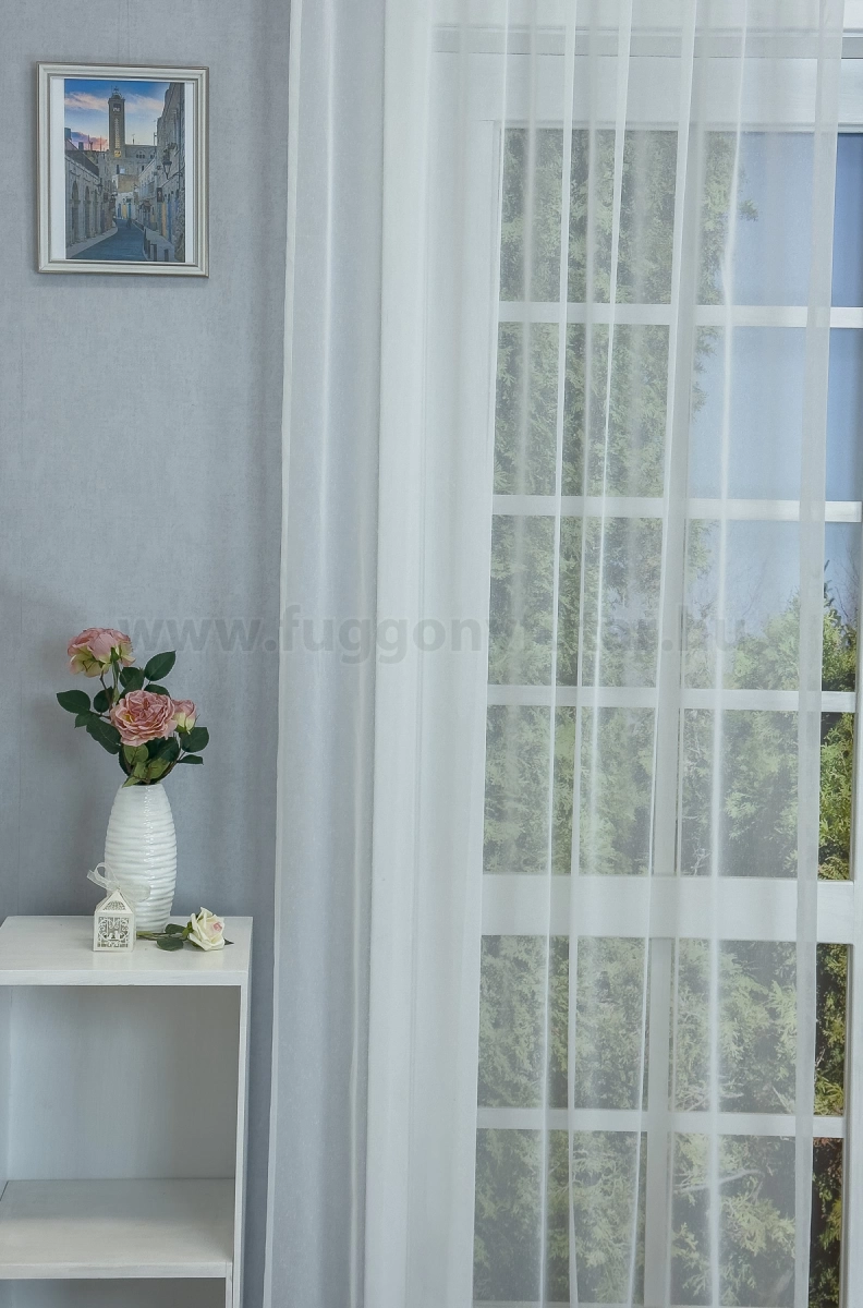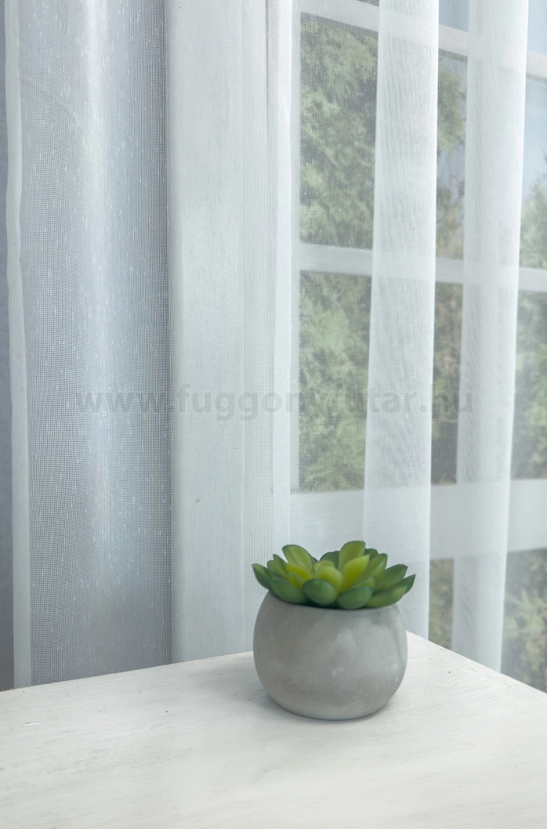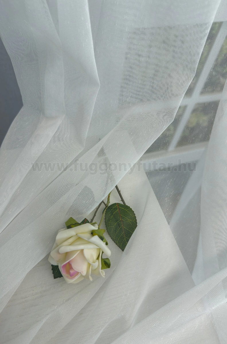 A szórt mintás anyagok izgalmas felülete bármely helyiségben jól mutat Az anyag teljes felületén elszórtan megjelenő ritkább-sűrűbb szálbeszövések izgalmas felületet hoznak létre. Bármilyen, színben harmonizáló, mintás anyagot remekül párosíthatunk hozzá. A fehér szín légies és világos, fényt hoz a szobába A fehér a világosság és a tisztaság színe, egész nap érezhetjük a friss tavaszi szellő simogatását, ha egy szép fehér függöny díszíti az ablakunkat. A fehér színű fényáteresztő függönyöket bármilyen színű sötétítő függönnyel kombinálhatjuk, de a szoba falának színét mindig vegyük figyelembe.Ez a függöny többféle lakberendezési stílushoz is jól illeszthető Ez a függöny több lakberendezési irányzathoz is tökéletesen illeszkedik – legyen szó a skandináv egyszerűségről, a mediterrán könnyedségről, a klasszikus eleganciáról, a minimál letisztultságról vagy az industrial stílus karakteréről. Anyaga diszkréten simul bele a térbe, miközben kiemeli a helyiség hangulatát. Ideális választás, ha olyan textilt keresünk, amely rugalmasan alkalmazkodik a meglévő bútorokhoz és kiegészítőkhöz.A légies elegancia harmóniája A nyár típusú anyagok a kifinomult, hűvös eleganciát képviselik. Színvilágukban a hideg pasztellek, mint a levendula, a menta, a púderrózsaszín és a törtfehérek uralkodnak. Könnyed, szellős anyagaikkal nyugalmat és szofisztikált hangulatot teremtenek. Ideális választás a higgadt, elegáns személyiségeknek. Anyaga diszkréten simul bele a térbe, miközben kiemeli a helyiség hangulatát. Ideális választás, ha olyan textilt keresünk, amely rugalmasan alkalmazkodik a meglévő bútorokhoz és kiegészítőkhöz.Anyaga: sablé Változó vastagságú szálakból szőtt anyag. Kevésbé hajlamos a gyűrődésre , mint a voile. 1.5x-es ráncolással ajánljuk.Terasz ajtókhoz, nagyobb ablakok függönyözéséhez jól használható A karnistól a felső szegéshez szükséges anyagot beleszámítva legfeljebb 298 cm hosszú függönyt lehet belőle varrni, ez alatt bármilyen méretben elkészítjük. Méreténél fogva alkalmas lehet terasz- és erkélyajtók, nagy belmagasságú helyiségek valamint normál ablakok függönyözésére is. A függöny aljába gyárilag varrt ólomzsinór megfelelő esést kölcsönöz a függönynek, megakadályozza az indokolatlan fellebbenést és az apróbb ráncokat is kisimítja.Vasalást kevésbé igénylő anyag Az anyag kevesebb vasalást igényel, mint az átlag függöny. Sokszor elég, ha mosás után még nedvesen a helyükre akasztjuk, így kilógva magát a ráncok kisimulnak és a függönyünk teljes pompájában ragyog!