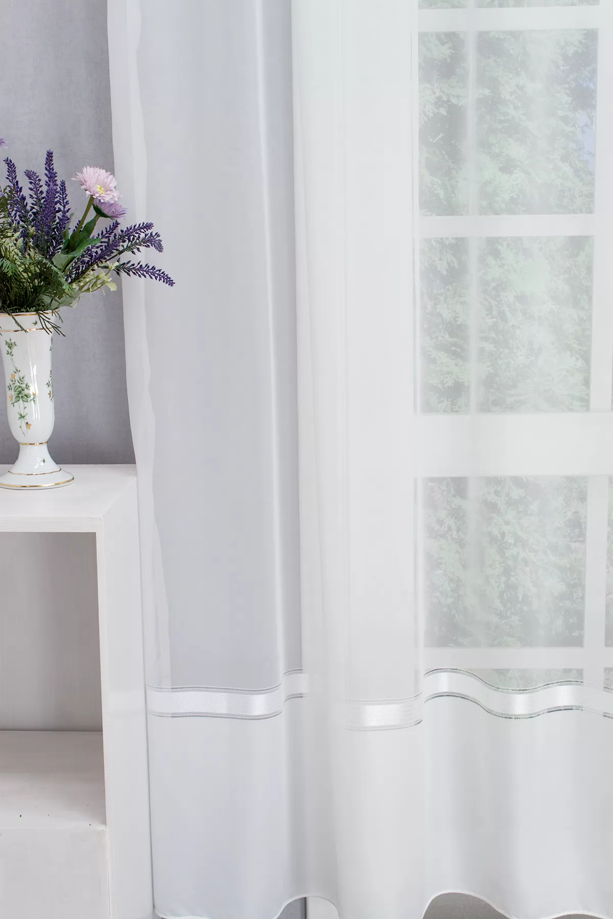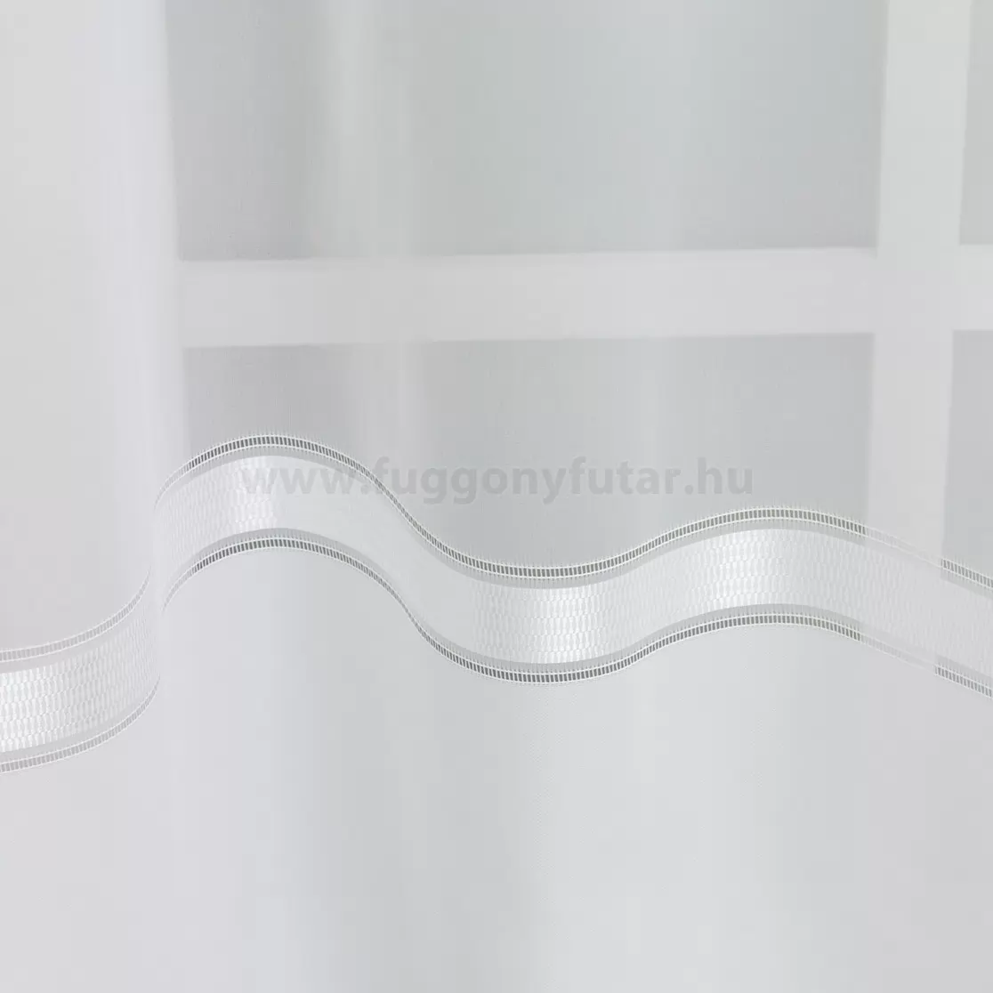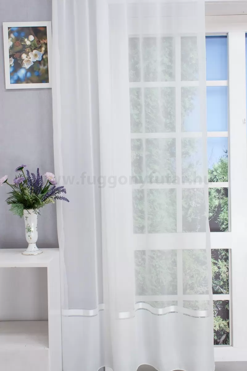 Egyszerű, elegáns, sokféle stílushoz illeszthető ez a fehér színű voile függöny. Könnyű anyaga nem zavarja a kilátást, alul a 30 cm nagyságú, vastagabb, dupla anyagú bordűr ad kellő súlyt, tartást.