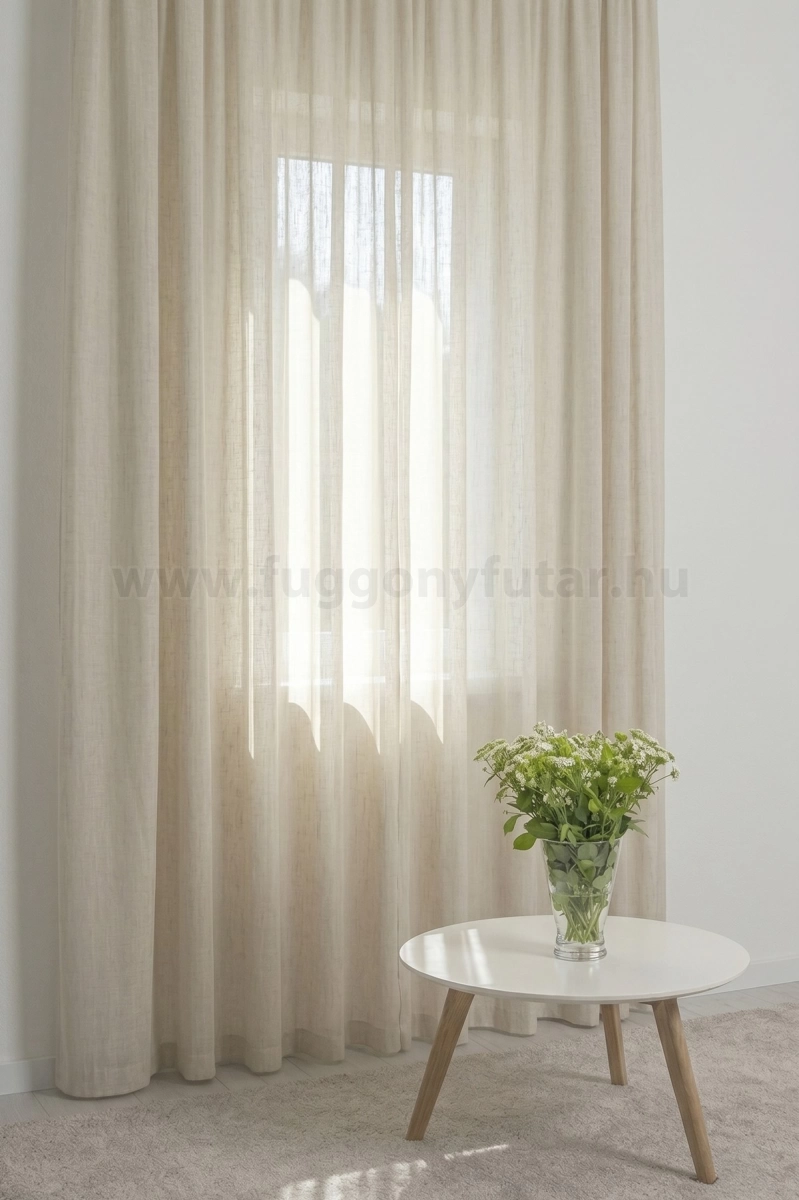 A szórt mintás anyagok izgalmas felülete bármely helyiségben jól mutat Az anyag teljes felületén elszórtan megjelenő ritkább-sűrűbb szálbeszövések izgalmas felületet hoznak létre. Bármilyen, színben harmonizáló, mintás anyagot remekül párosíthatunk hozzá. A bézs szín kellemes melegséggel árasztja el szobánkat Ez a meleg, természetes árnyalatú anyag remekül mutat bármilyen térben, amit otthonos, meleg színekkel szeretnénk berendezni. A bézs színű fényáteresztő függönyökhöz általában a sötétbarna, sötétkék, bordó, zöld, narancs, lila és szürke színű sötétítő és dekorfüggönyök illenek legjobban.Ez a függöny többféle lakberendezési stílushoz is jól illeszthető Ez a függöny több lakberendezési irányzathoz is tökéletesen illeszkedik – legyen szó a mediterrán könnyedségről, a klasszikus eleganciáról, a minimál letisztultságról, a vintage nosztalgiáról vagy a skandináv egyszerűségről. Anyaga diszkréten simul bele a térbe, miközben kiemeli a helyiség hangulatát. Ideális választás, ha olyan textilt keresünk, amely rugalmasan alkalmazkodik a meglévő bútorokhoz és kiegészítőkhöz.Anyaga: sablé Változó vastagságú szálakból szőtt anyag. Kevésbé hajlamos a gyűrődésre , mint a voile. 1.5x-es ráncolással ajánljuk.Terasz ajtókhoz, nagyobb ablakok függönyözéséhez jól használható A karnistól a felső szegéshez szükséges anyagot beleszámítva legfeljebb 288 cm hosszú függönyt lehet belőle varrni, ez alatt bármilyen méretben elkészítjük. Méreténél fogva alkalmas lehet terasz- és erkélyajtók, nagy belmagasságú helyiségek valamint normál ablakok függönyözésére is. A függöny aljába gyárilag varrt ólomzsinór megfelelő esést kölcsönöz a függönynek, megakadályozza az indokolatlan fellebbenést és az apróbb ráncokat is kisimítja.