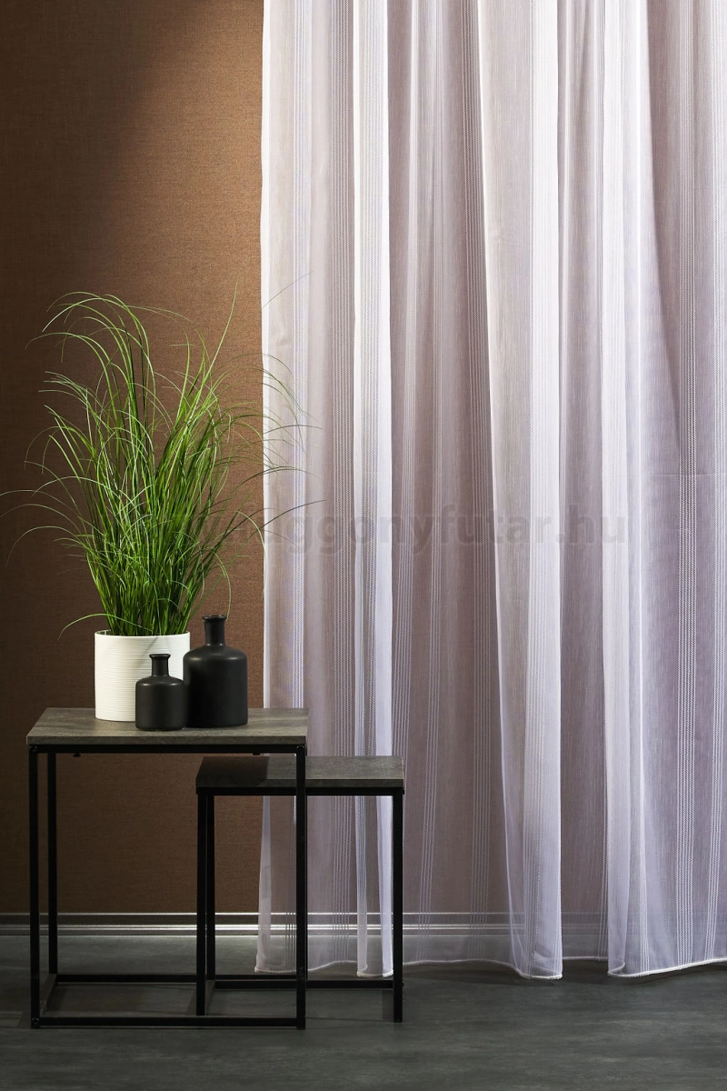 A függőleges csíkok izgalmassá teszik a teret Az ilyen függőleges csíkozású anyagokhoz válasszunk egyszínű, szórt vagy virágmintás sötétítőt. Ez a mintázat optikailag nyújtja a teret. A fehér szín légies és világos, fényt hoz a szobába A fehér a világosság és a tisztaság színe, egész nap érezhetjük a friss tavaszi szellő simogatását, ha egy szép fehér függöny díszíti az ablakunkat. A fehér színű fényáteresztő függönyöket bármilyen színű sötétítő függönnyel kombinálhatjuk, de a szoba falának színét mindig vegyük figyelembe.Ez a függöny skandináv lakberendezési stílushoz jól illeszthető Ez a függöny tökéletesen illeszkedik a skandináv stílus egyszerűséghez. Anyaga diszkréten simul bele a térbe, miközben kiemeli a helyiség hangulatát. Ideális választás, ha olyan textilt keresünk, amely rugalmasan alkalmazkodik a meglévő bútorokhoz és kiegészítőkhöz.Drámai és luxus hatás A tél típusú anyagok merészek, elegánsak és egy csipetnyi drámát visznek a térbe. Színvilágukban az éles kontrasztok és a mély, gazdag ékszertónusok dominálnak, mint a smaragdzöld, a zafírkék, a rubinvörös, kiegészítve a feketével, fehérrel és fémes csillogással. Ideális a magabiztos, kifinomult személyiségeknek. Anyaga diszkréten simul bele a térbe, miközben kiemeli a helyiség hangulatát. Ideális választás, ha olyan textilt keresünk, amely rugalmasan alkalmazkodik a meglévő bútorokhoz és kiegészítőkhöz.Anyaga: sablé Változó vastagságú szálakból szőtt anyag. Kevésbé hajlamos a gyűrődésre , mint a voile. 1.5x-es ráncolással ajánljuk.Terasz ajtókhoz, nagyobb ablakok függönyözéséhez jól használható A karnistól a felső szegéshez szükséges anyagot beleszámítva legfeljebb 298 cm hosszú függönyt lehet belőle varrni, ez alatt bármilyen méretben elkészítjük. Méreténél fogva alkalmas lehet terasz- és erkélyajtók, nagy belmagasságú helyiségek valamint normál ablakok függönyözésére is. A függöny aljába gyárilag varrt ólomzsinór megfelelő esést kölcsönöz a függönynek, megakadályozza az indokolatlan fellebbenést és az apróbb ráncokat is kisimítja.