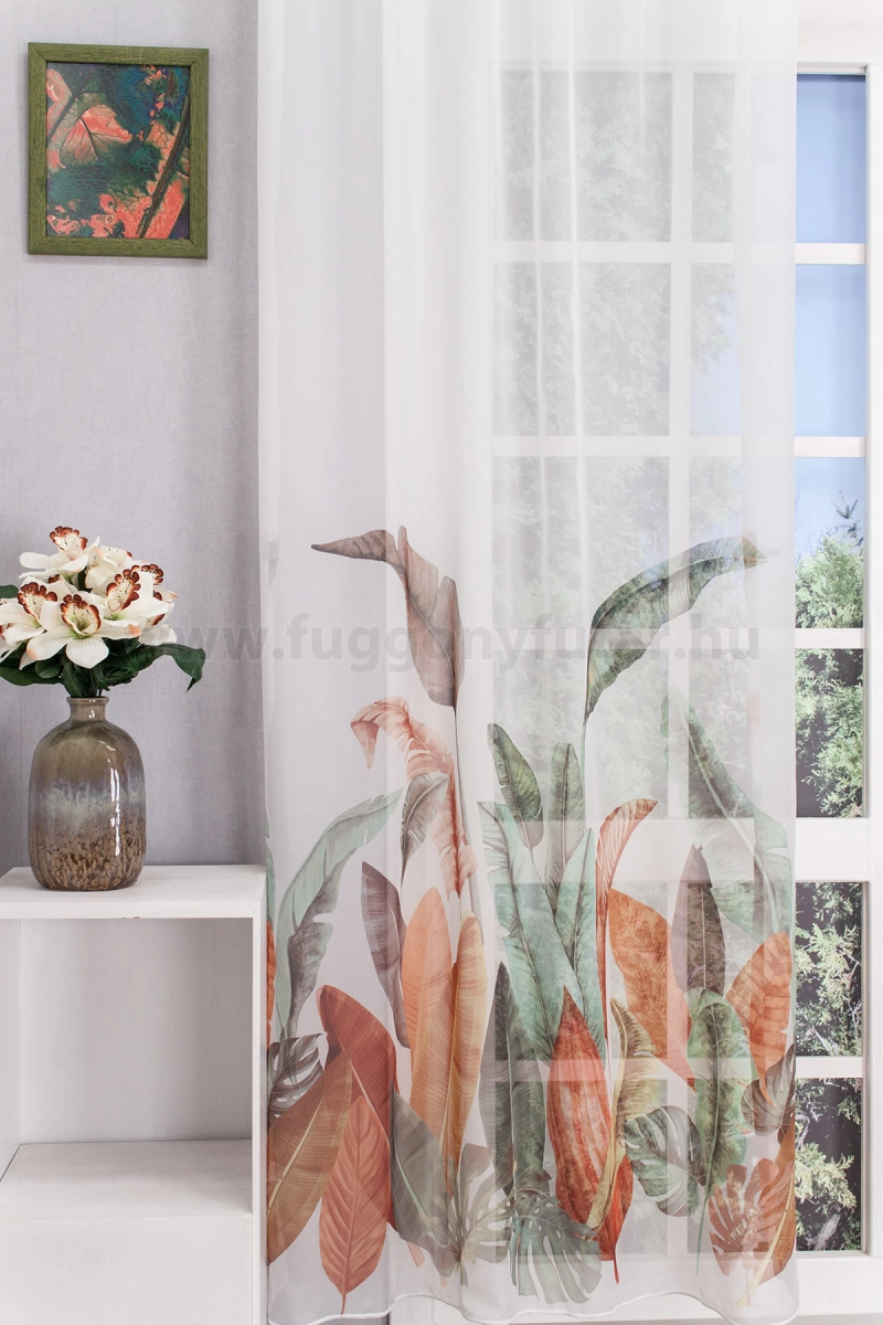 Blanche - Zöld, rozsdabarna leveles, dzsungel mintás voile függöny, ólomzsinóros, 295 cm - egyedi méretre varrjuk!