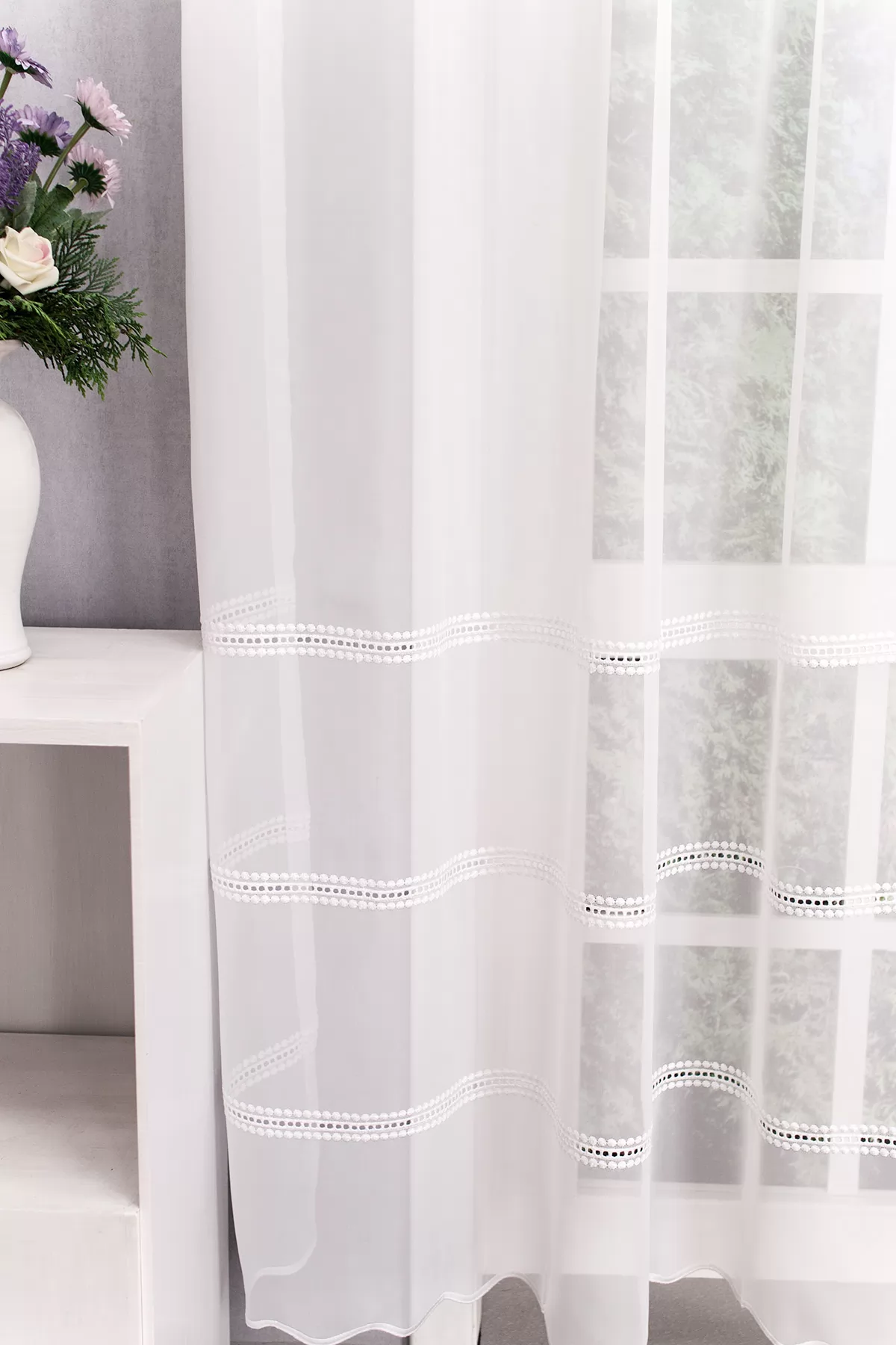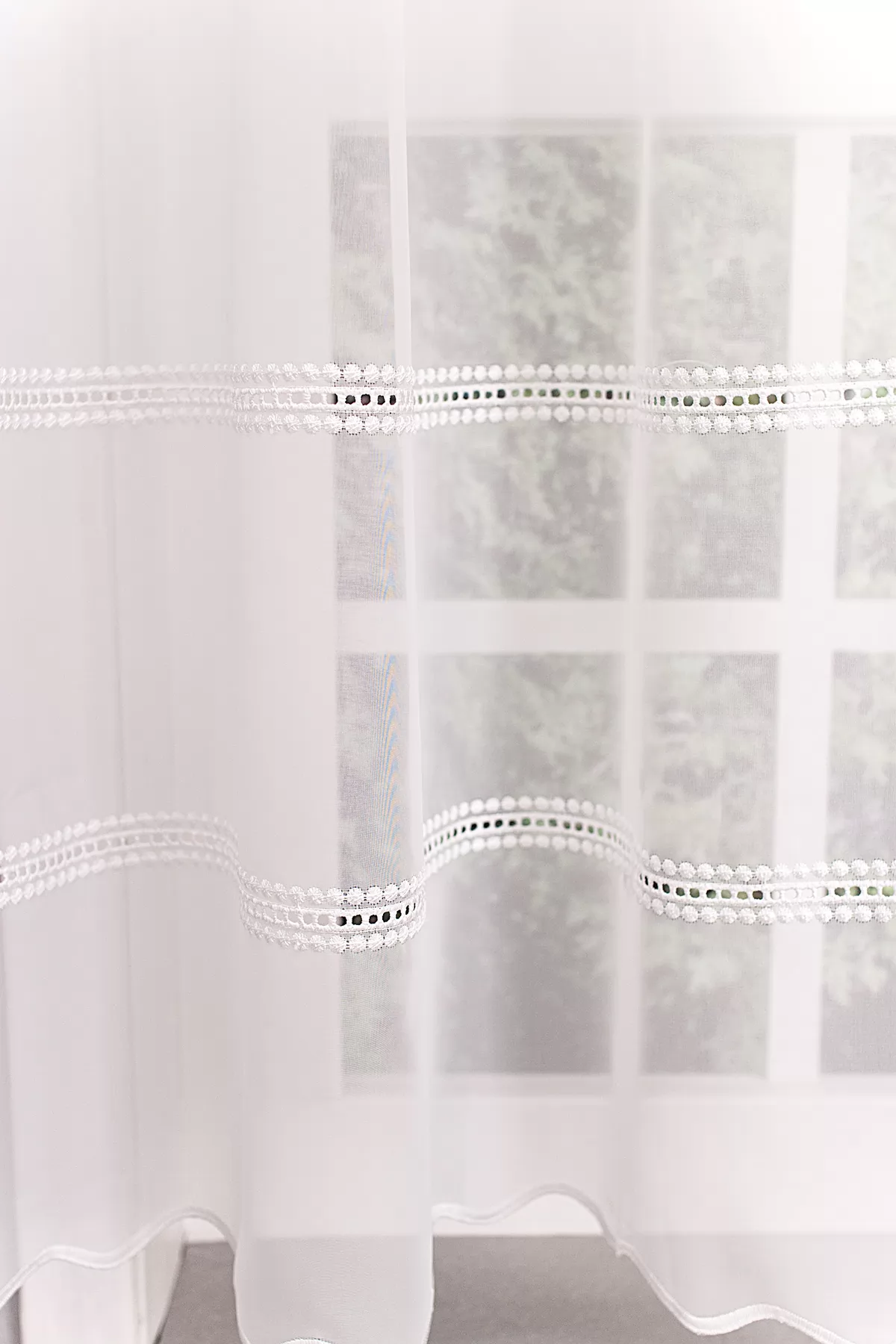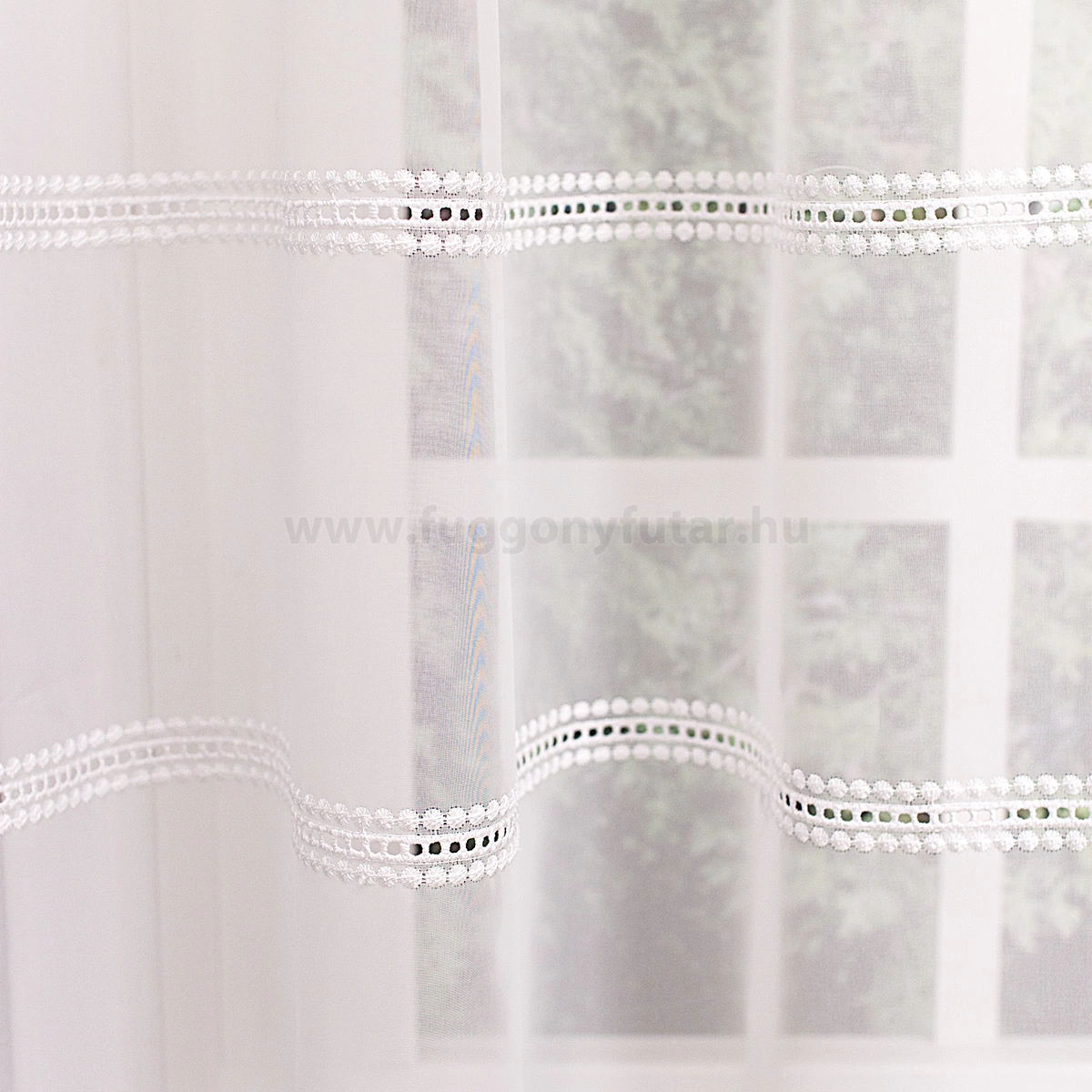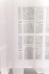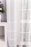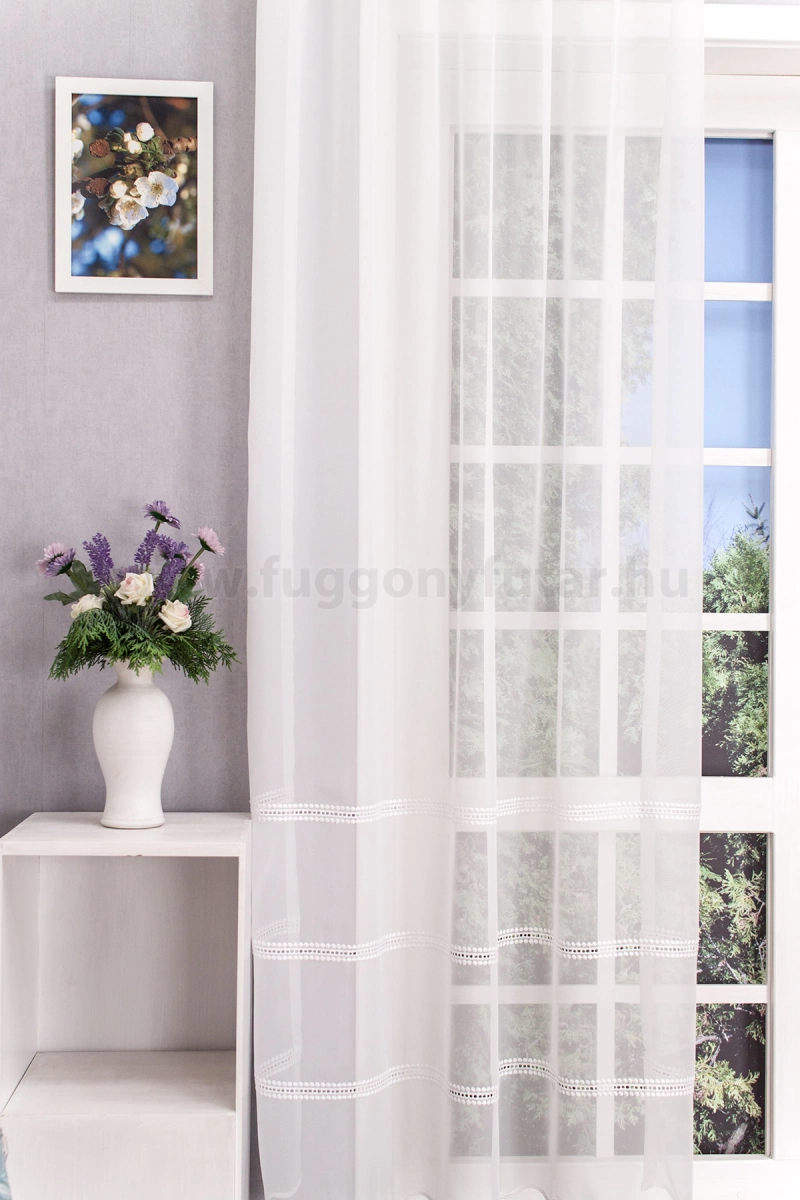 Hagyományos és a modern berendezésekhez is illik ez a fehér, lyukhímzéses voile függöny. Régi kézimunkákra emlékeztető díszítés módja otthonos hangulatot varázsol a szobába, étkezőbe. A vízszintes csíkok izgalmassá teszik a teret Az ilyen vízszintes csíkozású anyagokhoz válasszunk egyszínű, szórt vagy virágmintás sötétítőt. Ez a mintázat optikailag szélesíti a teret. A fehér szín légies és világos, fényt hoz a szobába A fehér a világosság és a tisztaság színe, egész nap érezhetjük a friss tavaszi szellő simogatását, ha egy szép fehér függöny díszíti az ablakunkat. A fehér színű fényáteresztő függönyöket bármilyen színű sötétítő függönnyel kombinálhatjuk, de a szoba falának színét mindig vegyük figyelembe.Ez a függöny skandináv lakberendezési stílushoz jól illeszthető Ez a függöny tökéletesen illeszkedik a skandináv stílus egyszerűséghez. Anyaga diszkréten simul bele a térbe, miközben kiemeli a helyiség hangulatát. Ideális választás, ha olyan textilt keresünk, amely rugalmasan alkalmazkodik a meglévő bútorokhoz és kiegészítőkhöz.Anyaga: voile Vékony, könnyed, fátyolszerű anyag . Az organzához képest vastagabb szálakból szövik, így kevésbé átlátszó, nehezebben gyűrődik, bár vasalást azért igényel (gőzölős vasalóval viszonylag könnyen, sérülésmentesen vasalható). 1.5x v. 2x-es ráncolással ajánljuk.Terasz ajtókhoz, nagyobb ablakok függönyözéséhez jól használható A karnistól a felső szegéshez szükséges anyagot beleszámítva legfeljebb 288 cm hosszú függönyt lehet belőle varrni, ez alatt bármilyen méretben elkészítjük. Méreténél fogva alkalmas lehet terasz- és erkélyajtók, nagy belmagasságú helyiségek valamint normál ablakok függönyözésére is. A függöny alsó szegélye hullámos, ólomzsinór nem található benne.