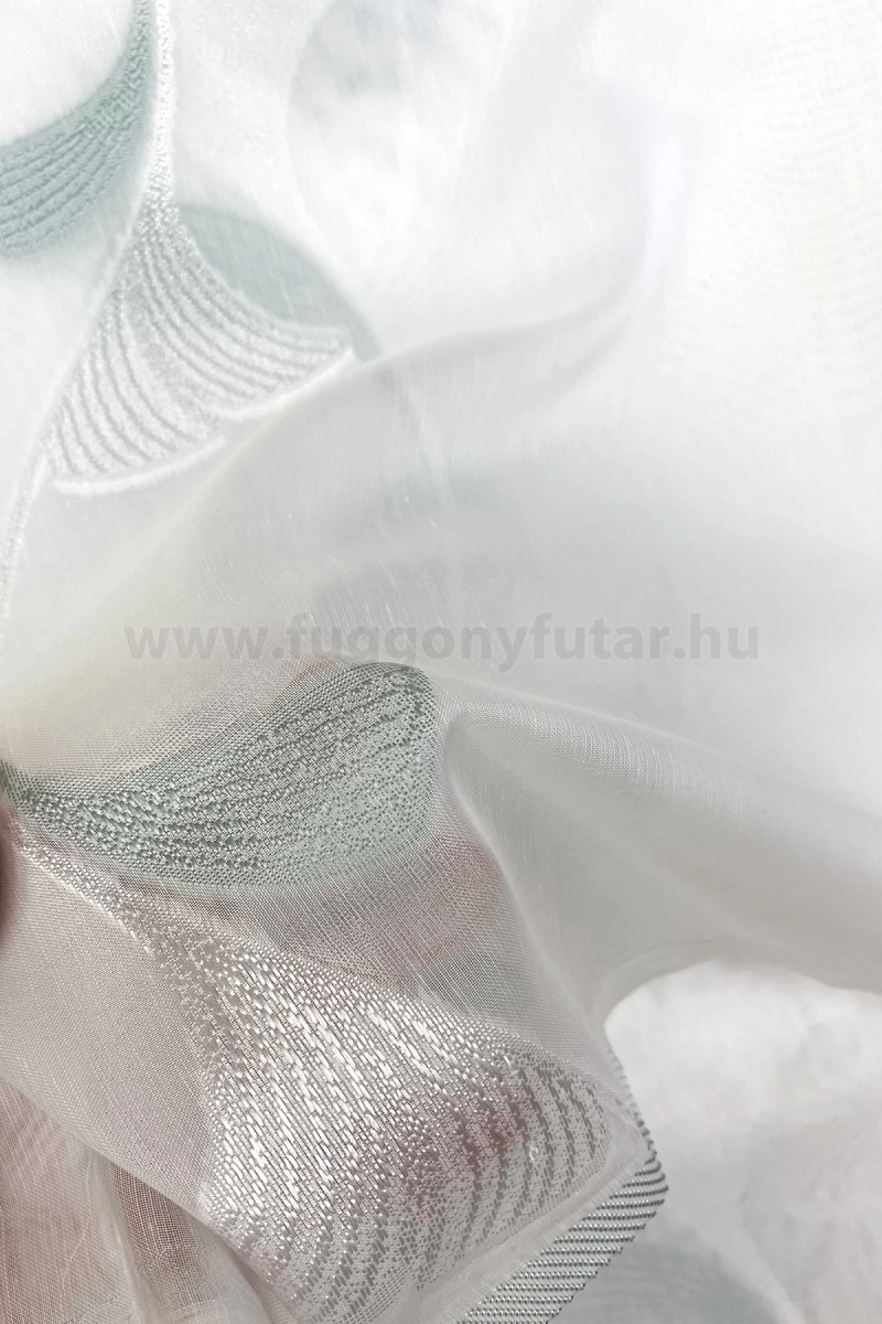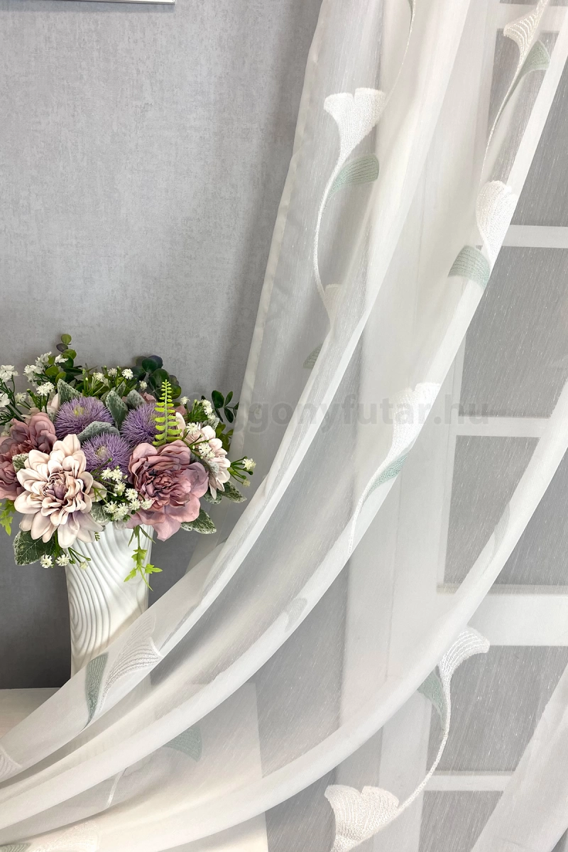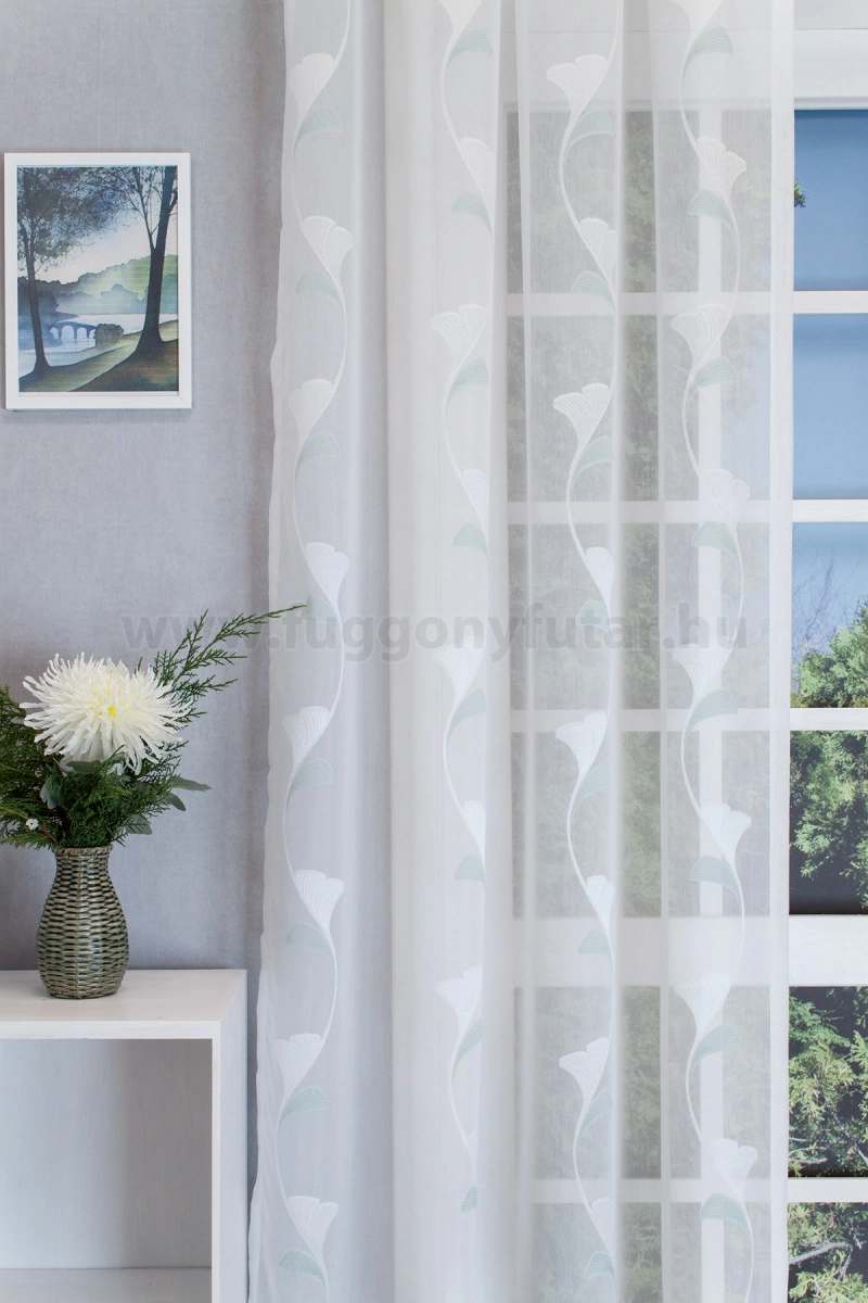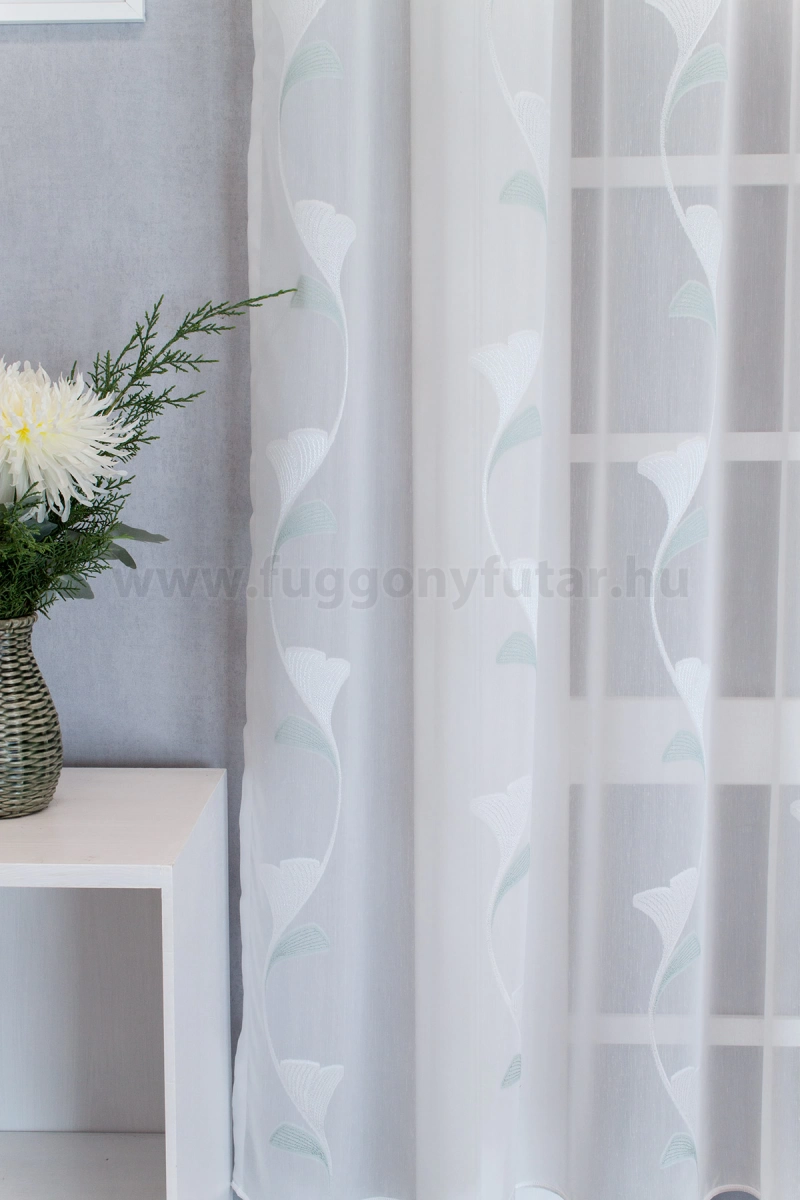 Elegáns hatású ez a finom tapintású fehér sable függöny. Kecsesen hajladozó indák díszítik, fehér, mentazöld színű, selymes fényű páfrányfenyő levelek szép rajzolatával. Alul ólomzsinór biztosít kellő tartást. Kímélő mosás után helyére akasztva szárítható, gőzölős vasalóval simítható. Teremtsünk romantikus hangulatot szobánkba ezzel a kellemes, növényi mintás anyaggal! A növényi minták mindig is népszerűek voltak a textiltervezők és lakberendezők körében, hiszen barátságossá és természetközelivé teszik otthonunkat. Egyszínű, színben harmonizáló textilekkel kombinálva romantikus stílust és kiegyensúlyozott megjelenést kölcsönözhetünk helyiségünknek. Tengert idéző türkiz Ez a tengert idéző kékeszöld árnyalatú anyag stílusos megjelenést ad bármelyik helyiségnek. Semleges meleg színnel vagy pasztell színekkel párosítva divatos színkombinációkat kreálhatunk. A türkiz mintás fényáteresztő függönyökhöz általában a hasonló tónusú türkiz, zöld, kék, sötétkék, sárga, fekete és szürke színű sötétítő és dekorfüggönyök illenek legjobban.A légies elegancia harmóniája A nyár típusú anyagok a kifinomult, hűvös eleganciát képviselik. Színvilágukban a hideg pasztellek, mint a levendula, a menta, a púderrózsaszín és a törtfehérek uralkodnak. Könnyed, szellős anyagaikkal nyugalmat és szofisztikált hangulatot teremtenek. Ideális választás a higgadt, elegáns személyiségeknek. Anyaga diszkréten simul bele a térbe, miközben kiemeli a helyiség hangulatát. Ideális választás, ha olyan textilt keresünk, amely rugalmasan alkalmazkodik a meglévő bútorokhoz és kiegészítőkhöz.Anyaga: sablé Változó vastagságú szálakból szőtt anyag. Kevésbé hajlamos a gyűrődésre , mint a voile. 1.5x-es ráncolással ajánljuk.Normál ablakok függönyözéséhez használható A karnistól a felső szegéshez szükséges anyagot beleszámítva legfeljebb 178 cm hosszú függönyt lehet belőle varrni, ez alatt bármilyen méretben elkészítjük. Méreténél fogva normál méretű ablakok függönyözésére alkalmas. A függöny aljába gyárilag varrt ólomzsinór megfelelő esést kölcsönöz a függönynek, megakadályozza az indokolatlan fellebbenést és az apróbb ráncokat is kisimítja.