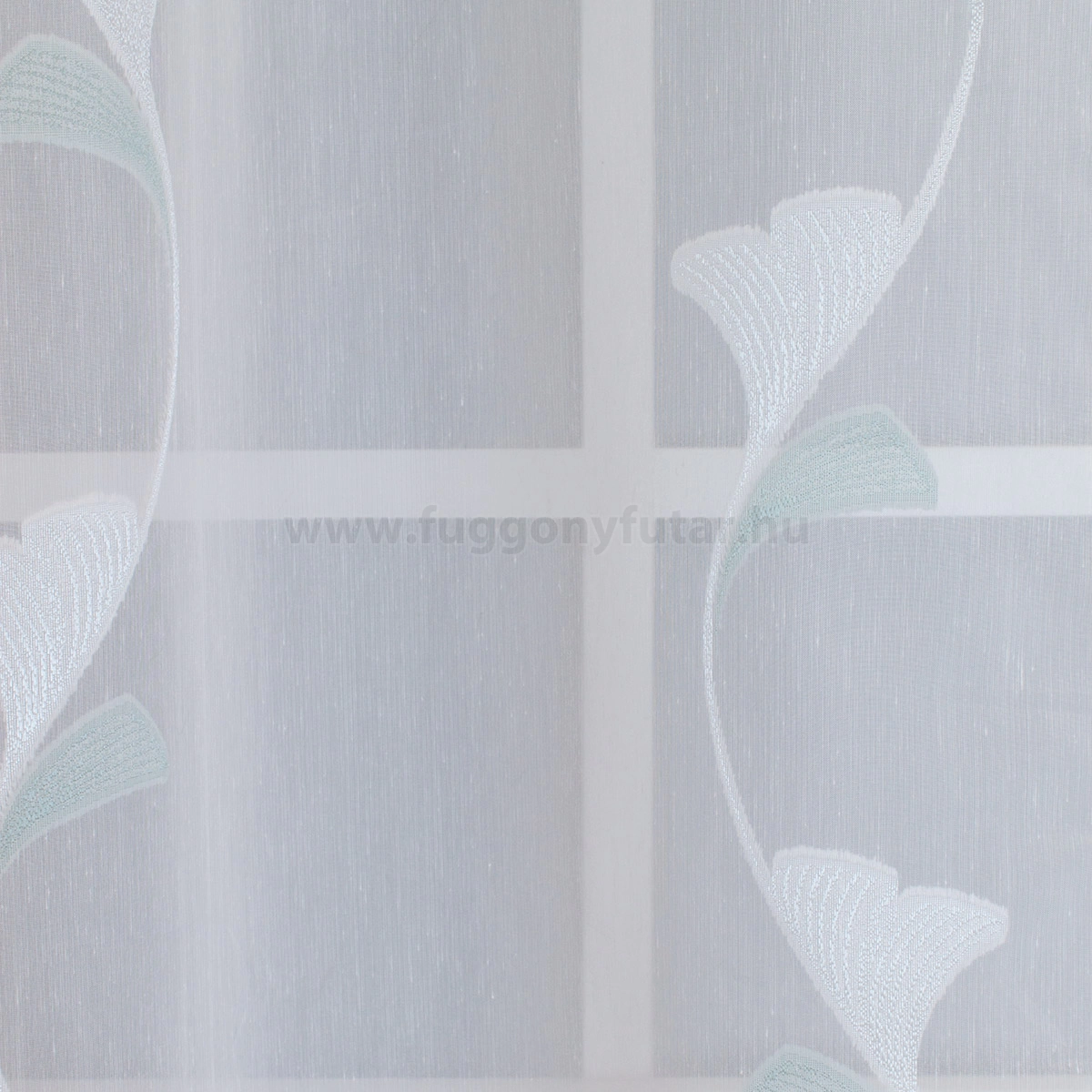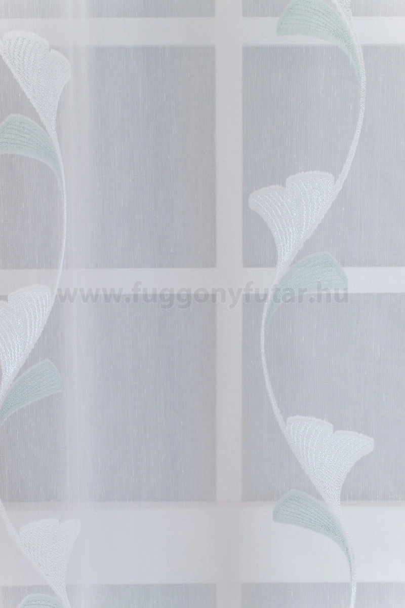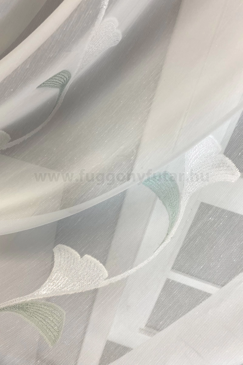 Dolly – Fehér alapon fehér, mentazöld színű, indamintás, páfrányfenyős sablé függöny, ólomzsinóros, 180 cm - egyedi méretre varrjuk! KIFUTÓ MODELL!
