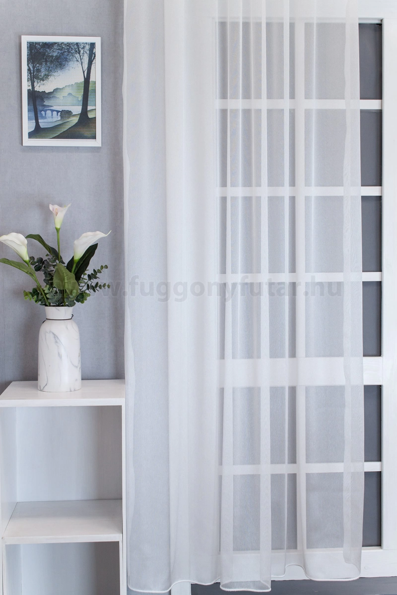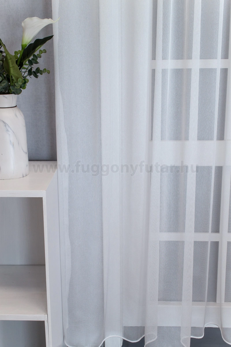A minta nélküli anyagok univerzálisak, jól passzolnak bármihez A minta nélküli anyagokhoz bármilyen színben harmonizáló mintás anyagot, tapétát remekül párosíthatunk. A fehér szín légies és világos, fényt hoz a szobába A fehér a világosság és a tisztaság színe, egész nap érezhetjük a friss tavaszi szellő simogatását, ha egy szép fehér függöny díszíti az ablakunkat. A fehér színű fényáteresztő függönyöket bármilyen színű sötétítő függönnyel kombinálhatjuk, de a szoba falának színét mindig vegyük figyelembe.Ez a függöny többféle lakberendezési stílushoz is jól illeszthető Ez a függöny több lakberendezési irányzathoz is tökéletesen illeszkedik – legyen szó a minimál letisztultságról, a skandináv egyszerűségről, a mediterrán könnyedségről vagy a klasszikus eleganciáról. Anyaga diszkréten simul bele a térbe, miközben kiemeli a helyiség hangulatát. Ideális választás, ha olyan textilt keresünk, amely rugalmasan alkalmazkodik a meglévő bútorokhoz és kiegészítőkhöz.Anyaga: sablé Változó vastagságú szálakból szőtt anyag. Kevésbé hajlamos a gyűrődésre , mint a voile. 1.5x-es ráncolással ajánljuk.Terasz ajtókhoz, nagyobb ablakok függönyözéséhez jól használható A karnistól a felső szegéshez szükséges anyagot beleszámítva legfeljebb 283 cm hosszú függönyt lehet belőle varrni, ez alatt bármilyen méretben elkészítjük. Méreténél fogva alkalmas lehet terasz- és erkélyajtók, nagy belmagasságú helyiségek valamint normál ablakok függönyözésére is. A függöny aljába gyárilag varrt ólomzsinór megfelelő esést kölcsönöz a függönynek, megakadályozza az indokolatlan fellebbenést és az apróbb ráncokat is kisimítja.