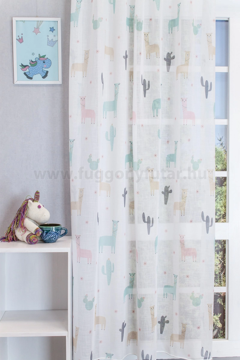 Iskolás gyerekek szobáját Dél-Amerikába varázsolja, kaktuszok, lámák közé., Világoszöld, bézs színeivel nyugtató hangulatot áraszt. Alul ólomzsinór biztosít kellő tartást.Tetrasablet anyaga jól kezelhető. Kímélő mosás után helyére akasztva szárítható, gőzölős vasalóval simítható. Egy mintás anyag a legegyszerűbb szobát is dekoratívvá varázsolja Dobjuk fel a szobánkat vagy konyhánkat egy különleges, mintás függönnyel! A zsúfoltság elkerülése érdekében egyszínű, minta nélküli fallal, illetve más textilekkel kombináljuk. Hozza közel a természetet a zöld szín segítségével! Friss és természetközeli szín. A természetet, az újrakezdést és az egészséget szimbolizálja. Segít frissen és harmonikusan tartani a szobát. Használjuk a konyhában és a közösségi terekben. A zöld mintás fényáteresztő függönyökhöz általában a sötétbarna, zöld, bézs, ekrü és sárga színű sötétítő és dekorfüggönyök illenek legjobban.A megújulás energiája otthonában A tavasz típusú textíliák frissességet, optimizmust és energiát sugároznak. Színvilágukban a zsenge zöldek, a napsárgák, a barackos árnyalatok és a tiszta kékek dominálnak. Ez a stílus tökéletesen illik a dinamikus, vidám személyiségekhez. Anyaga diszkréten simul bele a térbe, miközben kiemeli a helyiség hangulatát. Ideális választás, ha olyan textilt keresünk, amely rugalmasan alkalmazkodik a meglévő bútorokhoz és kiegészítőkhöz.Anyaga: sablé Változó vastagságú szálakból szőtt anyag. Kevésbé hajlamos a gyűrődésre , mint a voile. 1.5x-es ráncolással ajánljuk.Terasz ajtókhoz, nagyobb ablakok függönyözéséhez jól használható A karnistól a felső szegéshez szükséges anyagot beleszámítva legfeljebb 298 cm hosszú függönyt lehet belőle varrni, ez alatt bármilyen méretben elkészítjük. Méreténél fogva alkalmas lehet terasz- és erkélyajtók, nagy belmagasságú helyiségek valamint normál ablakok függönyözésére is. A függöny aljába gyárilag varrt ólomzsinór megfelelő esést kölcsönöz a függönynek, megakadályozza az indokolatlan fellebbenést és az apróbb ráncokat is kisimítja.Vasalást kevésbé igénylő anyag Az anyag kevesebb vasalást igényel, mint az átlag függöny. Sokszor elég, ha mosás után még nedvesen a helyükre akasztjuk, így kilógva magát a ráncok kisimulnak és a függönyünk teljes pompájában ragyog!