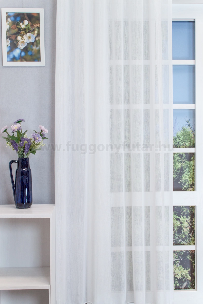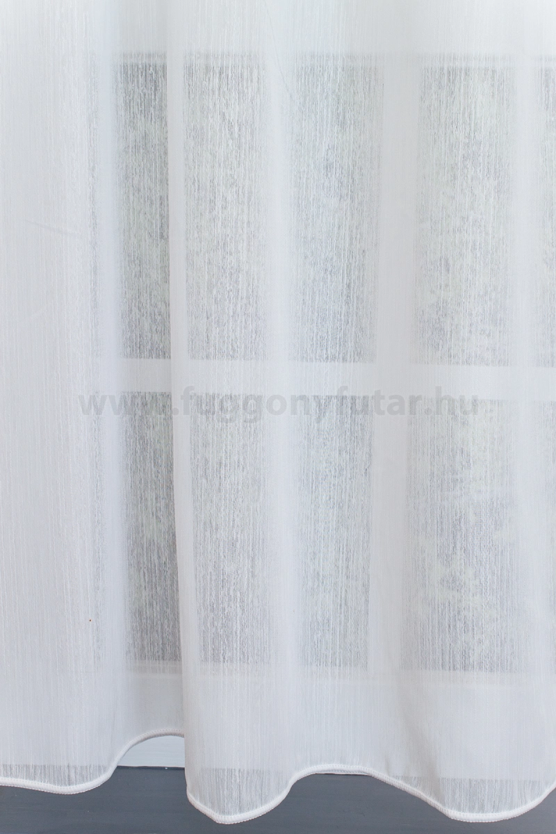 Ha nagyobb felületre gazdaságos, könnyen kezelhető, tartós függönyt szeretne, akkor ez a fehér sablet függöny jó választás. Függőleges irányban erősebb, sodrott fonalak adnak kellő tartást, és cirkás mintázatot. Alul ólomzsinór szegélyezi. Kímélő mosás után helyére akasztva szárítható, gőzölős vasalóval simítható. A szórt mintás anyagok izgalmas felülete bármely helyiségben jól mutat Az anyag teljes felületén elszórtan megjelenő ritkább-sűrűbb szálbeszövések izgalmas felületet hoznak létre. Bármilyen, színben harmonizáló, mintás anyagot remekül párosíthatunk hozzá. A fehér szín légies és világos, fényt hoz a szobába  A fehér a világosság és a tisztaság színe, egész nap érezhetjük a friss tavaszi szellő simogatását, ha egy szép fehér függöny díszíti az ablakunkat.Ez a függöny többféle lakberendezési stílushoz is jól illeszthető Ez a függöny több lakberendezési irányzathoz is tökéletesen illeszkedik – legyen szó a minimál letisztultságról, a skandináv egyszerűségről vagy a klasszikus eleganciáról. Anyaga diszkréten simul bele a térbe, miközben kiemeli a helyiség hangulatát. Ideális választás, ha olyan textilt keresünk, amely rugalmasan alkalmazkodik a meglévő bútorokhoz és kiegészítőkhöz.A légies elegancia harmóniája  A nyár típusú anyagok  a kifinomult, hűvös eleganciát képviselik. Színvilágukban a hideg pasztellek, mint a levendula, a menta, a púderrózsaszín és a törtfehérek uralkodnak. Könnyed, szellős anyagaikkal nyugalmat és szofisztikált hangulatot teremtenek. Ideális választás a higgadt, elegáns személyiségeknek. Anyaga diszkréten simul bele a térbe, miközben kiemeli a helyiség hangulatát. Ideális választás, ha olyan textilt keresünk, amely rugalmasan alkalmazkodik a meglévő bútorokhoz és kiegészítőkhöz.Anyaga: sablé Változó vastagságú szálakból szőtt anyag. Kevésbé hajlamos a gyűrődésre , mint a voile. 1.5x-es ráncolással ajánljuk.Terasz ajtókhoz, nagyobb ablakok függönyözéséhez jól használható A karnistól a felső szegéshez szükséges anyagot beleszámítva legfeljebb 298 cm hosszú függönyt lehet belőle varrni, ez alatt bármilyen méretben elkészítjük. Méreténél fogva alkalmas lehet terasz- és erkélyajtók, nagy belmagasságú helyiségek valamint normál ablakok függönyözésére  is.