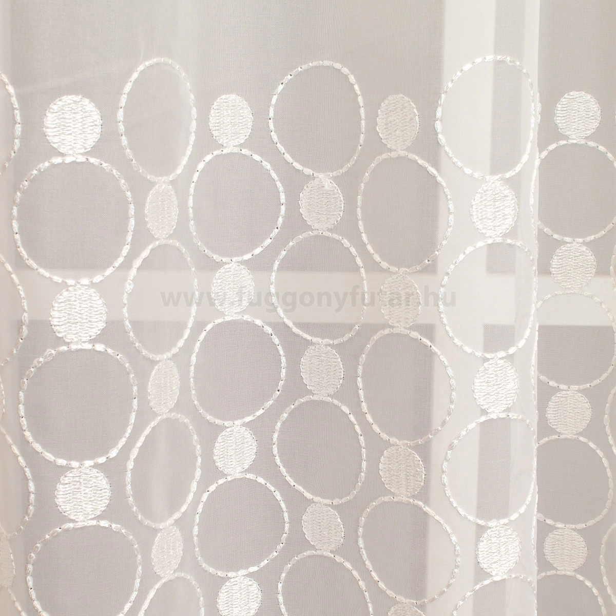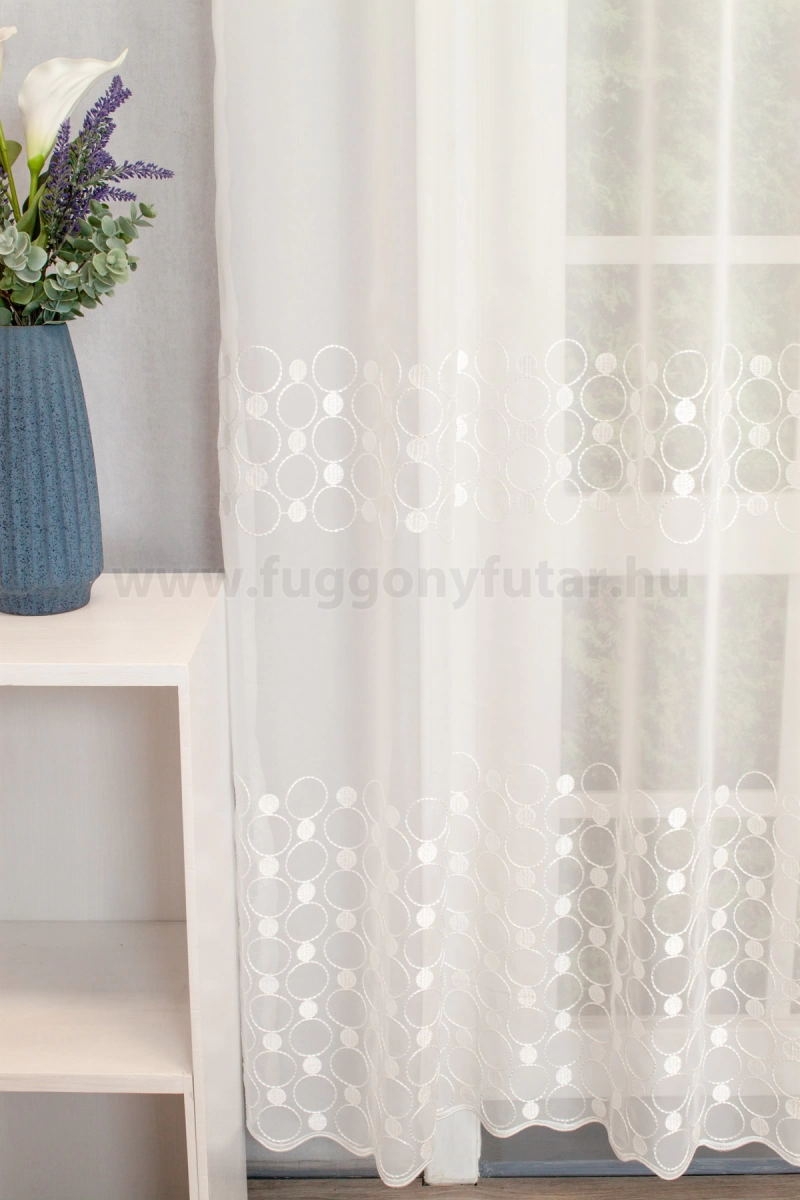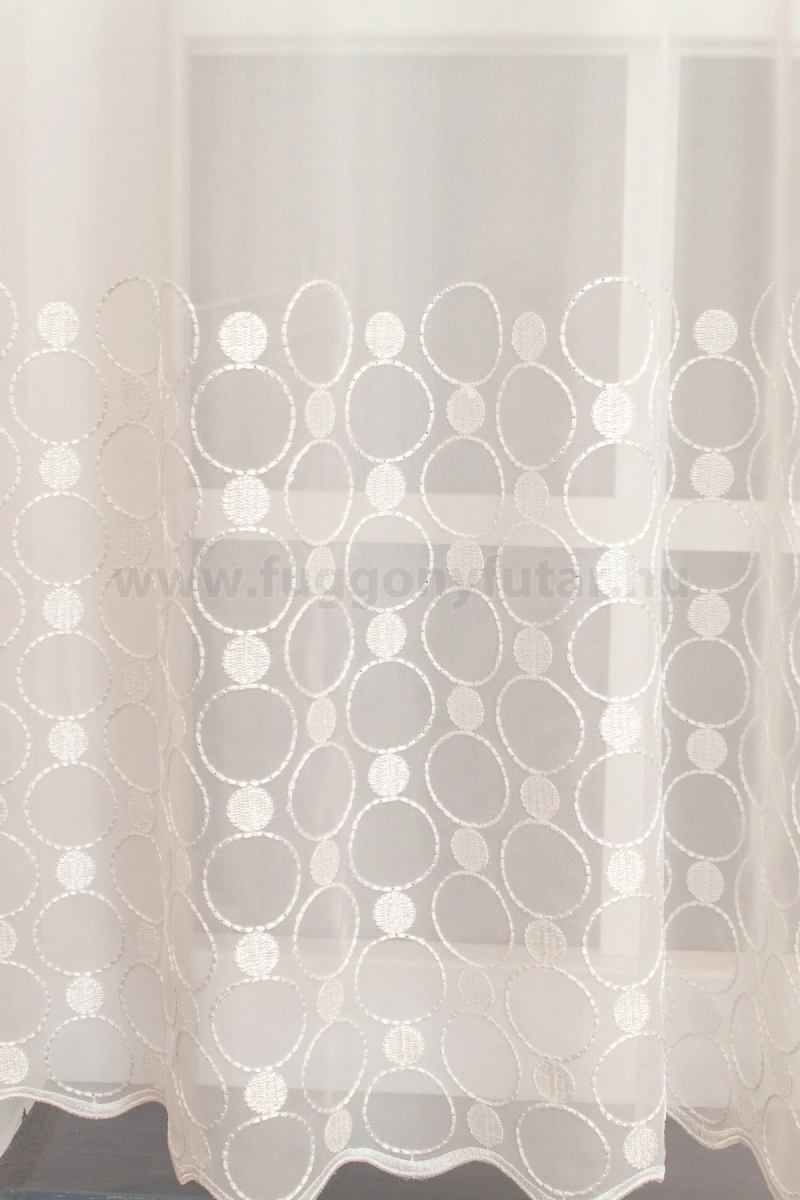 Derűs, napfényes hatást kelt ez a könnyű, bordűrös voile függöny. Finom szövésű anyaga átengedi a fényt, körkörös, fényes fonallal hímzett mintázata kedves hangulatot áraszt. A széles bordűrös sáv kellő tartást biztosít, kissé akadályozza a belátást is. Kímélő mosás után helyére akasztva szárítható, gőzölős vasalóval simítható.A geometrikus mintákkal otthonunk megtelik eleganciával, mégis egyszerű és modern marad Egyszerű formák ritmusos ismétlődése jellemzi legjobban ezt a geometrikus mintázatú anyagot. Egyszínű vagy visszafogott mintázatú sötétítővel párosítsuk, hogy hangsúlyos maradhasson a függöny formavilága. A bézs szín kellemes melegséggel árasztja el szobánkat Ez a meleg, természetes árnyalatú anyag remekül mutat bármilyen térben, amit otthonos, meleg színekkel szeretnénk berendezni. A bézs színű fényáteresztő függönyökhöz általában a sötétbarna, sötétkék, bordó, zöld, narancs, lila és szürke színű sötétítő és dekorfüggönyök illenek legjobban.Anyaga: voile Vékony, könnyed, fátyolszerű anyag . Az organzához képest vastagabb szálakból szövik, így kevésbé átlátszó, nehezebben gyűrődik, bár vasalást azért igényel (gőzölős vasalóval viszonylag könnyen, sérülésmentesen vasalható). 1.5x v. 2x-es ráncolással ajánljuk.Normál ablakok függönyözéséhez használható A karnistól a felső szegéshez szükséges anyagot beleszámítva legfeljebb 208 cm hosszú függönyt lehet belőle varrni, ez alatt bármilyen méretben elkészítjük. Méreténél fogva normál méretű ablakok függönyözésére alkalmas. Alsó szegélye hullámos, melyhez nagyobb díszítősáv (bordűr) párosul, ólomzsinór nem található benne.