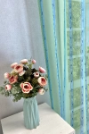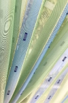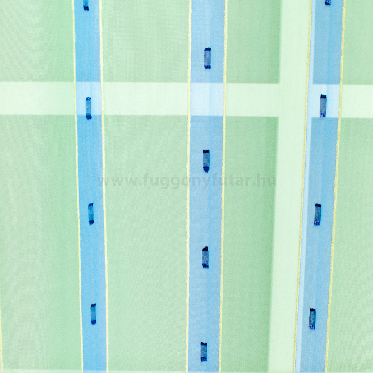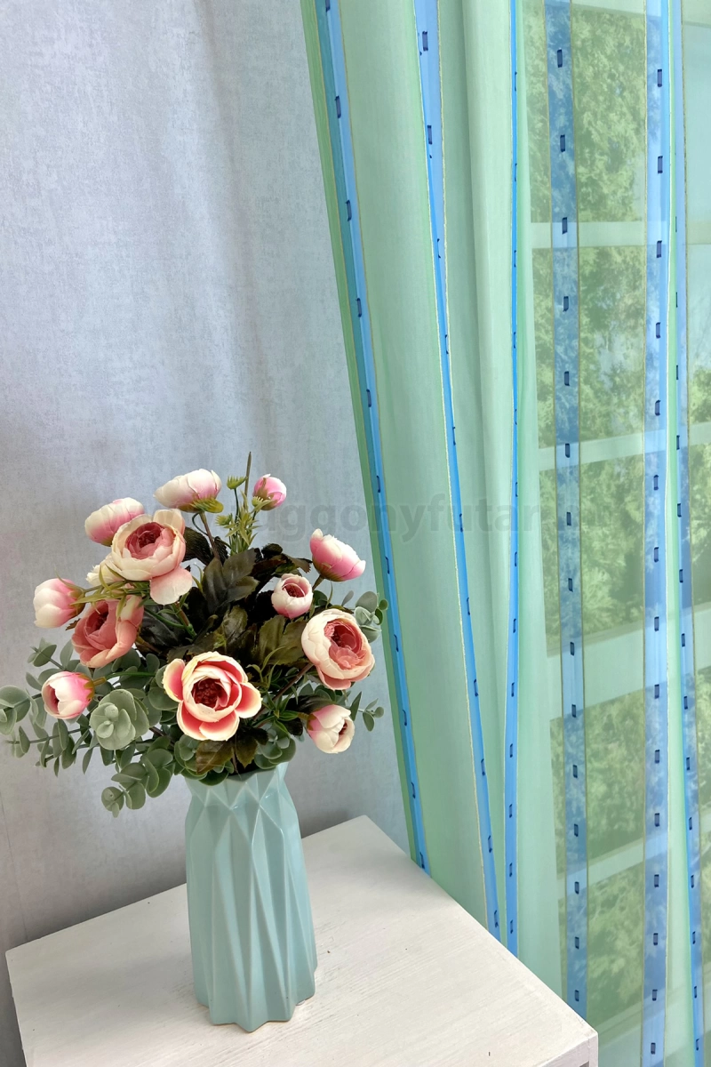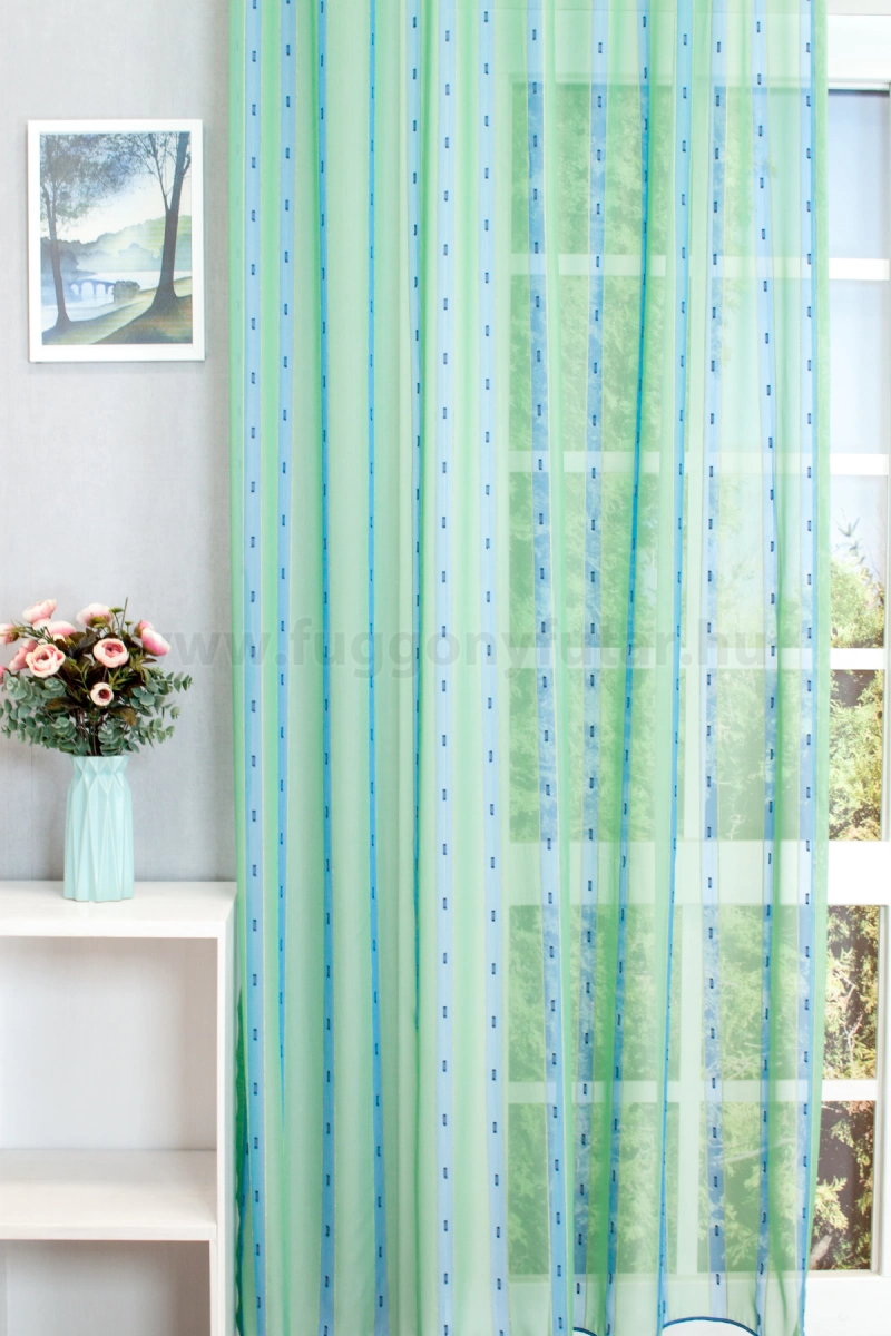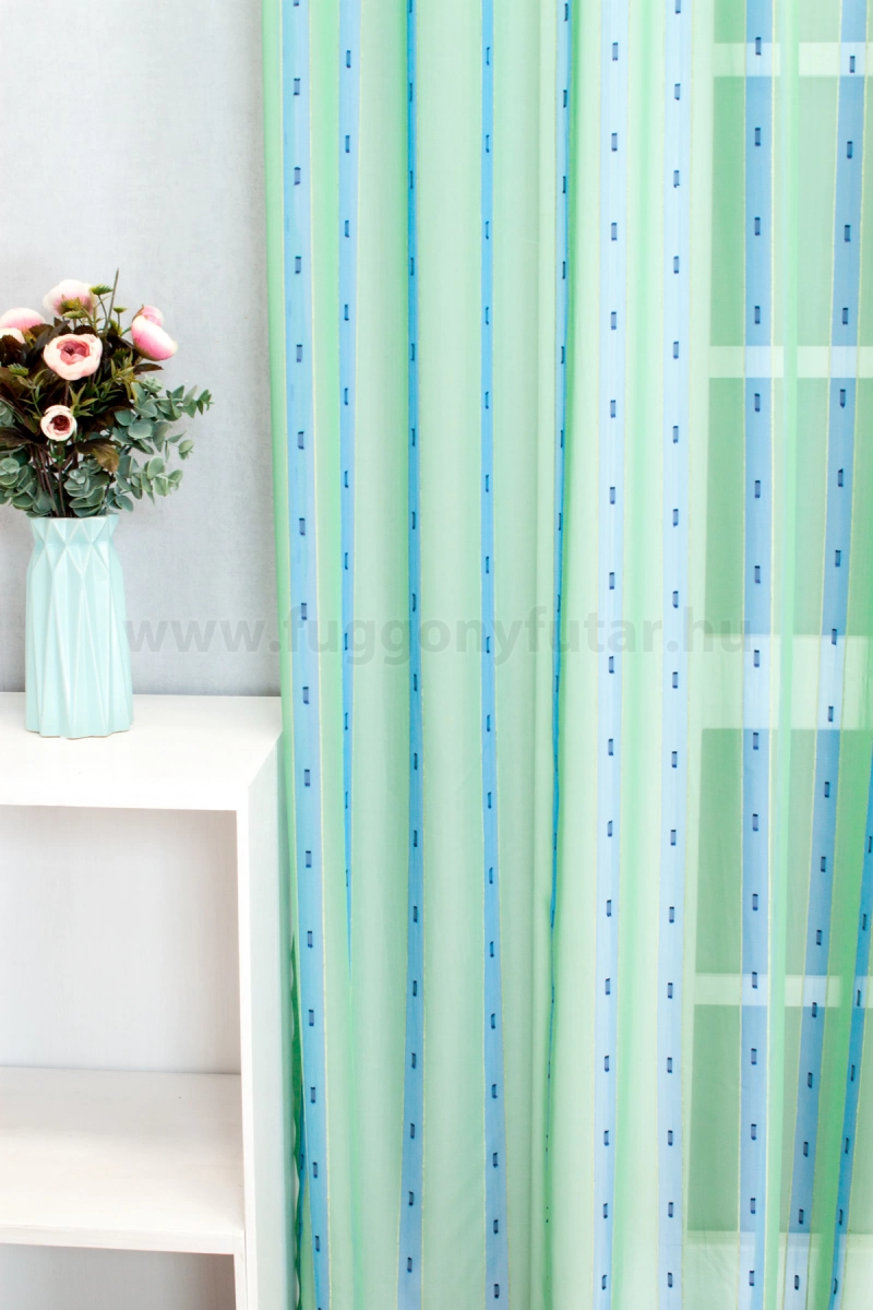 Napfényes szobában, modern stílusú, világos bútorok között mutat legjobban ez a halványzöld, kék csíkos voile függöny. Színei nyugtató hatásúak, mintáját és felületét puha sárga zsenília szál és sötétkék nyírt minták teszik változatossá. Könnyen kezelhető, kímélő mosás után helyére akasztva szárítható, gőzölős vasalóval simítható.A függőleges csíkok izgalmassá teszik a teret Az ilyen függőleges csíkozású anyagokhoz válasszunk egyszínű, szórt vagy virágmintás sötétítőt. Ez a mintázat optikailag nyújtja a teret. Tengert idéző türkiz Ez a tengert idéző kékeszöld árnyalatú anyag stílusos megjelenést ad bármelyik helyiségnek. Semleges meleg színnel vagy pasztell színekkel párosítva divatos színkombinációkat kreálhatunk. A türkiz színű fényáteresztő függönyökhöz általában a hasonló tónusú türkiz, zöld, kék, sötétkék, sárga, fekete és szürke színű sötétítő és dekorfüggönyök illenek legjobban.Anyaga: voile Vékony, könnyed, fátyolszerű anyag . Az organzához képest vastagabb szálakból szövik, így kevésbé átlátszó, nehezebben gyűrődik, bár vasalást azért igényel (gőzölős vasalóval viszonylag könnyen, sérülésmentesen vasalható). 1.5x v. 2x-es ráncolással ajánljuk.Terasz ajtókhoz, nagyobb ablakok függönyözéséhez jól használható A karnistól a felső szegéshez szükséges anyagot beleszámítva legfeljebb 298 cm hosszú függönyt lehet belőle varrni, ez alatt bármilyen méretben elkészítjük. Méreténél fogva alkalmas lehet terasz- és erkélyajtók, nagy belmagasságú helyiségek valamint normál ablakok függönyözésére is. A függöny aljába gyárilag varrt ólomzsinór megfelelő esést kölcsönöz a függönynek, megakadályozza az indokolatlan fellebbenést és az apróbb ráncokat is kisimítja.