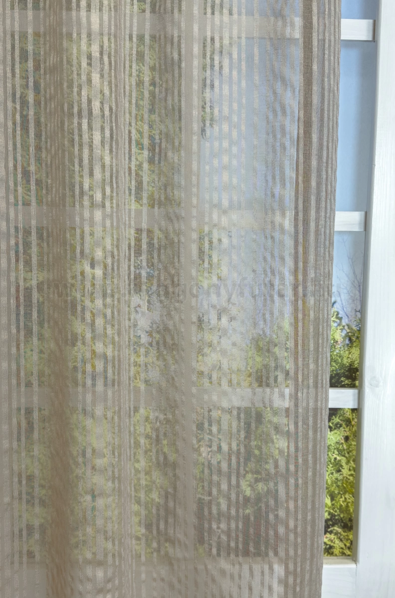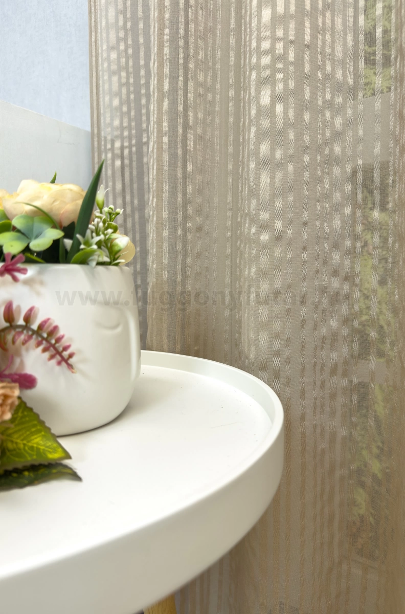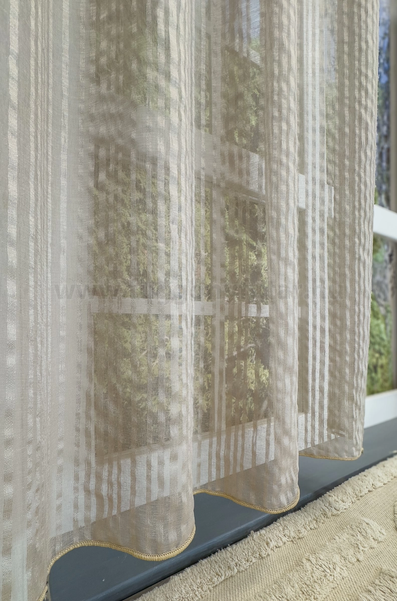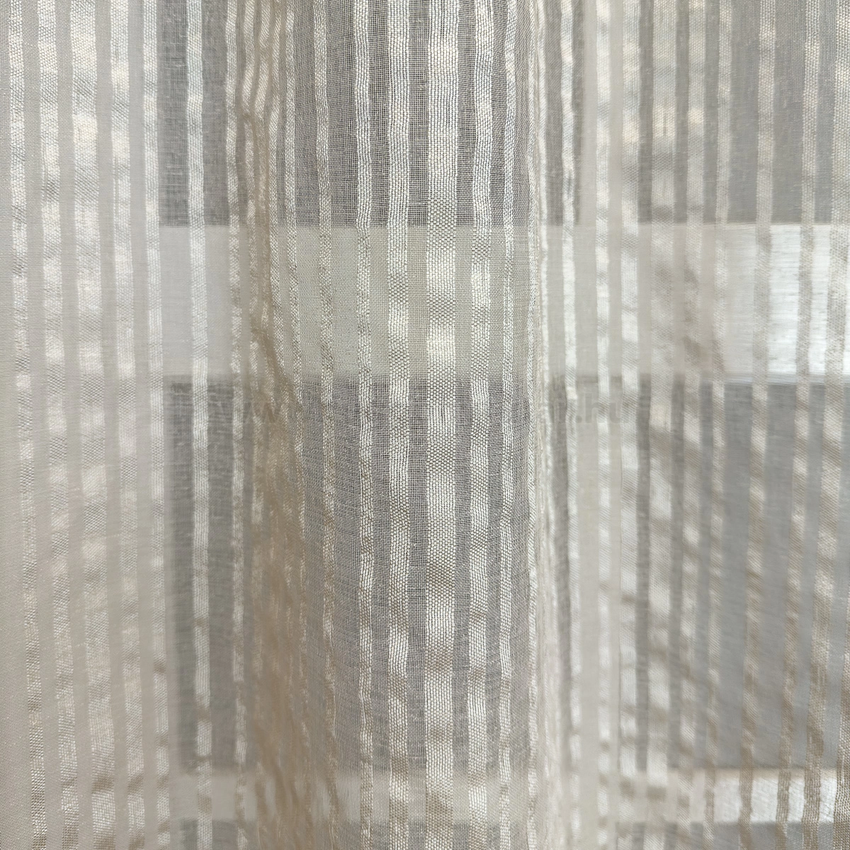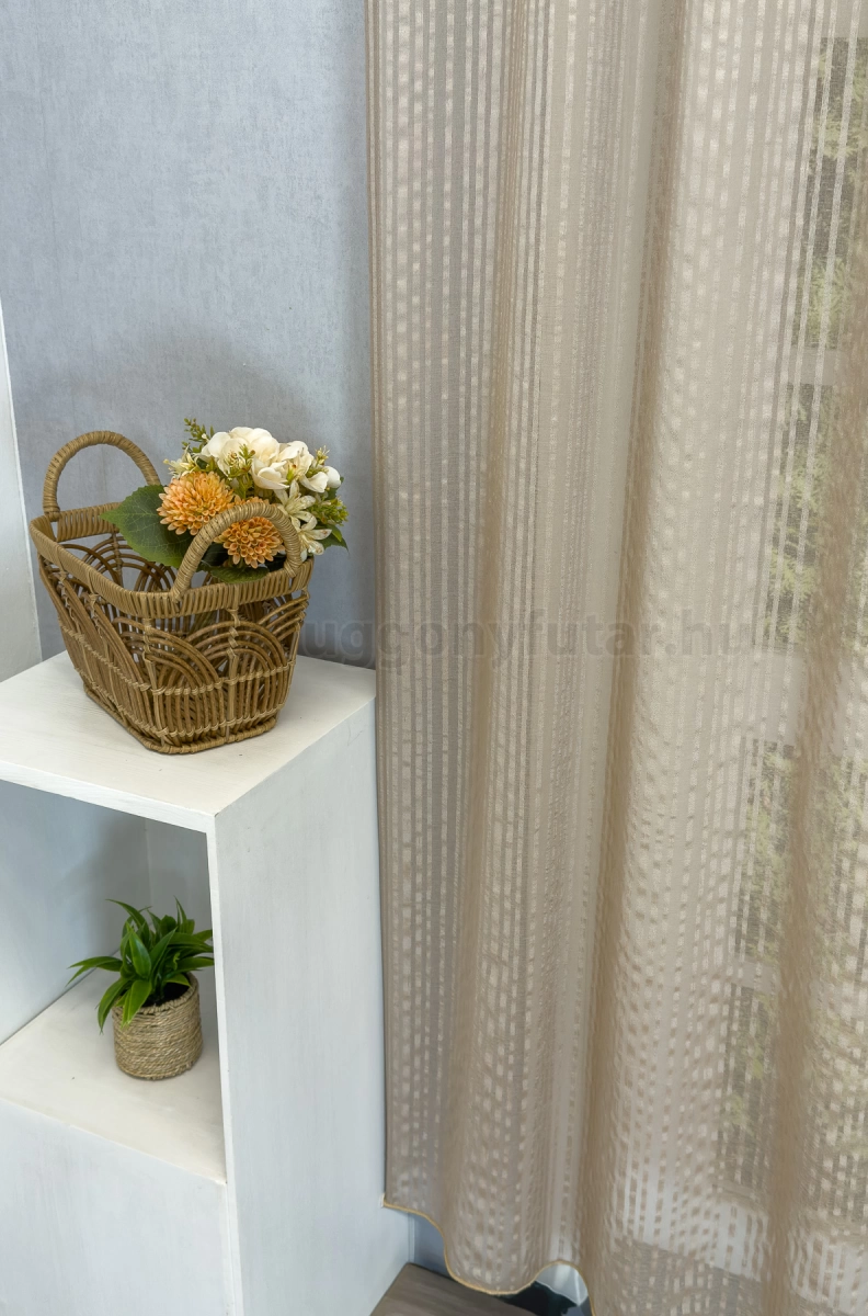 Ez a natúr vászon hatású fényáteresztő függöny hagyományos szőtteseket idéző csíkjaival mediterrán hangulatot teremt lakásunkban. A bézs szín kellemes melegséggel árasztja el szobánkat Ez a meleg, természetes árnyalatú anyag remekül mutat bármilyen térben, amit otthonos, meleg színekkel szeretnénk berendezni. A bézs színű fényáteresztő függönyökhöz általában a sötétbarna, sötétkék, bordó, zöld, narancs, lila és szürke színű sötétítő és dekorfüggönyök illenek legjobban.Ez a függöny skandináv lakberendezési stílushoz jól illeszthető Ez a függöny tökéletesen illeszkedik a skandináv stílus egyszerűséghez. Anyaga diszkréten simul bele a térbe, miközben kiemeli a helyiség hangulatát. Ideális választás, ha olyan textilt keresünk, amely rugalmasan alkalmazkodik a meglévő bútorokhoz és kiegészítőkhöz.Az otthon melegsége és kényelme Az ősz típusú textíliák a bekuckózós, meleg, hívogató hangulat megteremtésének mesterei. Színviláguk gazdag és földközeli: a rozsdabarna, a mustársárga, a terrakotta, a mélyzöld és a bézs árnyalatai jellemzik. Tökéletes választás a barátságos, gondoskodó személyiségeknek. Anyaga diszkréten simul bele a térbe, miközben kiemeli a helyiség hangulatát. Ideális választás, ha olyan textilt keresünk, amely rugalmasan alkalmazkodik a meglévő bútorokhoz és kiegészítőkhöz.Anyaga: sablé Változó vastagságú szálakból szőtt anyag. Kevésbé hajlamos a gyűrődésre , mint a voile. 1.5x-es ráncolással ajánljuk.Terasz ajtókhoz, nagyobb ablakok függönyözéséhez jól használható A karnistól a felső szegéshez szükséges anyagot beleszámítva legfeljebb 298 cm hosszú függönyt lehet belőle varrni, ez alatt bármilyen méretben elkészítjük. Méreténél fogva alkalmas lehet terasz- és erkélyajtók, nagy belmagasságú helyiségek valamint normál ablakok függönyözésére is. A függöny aljába gyárilag varrt ólomzsinór megfelelő esést kölcsönöz a függönynek, megakadályozza az indokolatlan fellebbenést és az apróbb ráncokat is kisimítja.Vasalást kevésbé igénylő anyag Az anyag kevesebb vasalást igényel, mint az átlag függöny. Sokszor elég, ha mosás után még nedvesen a helyükre akasztjuk, így kilógva magát a ráncok kisimulnak és a függönyünk teljes pompájában ragyog!