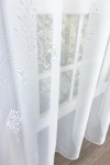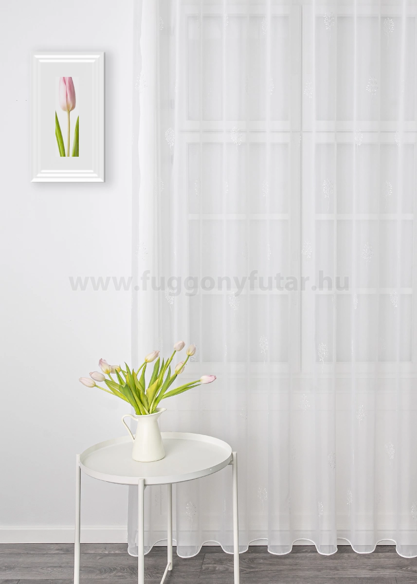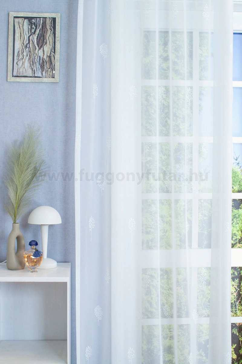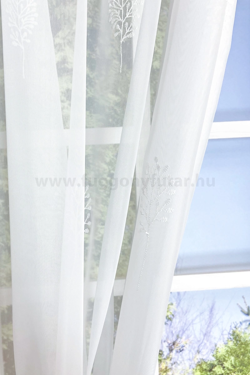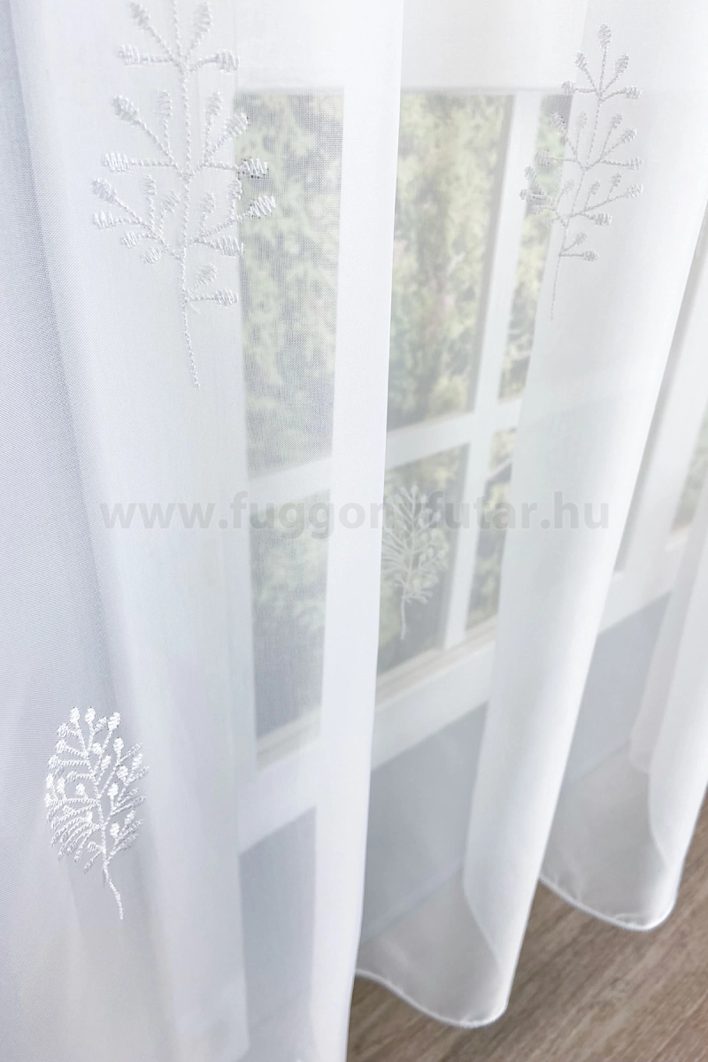 Teremtsünk romantikus hangulatot szobánkba ezzel a kellemes, növényi mintás anyaggal! A növényi minták mindig is népszerűek voltak a textiltervezők és lakberendezők körében, hiszen barátságossá és természetközelivé teszik otthonunkat. Egyszínű, színben harmonizáló textilekkel kombinálva romantikus stílust és kiegyensúlyozott megjelenést kölcsönözhetünk helyiségünknek. A fehér szín légies és világos, fényt hoz a szobába A fehér a világosság és a tisztaság színe, egész nap érezhetjük a friss tavaszi szellő simogatását, ha egy szép fehér függöny díszíti az ablakunkat. A fehér színű fényáteresztő függönyöket bármilyen színű sötétítő függönnyel kombinálhatjuk, de a szoba falának színét mindig vegyük figyelembe.Ez a függöny többféle lakberendezési stílushoz is jól illeszthető Ez a függöny több lakberendezési irányzathoz is tökéletesen illeszkedik – legyen szó a mediterrán könnyedségről, a skandináv egyszerűségről vagy a klasszikus eleganciáról. Anyaga diszkréten simul bele a térbe, miközben kiemeli a helyiség hangulatát. Ideális választás, ha olyan textilt keresünk, amely rugalmasan alkalmazkodik a meglévő bútorokhoz és kiegészítőkhöz.Anyaga: voile Vékony, könnyed, fátyolszerű anyag . Az organzához képest vastagabb szálakból szövik, így kevésbé átlátszó, nehezebben gyűrődik, bár vasalást azért igényel (gőzölős vasalóval viszonylag könnyen, sérülésmentesen vasalható). 1.5x v. 2x-es ráncolással ajánljuk.Terasz ajtókhoz, nagyobb ablakok függönyözéséhez jól használható A karnistól a felső szegéshez szükséges anyagot beleszámítva legfeljebb 288 cm hosszú függönyt lehet belőle varrni, ez alatt bármilyen méretben elkészítjük. Méreténél fogva alkalmas lehet terasz- és erkélyajtók, nagy belmagasságú helyiségek valamint normál ablakok függönyözésére is. A függöny aljába gyárilag varrt ólomzsinór megfelelő esést kölcsönöz a függönynek, megakadályozza az indokolatlan fellebbenést és az apróbb ráncokat is kisimítja.