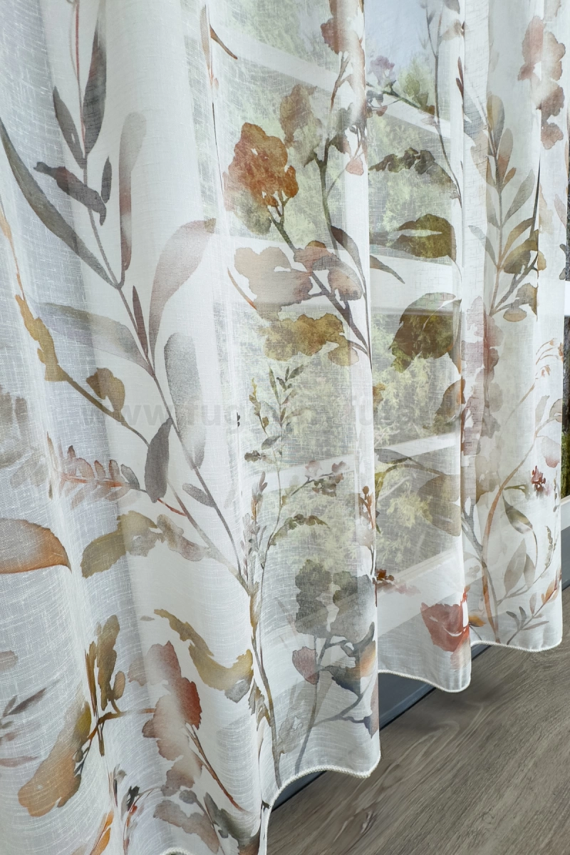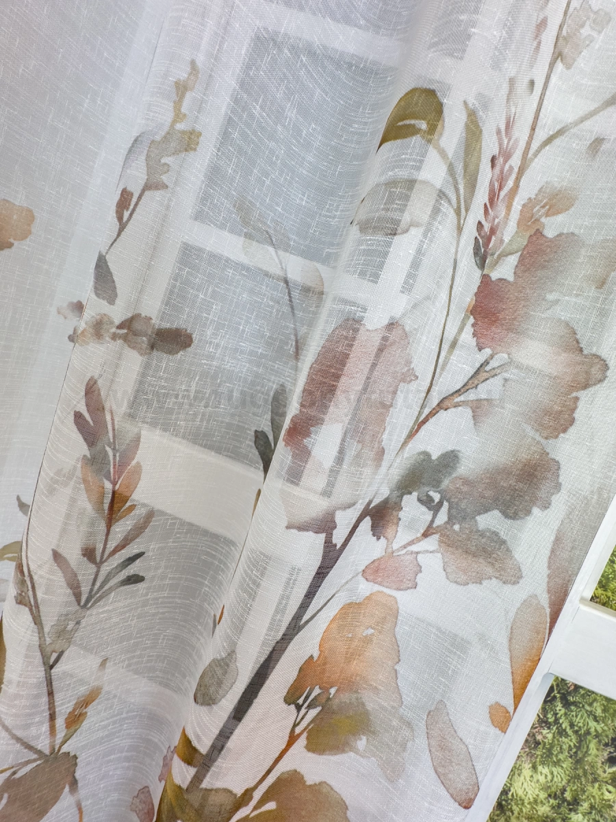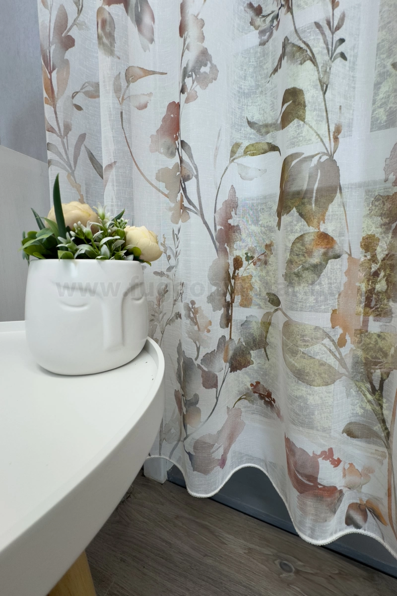 Teremtsünk romantikus hangulatot szobánkba ezzel a kellemes, növényi mintás anyaggal! A növényi minták mindig is népszerűek voltak a textiltervezők és lakberendezők körében, hiszen barátságossá és természetközelivé teszik otthonunkat. Egyszínű, színben harmonizáló textilekkel kombinálva romantikus stílust és kiegyensúlyozott megjelenést kölcsönözhetünk helyiségünknek. A barna és terrakotta szín a föld, a kitartás és kifinomultság jelképe A barnákat a kényelem és melegség kifejezésére használhatjuk. Élénk, gazdag árnyalatok alkalmazásával luxust és finomságot sugallhatunk. A barna, terrakotta mintás fényáteresztő függönyökhöz általában a sötétbarna, bézs, sárga színű sötétítő és dekorfüggönyök illenek legjobban.Ez a függöny többféle lakberendezési stílushoz is jól illeszthető Ez a függöny több lakberendezési irányzathoz is tökéletesen illeszkedik – legyen szó a vintage nosztalgiáról, a mediterrán könnyedségről vagy a skandináv egyszerűségről. Anyaga diszkréten simul bele a térbe, miközben kiemeli a helyiség hangulatát. Ideális választás, ha olyan textilt keresünk, amely rugalmasan alkalmazkodik a meglévő bútorokhoz és kiegészítőkhöz.Anyaga: sablé Változó vastagságú szálakból szőtt anyag. Kevésbé hajlamos a gyűrődésre , mint a voile. 1.5x-es ráncolással ajánljuk.Terasz ajtókhoz, nagyobb ablakok függönyözéséhez jól használható A karnistól a felső szegéshez szükséges anyagot beleszámítva legfeljebb 298 cm hosszú függönyt lehet belőle varrni, ez alatt bármilyen méretben elkészítjük. Méreténél fogva alkalmas lehet terasz- és erkélyajtók, nagy belmagasságú helyiségek valamint normál ablakok függönyözésére is. A függöny aljába gyárilag varrt ólomzsinór megfelelő esést kölcsönöz a függönynek, megakadályozza az indokolatlan fellebbenést és az apróbb ráncokat is kisimítja.Vasalást kevésbé igénylő anyag Az anyag kevesebb vasalást igényel, mint az átlag függöny. Sokszor elég, ha mosás után még nedvesen a helyükre akasztjuk, így kilógva magát a ráncok kisimulnak és a függönyünk teljes pompájában ragyog!