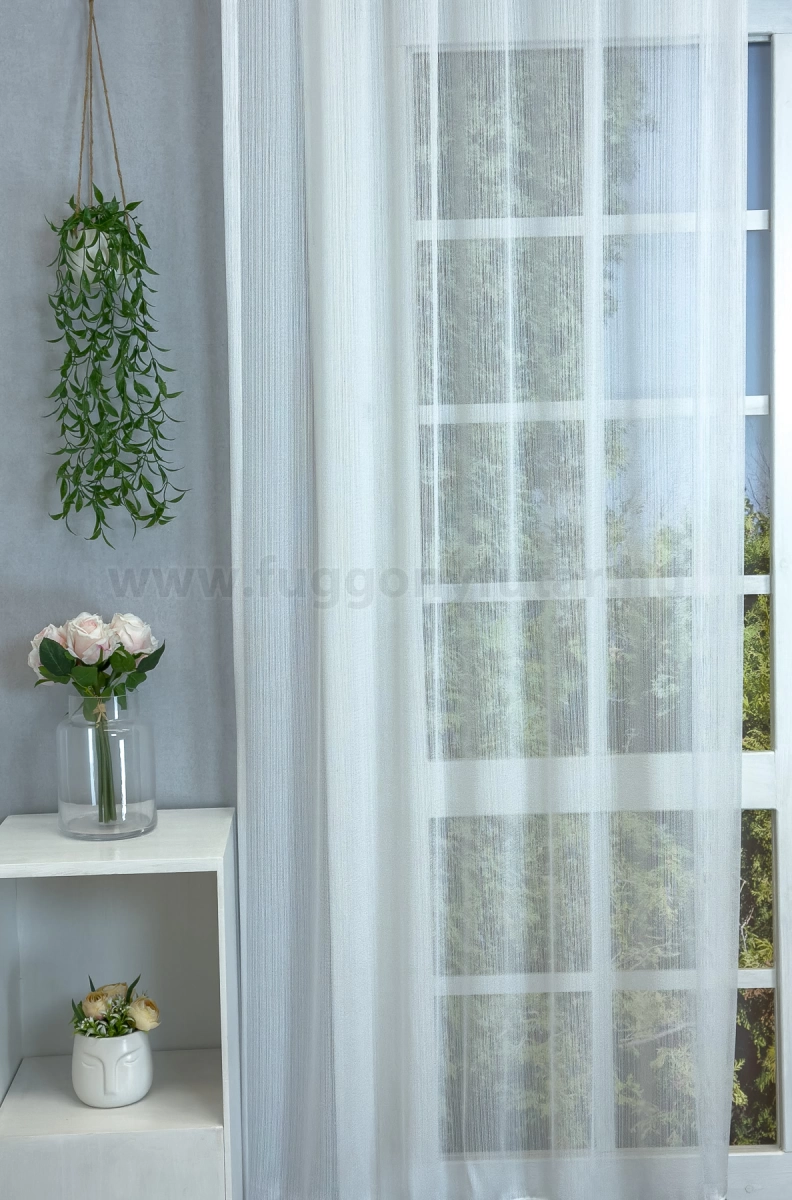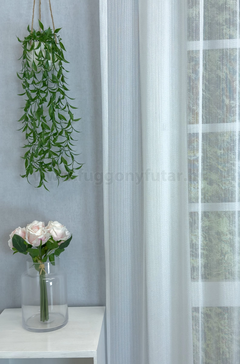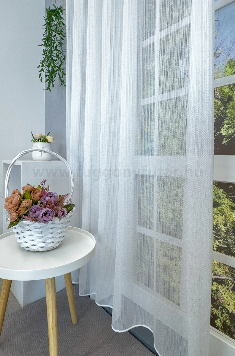 Fehér színű, szatén fényű szállal szövött csillogó sablé függöny.A függőleges csíkok izgalmassá teszik a teret Az ilyen függőleges csíkozású anyagokhoz válasszunk egyszínű, szórt vagy virágmintás sötétítőt. Ez a mintázat optikailag nyújtja a teret. A fehér szín légies és világos, fényt hoz a szobába A fehér a világosság és a tisztaság színe, egész nap érezhetjük a friss tavaszi szellő simogatását, ha egy szép fehér függöny díszíti az ablakunkat. A fehér színű fényáteresztő függönyöket bármilyen színű sötétítő függönnyel kombinálhatjuk, de a szoba falának színét mindig vegyük figyelembe.Ez a függöny többféle lakberendezési stílushoz is jól illeszthető Ez a függöny több lakberendezési irányzathoz is tökéletesen illeszkedik – legyen szó az Art deco ragyogásáról, a glamour luxusáról, a klasszikus eleganciáról vagy a skandináv egyszerűségről. Anyaga diszkréten simul bele a térbe, miközben kiemeli a helyiség hangulatát. Ideális választás, ha olyan textilt keresünk, amely rugalmasan alkalmazkodik a meglévő bútorokhoz és kiegészítőkhöz.Drámai és luxus hatás A tél típusú anyagok merészek, elegánsak és egy csipetnyi drámát visznek a térbe. Színvilágukban az éles kontrasztok és a mély, gazdag ékszertónusok dominálnak, mint a smaragdzöld, a zafírkék, a rubinvörös, kiegészítve a feketével, fehérrel és fémes csillogással. Ideális a magabiztos, kifinomult személyiségeknek. Anyaga diszkréten simul bele a térbe, miközben kiemeli a helyiség hangulatát. Ideális választás, ha olyan textilt keresünk, amely rugalmasan alkalmazkodik a meglévő bútorokhoz és kiegészítőkhöz.Anyaga: sablé Változó vastagságú szálakból szőtt anyag. Kevésbé hajlamos a gyűrődésre , mint a voile. 1.5x-es ráncolással ajánljuk.Terasz ajtókhoz, nagyobb ablakok függönyözéséhez jól használható A karnistól a felső szegéshez szükséges anyagot beleszámítva legfeljebb 298 cm hosszú függönyt lehet belőle varrni, ez alatt bármilyen méretben elkészítjük. Méreténél fogva alkalmas lehet terasz- és erkélyajtók, nagy belmagasságú helyiségek valamint normál ablakok függönyözésére is. A függöny aljába gyárilag varrt ólomzsinór megfelelő esést kölcsönöz a függönynek, megakadályozza az indokolatlan fellebbenést és az apróbb ráncokat is kisimítja.Vasalást kevésbé igénylő anyag Az anyag kevesebb vasalást igényel, mint az átlag függöny. Sokszor elég, ha mosás után még nedvesen a helyükre akasztjuk, így kilógva magát a ráncok kisimulnak és a függönyünk teljes pompájában ragyog!