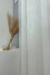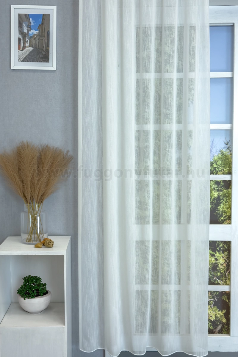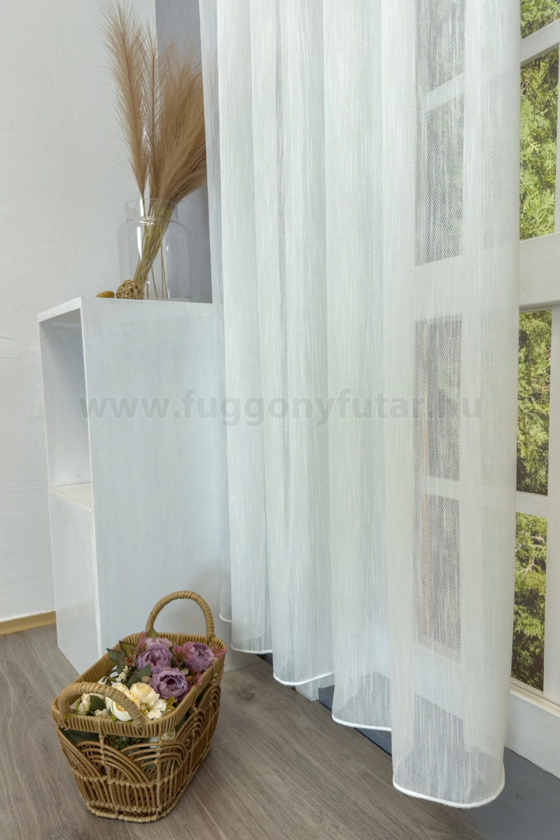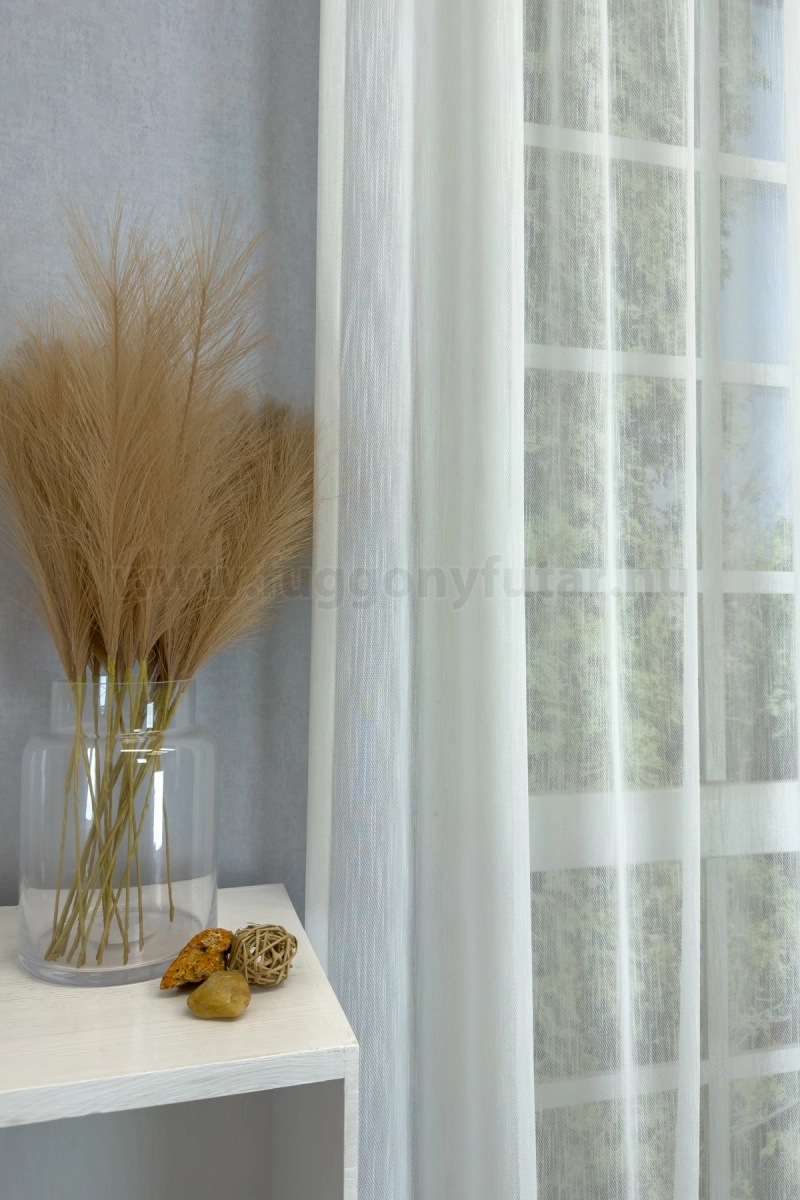 Tört fehér színű, függőleges csíkokkal szőtt természetes hatású sablé függöny. Vasaláskönnyített anyag, könnyen kezelhető.A függőleges csíkok izgalmassá teszik a teret Az ilyen függőleges csíkozású anyagokhoz válasszunk egyszínű, szórt vagy virágmintás sötétítőt. Ez a mintázat optikailag nyújtja a teret. A bézs szín kellemes melegséggel árasztja el szobánkat Ez a meleg, természetes árnyalatú anyag remekül mutat bármilyen térben, amit otthonos, meleg színekkel szeretnénk berendezni. A bézs színű fényáteresztő függönyökhöz általában a sötétbarna, sötétkék, bordó, zöld, narancs, lila és szürke színű sötétítő és dekorfüggönyök illenek legjobban.Ez a függöny skandináv lakberendezési stílushoz jól illeszthető Ez a függöny tökéletesen illeszkedik a skandináv stílus egyszerűséghez. Anyaga diszkréten simul bele a térbe, miközben kiemeli a helyiség hangulatát. Ideális választás, ha olyan textilt keresünk, amely rugalmasan alkalmazkodik a meglévő bútorokhoz és kiegészítőkhöz.Anyaga: sablé Változó vastagságú szálakból szőtt anyag. Kevésbé hajlamos a gyűrődésre , mint a voile. 1.5x-es ráncolással ajánljuk.Terasz ajtókhoz, nagyobb ablakok függönyözéséhez jól használható A karnistól a felső szegéshez szükséges anyagot beleszámítva legfeljebb 293 cm hosszú függönyt lehet belőle varrni, ez alatt bármilyen méretben elkészítjük. Méreténél fogva alkalmas lehet terasz- és erkélyajtók, nagy belmagasságú helyiségek valamint normál ablakok függönyözésére is. A függöny aljába gyárilag varrt ólomzsinór megfelelő esést kölcsönöz a függönynek, megakadályozza az indokolatlan fellebbenést és az apróbb ráncokat is kisimítja.Vasalást kevésbé igénylő anyag Az anyag kevesebb vasalást igényel, mint az átlag függöny. Sokszor elég, ha mosás után még nedvesen a helyükre akasztjuk, így kilógva magát a ráncok kisimulnak és a függönyünk teljes pompájában ragyog!
