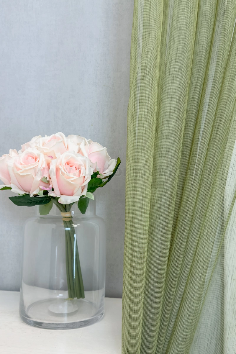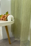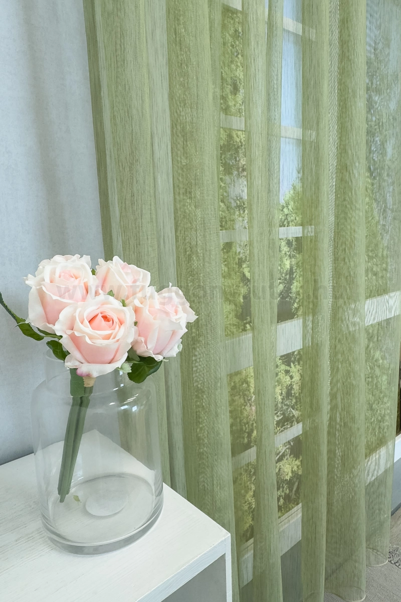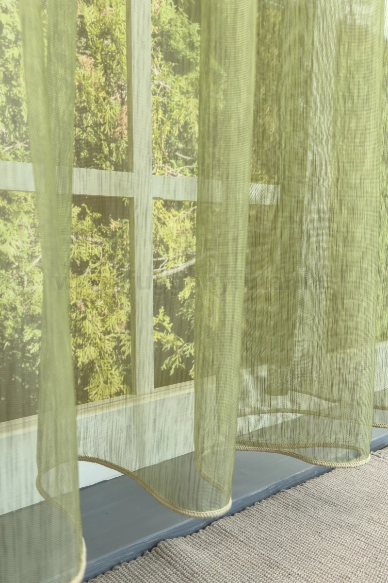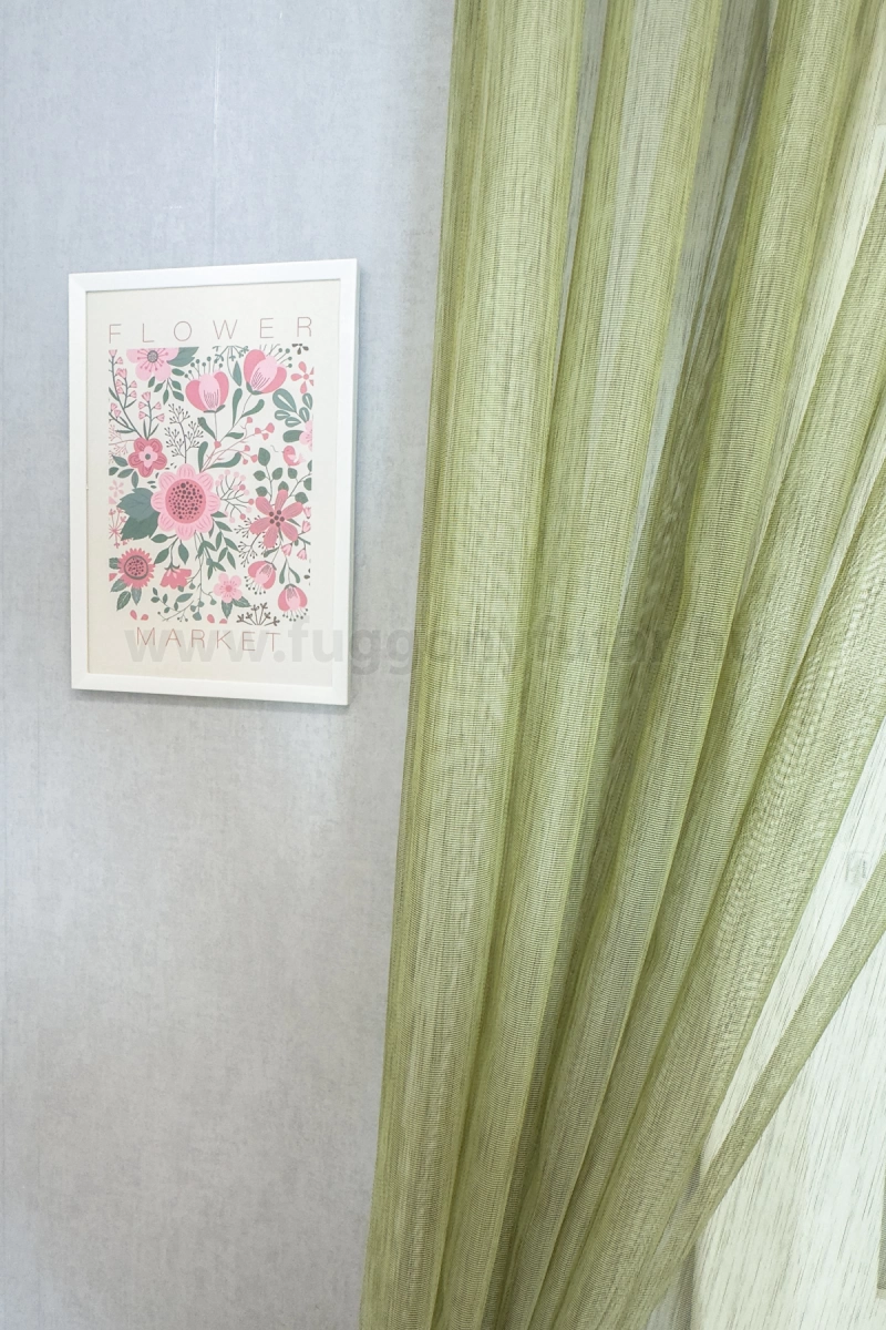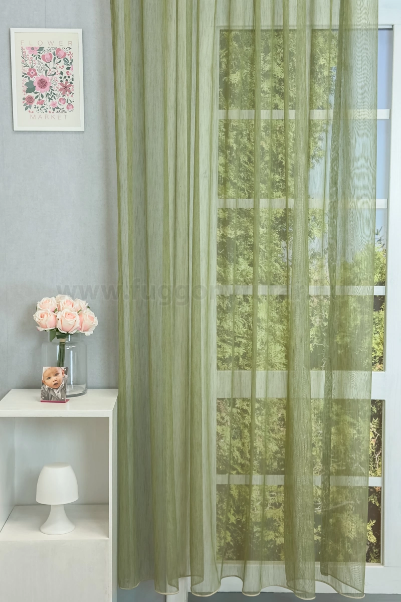 A szórt mintás anyagok izgalmas felülete bármely helyiségben jól mutat Az anyag teljes felületén elszórtan megjelenő ritkább-sűrűbb szálbeszövések izgalmas felületet hoznak létre. Bármilyen, színben harmonizáló, mintás anyagot remekül párosíthatunk hozzá. Hozza közel a természetet a zöld szín segítségével! Friss és természetközeli szín. A természetet, az újrakezdést és az egészséget szimbolizálja. Segít frissen és harmonikusan tartani a szobát. Használjuk a konyhában és a közösségi terekben. A zöld színű fényáteresztő függönyökhöz általában a sötétbarna, zöld, bézs, ekrü és sárga színű sötétítő és dekorfüggönyök illenek legjobban.Égéskésleltetett anyagból készült A lángálló (égéskésleltetett) függöny textíliák legfontosabb tulajdonsága, hogy nem kapnak lángra, nem lángolnak, nem terjesztik a tűzet és nem bocsátnak ki mérgező gázokat, csak egyszerűen elolvadnak. Ez a függöny ilyen lángálló tulajdonsággal rendelkezik, használat és tisztítás következtében sem veszíti el ezt a képességét. Sok közintézményben, a szolgáltató és vendéglátóiparban csak ilyen típusú minősített bizonyítvánnyal rendelkező anyagok használhatók függönyözésre. Kiemelten ajánljuk irodáknak, konferenciahelyiségeknek, egészségügyi és oktatási intézményeknek, színházaknak és mozi termeknek, illetve vendéglátóhelyeknek – szállodáknak és éttermeknek.Ez a függöny többféle lakberendezési stílushoz is jól illeszthető Ez a függöny több lakberendezési irányzathoz is tökéletesen illeszkedik – legyen szó a skandináv egyszerűségről, a mediterrán könnyedségről vagy a minimál letisztultságról. Anyaga diszkréten simul bele a térbe, miközben kiemeli a helyiség hangulatát. Ideális választás, ha olyan textilt keresünk, amely rugalmasan alkalmazkodik a meglévő bútorokhoz és kiegészítőkhöz.Anyaga: sablé Változó vastagságú szálakból szőtt anyag. Kevésbé hajlamos a gyűrődésre , mint a voile. 1.5x-es ráncolással ajánljuk.Terasz ajtókhoz, nagyobb ablakok függönyözéséhez jól használható A karnistól a felső szegéshez szükséges anyagot beleszámítva legfeljebb 313 cm hosszú függönyt lehet belőle varrni, ez alatt bármilyen méretben elkészítjük. Méreténél fogva alkalmas lehet terasz- és erkélyajtók, nagy belmagasságú helyiségek valamint normál ablakok függönyözésére is. A függöny aljába gyárilag varrt ólomzsinór megfelelő esést kölcsönöz a függönynek, megakadályozza az indokolatlan fellebbenést és az apróbb ráncokat is kisimítja.Vasalást kevésbé igénylő anyag Az anyag kevesebb vasalást igényel, mint az átlag függöny. Sokszor elég, ha mosás után még nedvesen a helyükre akasztjuk, így kilógva magát a ráncok kisimulnak és a függönyünk teljes pompájában ragyog!
