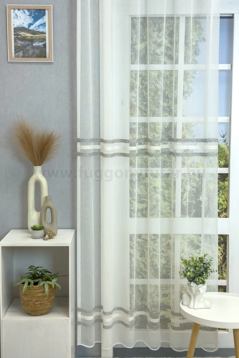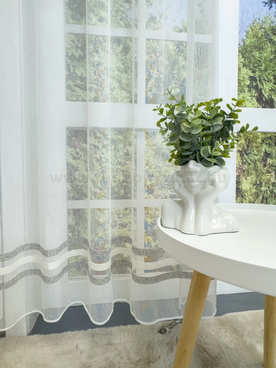 A vízszintes csíkok izgalmassá teszik a teret Az ilyen vízszintes csíkozású anyagokhoz válasszunk egyszínű, szórt vagy virágmintás sötétítőt. Ez a mintázat optikailag szélesíti a teret. Semleges és elegáns szürke A szürke semleges és elegáns. Stabilitást képvisel. Bármely élénk színnel jól kombinálható, de azt ne vigyük túlzásba. A szürke mintás fényáteresztő függönyökhöz általában a narancs, sötétkék, bordó, lila és szürke színű sötétítő és dekorfüggönyök illenek legjobban.Ez a függöny többféle lakberendezési stílushoz is jól illeszthető Ez a függöny több lakberendezési irányzathoz is tökéletesen illeszkedik – legyen szó a minimál letisztultságról, a skandináv egyszerűségről vagy a klasszikus eleganciáról. Anyaga diszkréten simul bele a térbe, miközben kiemeli a helyiség hangulatát. Ideális választás, ha olyan textilt keresünk, amely rugalmasan alkalmazkodik a meglévő bútorokhoz és kiegészítőkhöz.Anyaga: sablé Változó vastagságú szálakból szőtt anyag. Kevésbé hajlamos a gyűrődésre , mint a voile. 1.5x-es ráncolással ajánljuk.Terasz ajtókhoz, nagyobb ablakok függönyözéséhez jól használható A karnistól a felső szegéshez szükséges anyagot beleszámítva legfeljebb 298 cm hosszú függönyt lehet belőle varrni, ez alatt bármilyen méretben elkészítjük. Méreténél fogva alkalmas lehet terasz- és erkélyajtók, nagy belmagasságú helyiségek valamint normál ablakok függönyözésére is. A függöny aljába gyárilag varrt ólomzsinór megfelelő esést kölcsönöz a függönynek, megakadályozza az indokolatlan fellebbenést és az apróbb ráncokat is kisimítja.Vasalást kevésbé igénylő anyag Az anyag kevesebb vasalást igényel, mint az átlag függöny. Sokszor elég, ha mosás után még nedvesen a helyükre akasztjuk, így kilógva magát a ráncok kisimulnak és a függönyünk teljes pompájában ragyog!