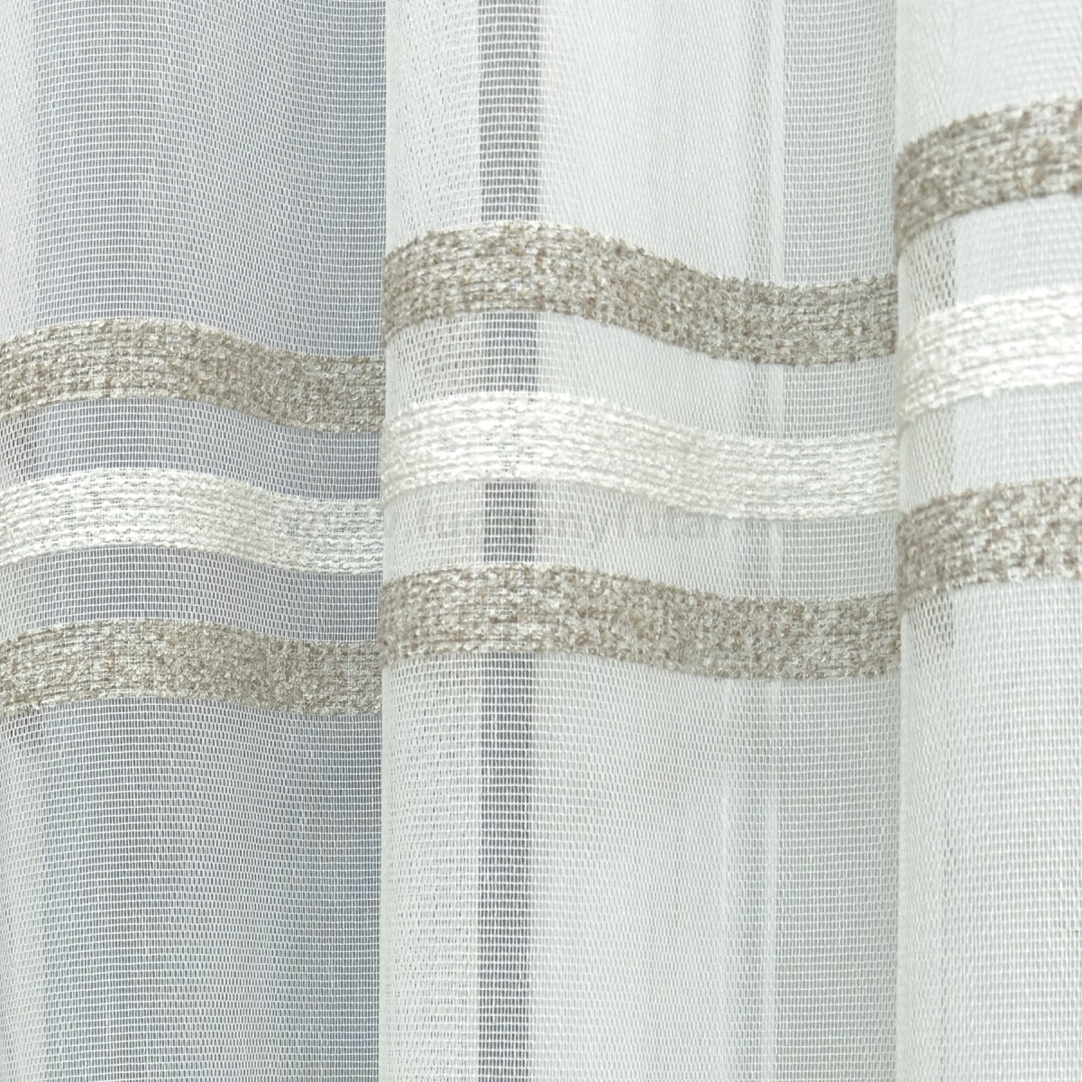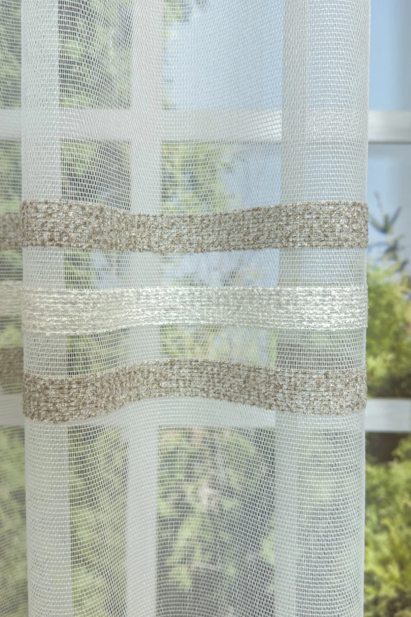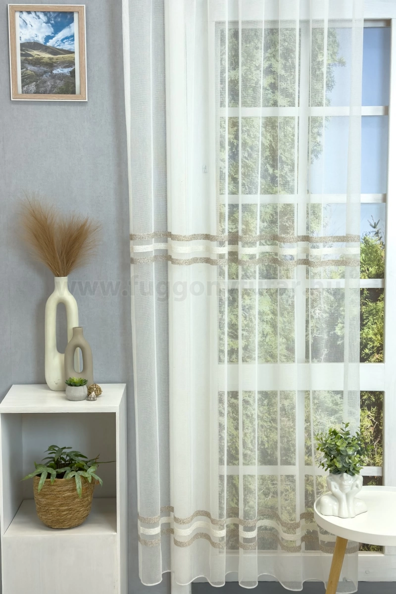 A vízszintes csíkok izgalmassá teszik a teret Az ilyen vízszintes csíkozású anyagokhoz válasszunk egyszínű, szórt vagy virágmintás sötétítőt. Ez a mintázat optikailag szélesíti a teret. A bézs szín kellemes melegséggel árasztja el szobánkat Ez a meleg, természetes árnyalatú anyag remekül mutat bármilyen térben, amit otthonos, meleg színekkel szeretnénk berendezni. A bézs, mintás fényáteresztő függönyökhöz általában a sötétbarna, sötétkék, bordó, zöld, narancs, lila és szürke színű sötétítő és dekorfüggönyök illenek legjobban.Ez a függöny többféle lakberendezési stílushoz is jól illeszthető Ez a függöny több lakberendezési irányzathoz is tökéletesen illeszkedik – legyen szó a skandináv egyszerűségről, a klasszikus eleganciáról vagy a minimál letisztultságról. Anyaga diszkréten simul bele a térbe, miközben kiemeli a helyiség hangulatát. Ideális választás, ha olyan textilt keresünk, amely rugalmasan alkalmazkodik a meglévő bútorokhoz és kiegészítőkhöz.Anyaga: sablé Változó vastagságú szálakból szőtt anyag. Kevésbé hajlamos a gyűrődésre , mint a voile. 1.5x-es ráncolással ajánljuk.Terasz ajtókhoz, nagyobb ablakok függönyözéséhez jól használható A karnistól a felső szegéshez szükséges anyagot beleszámítva legfeljebb 298 cm hosszú függönyt lehet belőle varrni, ez alatt bármilyen méretben elkészítjük. Méreténél fogva alkalmas lehet terasz- és erkélyajtók, nagy belmagasságú helyiségek valamint normál ablakok függönyözésére is. A függöny aljába gyárilag varrt ólomzsinór megfelelő esést kölcsönöz a függönynek, megakadályozza az indokolatlan fellebbenést és az apróbb ráncokat is kisimítja.Vasalást kevésbé igénylő anyag Az anyag kevesebb vasalást igényel, mint az átlag függöny. Sokszor elég, ha mosás után még nedvesen a helyükre akasztjuk, így kilógva magát a ráncok kisimulnak és a függönyünk teljes pompájában ragyog!