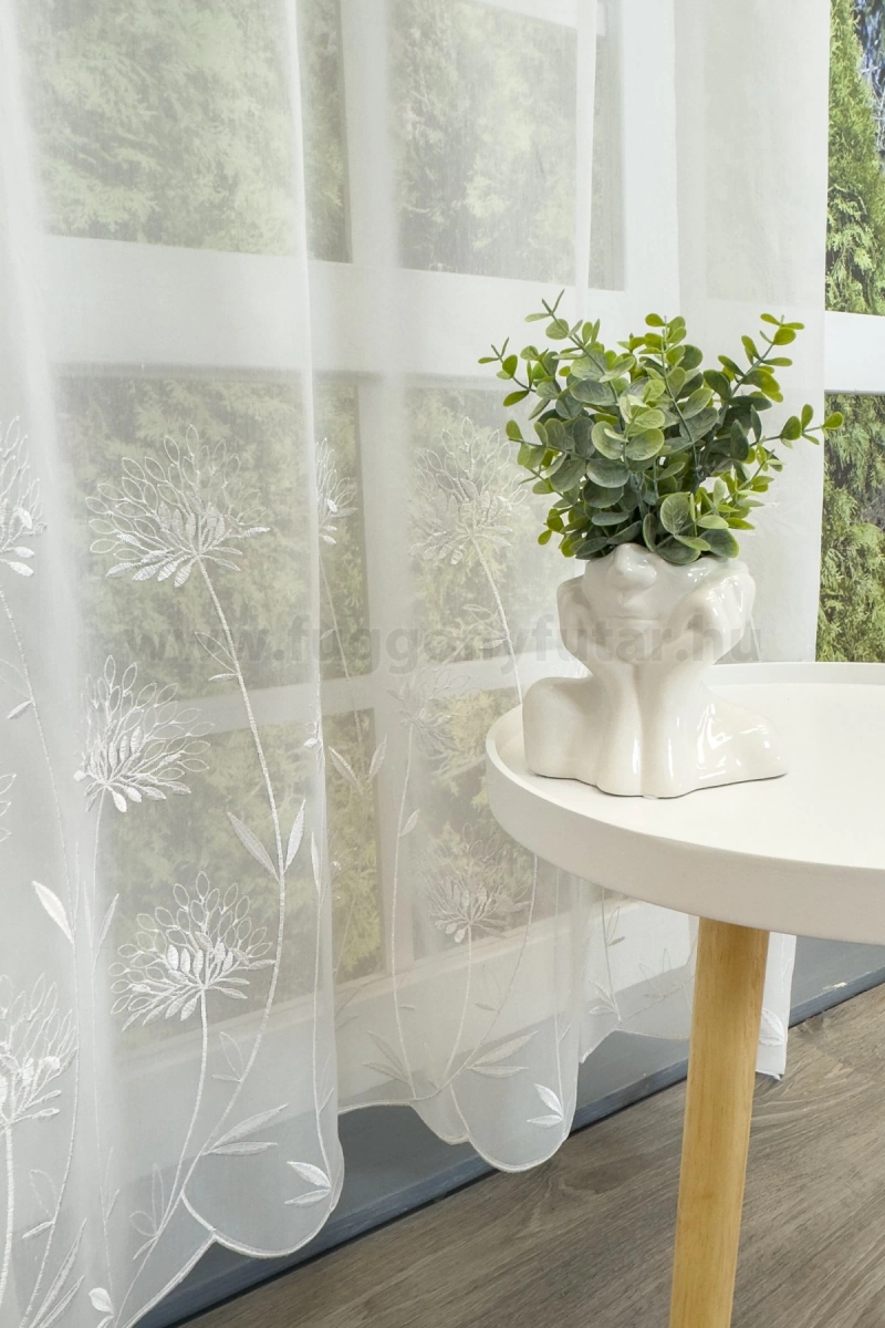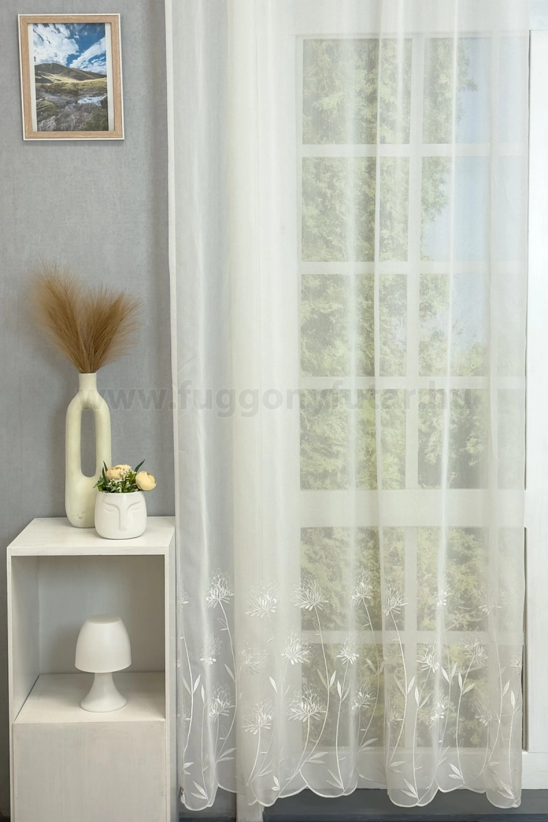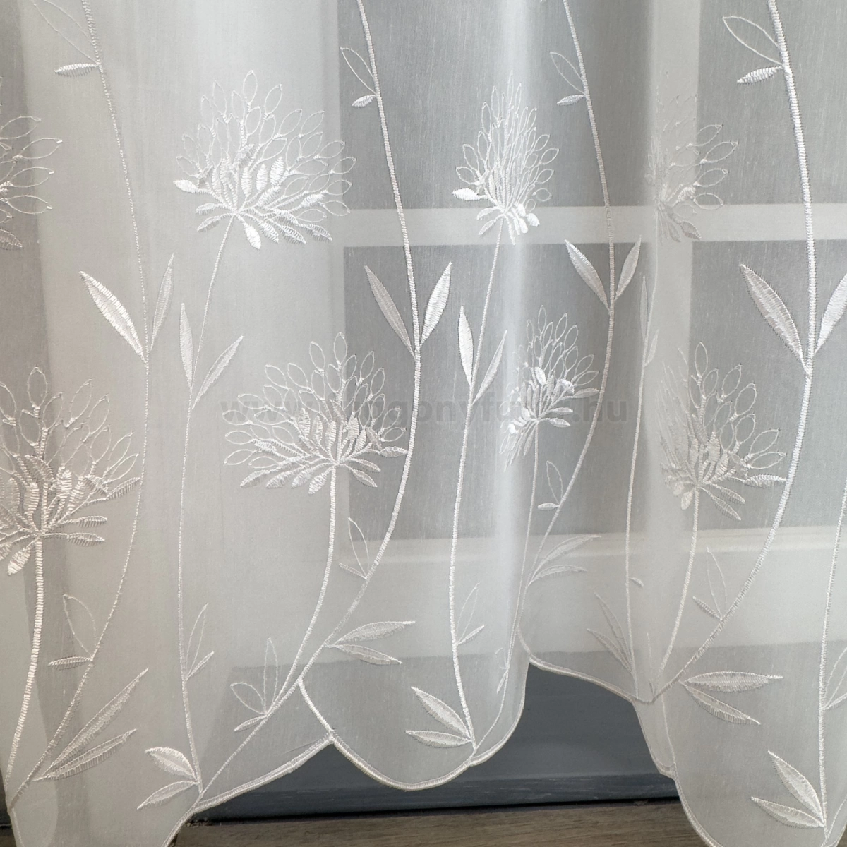Teremtsünk romantikus hangulatot szobánkba ezzel a kellemes, virágmintás anyaggal! A virágminták vagy növényi minták mindig is népszerűek voltak a textiltervezők és lakberendezők körében, hiszen barátságossá és természetközelivé teszik otthonunkat. Egyszínű, színben harmonizáló textilekkel kombinálva romantikus stílust és kiegyensúlyozott megjelenést kölcsönözhetünk helyiségünknek. A fehér szín légies és világos, fényt hoz a szobába A fehér a világosság és a tisztaság színe, egész nap érezhetjük a friss tavaszi szellő simogatását, ha egy szép fehér függöny díszíti az ablakunkat. A fehér színű fényáteresztő függönyöket bármilyen színű sötétítő függönnyel kombinálhatjuk, de a szoba falának színét mindig vegyük figyelembe.Ez a függöny többféle lakberendezési stílushoz is jól illeszthető Ez a függöny több lakberendezési irányzathoz is tökéletesen illeszkedik – legyen szó a mediterrán könnyedségről, a klasszikus eleganciáról vagy a glamour luxusáról. Anyaga diszkréten simul bele a térbe, miközben kiemeli a helyiség hangulatát. Ideális választás, ha olyan textilt keresünk, amely rugalmasan alkalmazkodik a meglévő bútorokhoz és kiegészítőkhöz.Anyaga: voile Vékony, könnyed, fátyolszerű anyag . Az organzához képest vastagabb szálakból szövik, így kevésbé átlátszó, nehezebben gyűrődik, bár vasalást azért igényel (gőzölős vasalóval viszonylag könnyen, sérülésmentesen vasalható). 1.5x v. 2x-es ráncolással ajánljuk.Terasz ajtókhoz, nagyobb ablakok függönyözéséhez jól használható A karnistól a felső szegéshez szükséges anyagot beleszámítva legfeljebb 293 cm hosszú függönyt lehet belőle varrni, ez alatt bármilyen méretben elkészítjük. Méreténél fogva alkalmas lehet terasz- és erkélyajtók, nagy belmagasságú helyiségek valamint normál ablakok függönyözésére is. Alsó szegélye hullámos, melyhez nagyobb díszítősáv (bordűr) párosul, ólomzsinór nem található benne.