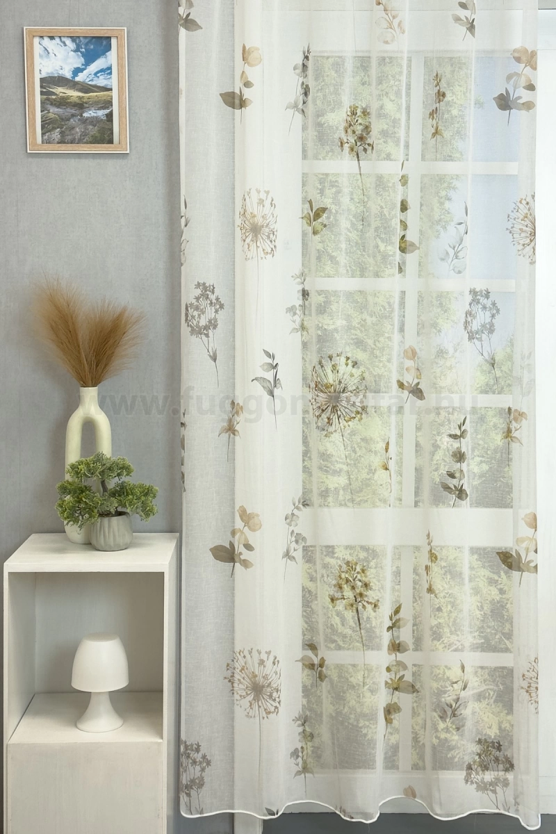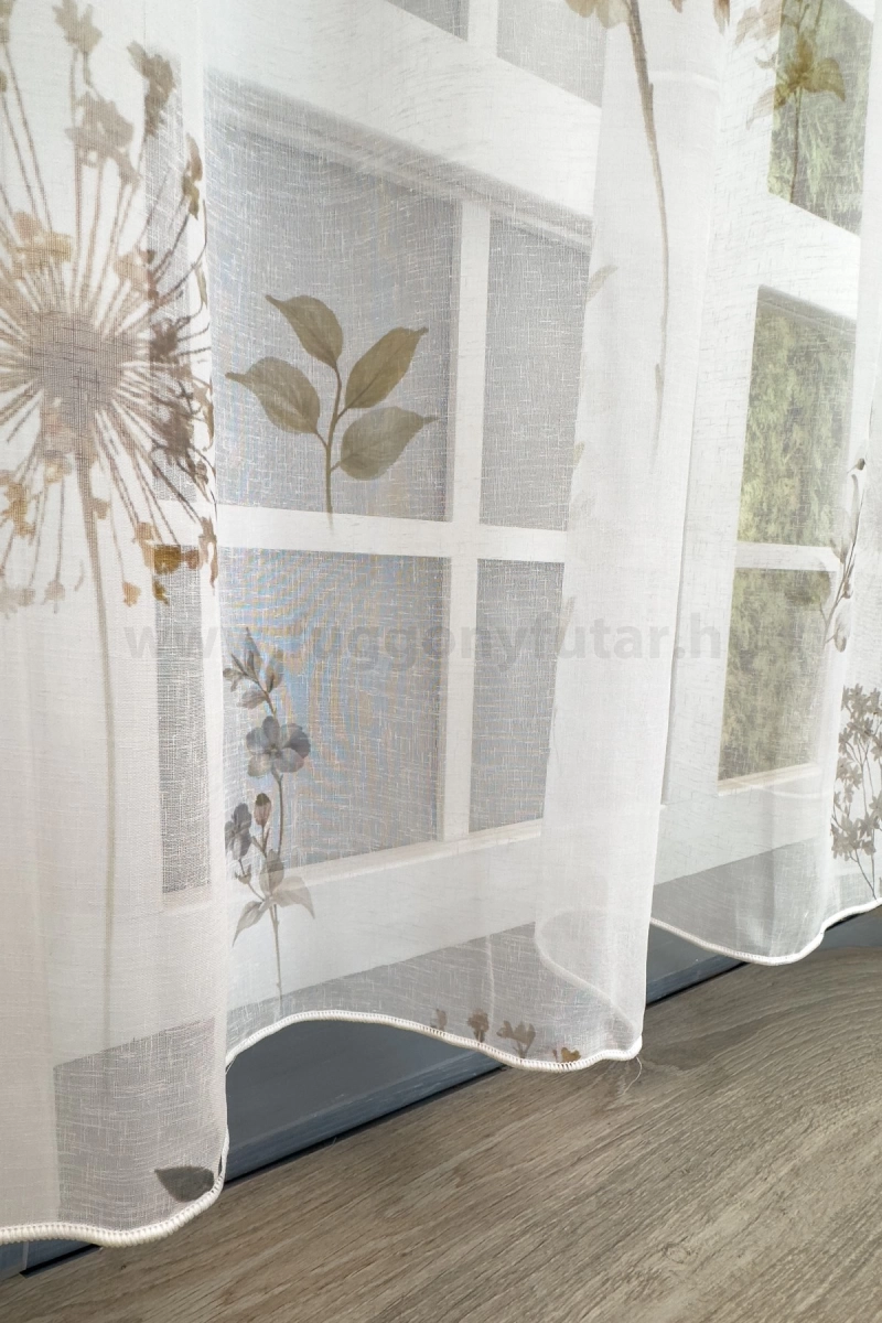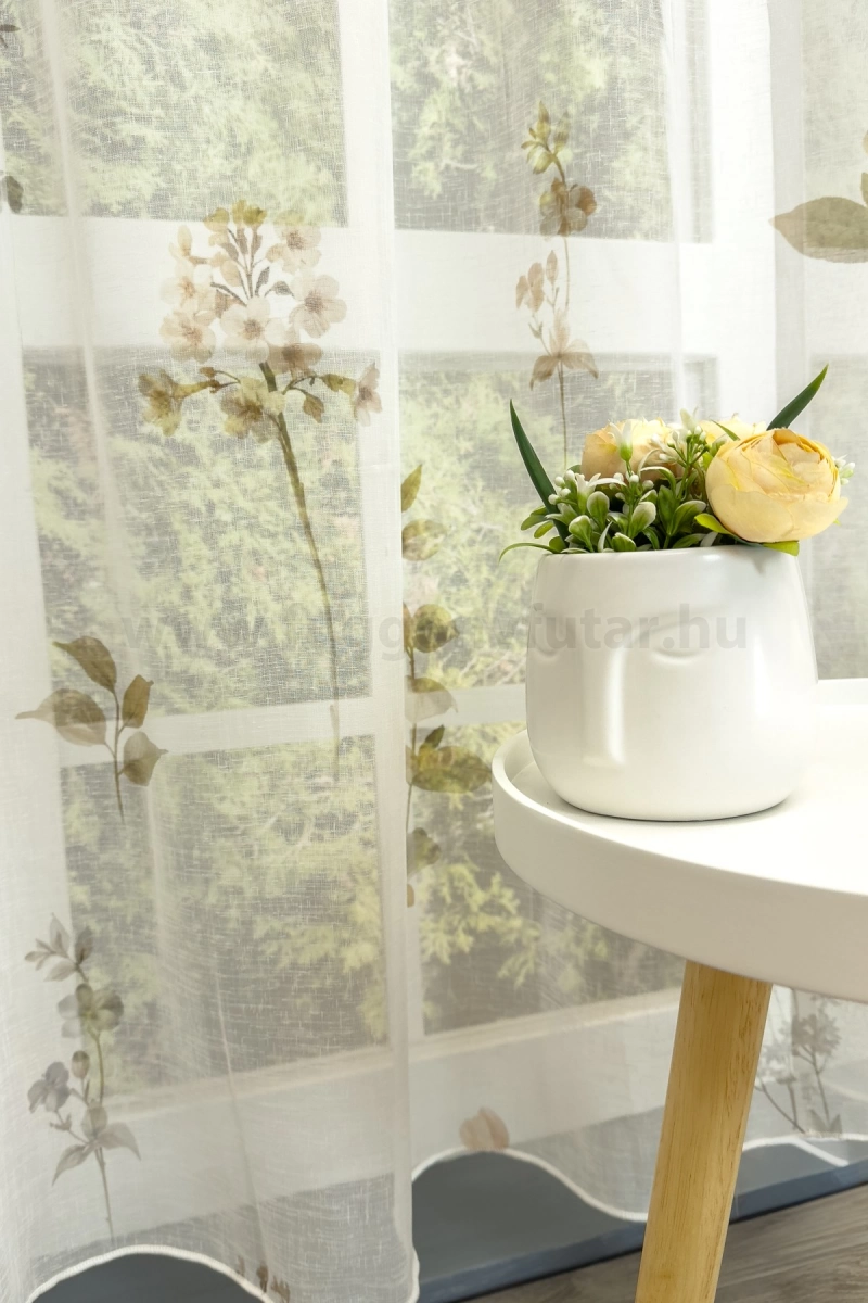 Teremtsünk romantikus hangulatot szobánkba ezzel a kellemes, növényi mintás anyaggal! A növényi minták mindig is népszerűek voltak a textiltervezők és lakberendezők körében, hiszen barátságossá és természetközelivé teszik otthonunkat. Egyszínű, színben harmonizáló textilekkel kombinálva romantikus stílust és kiegyensúlyozott megjelenést kölcsönözhetünk helyiségünknek. A fehér szín légies és világos, fényt hoz a szobába A fehér a világosság és a tisztaság színe, egész nap érezhetjük a friss tavaszi szellő simogatását, ha egy szép fehér függöny díszíti az ablakunkat. A fehér színű fényáteresztő függönyöket bármilyen színű sötétítő függönnyel kombinálhatjuk, de a szoba falának színét mindig vegyük figyelembe.Ez a függöny többféle lakberendezési stílushoz is jól illeszthető Ez a függöny több lakberendezési irányzathoz is tökéletesen illeszkedik – legyen szó a skandináv egyszerűségről, a vintage nosztalgiáról vagy a mediterrán könnyedségről. Anyaga diszkréten simul bele a térbe, miközben kiemeli a helyiség hangulatát. Ideális választás, ha olyan textilt keresünk, amely rugalmasan alkalmazkodik a meglévő bútorokhoz és kiegészítőkhöz.Anyaga: sablé Változó vastagságú szálakból szőtt anyag. Kevésbé hajlamos a gyűrődésre , mint a voile. 1.5x-es ráncolással ajánljuk.Terasz ajtókhoz, nagyobb ablakok függönyözéséhez jól használható A karnistól a felső szegéshez szükséges anyagot beleszámítva legfeljebb 288 cm hosszú függönyt lehet belőle varrni, ez alatt bármilyen méretben elkészítjük. Méreténél fogva alkalmas lehet terasz- és erkélyajtók, nagy belmagasságú helyiségek valamint normál ablakok függönyözésére is. A függöny aljába gyárilag varrt ólomzsinór megfelelő esést kölcsönöz a függönynek, megakadályozza az indokolatlan fellebbenést és az apróbb ráncokat is kisimítja.
