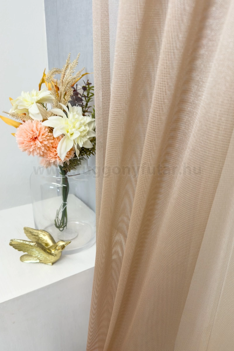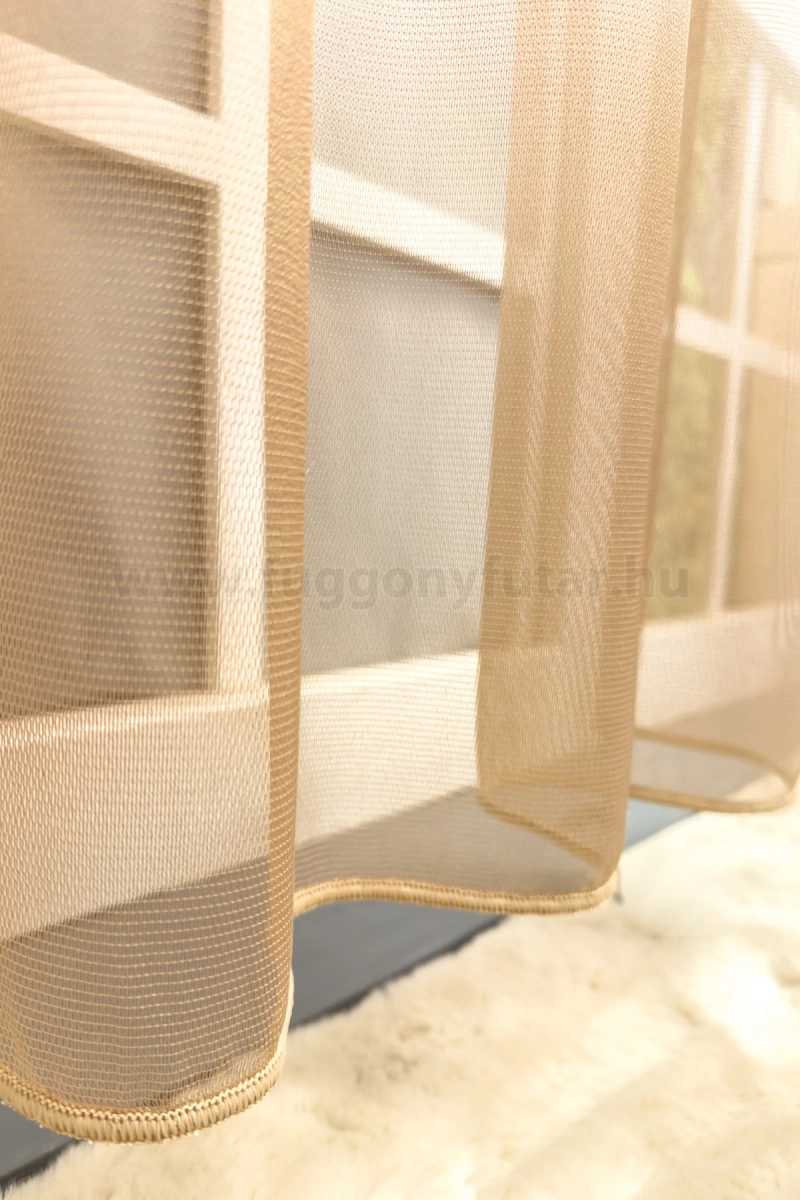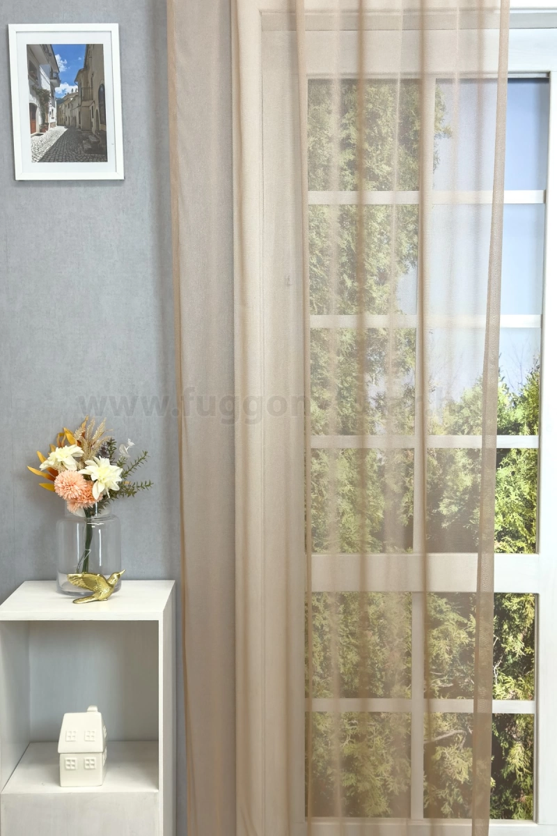 A barna és terrakotta szín a föld, a kitartás és kifinomultság jelképe A barnákat a kényelem és melegség kifejezésére használhatjuk. Élénk, gazdag árnyalatok alkalmazásával luxust és finomságot sugallhatunk. A barna, terrakotta színű fényáteresztő függönyökhöz általában a sötétbarna, bézs, sárga színű sötétítő és dekorfüggönyök illenek legjobban.Diszkrét csillogás elegáns megjelenéssel A csillámos szállal átszőtt függönyök finoman tükrözik a fényt, így visszafogott, mégis látványos hatást keltenek. Lágy ragyogásuk elegánsan kiemeli az ablakot, legyen szó modern, klasszikus vagy glamour enteriőrről.Ez a függöny többféle lakberendezési stílushoz is jól illeszthető Ez a függöny több lakberendezési irányzathoz is tökéletesen illeszkedik – legyen szó a klasszikus eleganciáról, a glamour luxusáról vagy az Art deco ragyogásáról. Anyaga diszkréten simul bele a térbe, miközben kiemeli a helyiség hangulatát. Ideális választás, ha olyan textilt keresünk, amely rugalmasan alkalmazkodik a meglévő bútorokhoz és kiegészítőkhöz.Terasz ajtókhoz, nagyobb ablakok függönyözéséhez jól használható A karnistól a felső szegéshez szükséges anyagot beleszámítva legfeljebb 313 cm hosszú függönyt lehet belőle varrni, ez alatt bármilyen méretben elkészítjük. Méreténél fogva alkalmas lehet terasz- és erkélyajtók, nagy belmagasságú helyiségek valamint normál ablakok függönyözésére is. A függöny aljába gyárilag varrt ólomzsinór megfelelő esést kölcsönöz a függönynek, megakadályozza az indokolatlan fellebbenést és az apróbb ráncokat is kisimítja.Vasalást kevésbé igénylő anyag Az anyag kevesebb vasalást igényel, mint az átlag függöny. Sokszor elég, ha mosás után még nedvesen a helyükre akasztjuk, így kilógva magát a ráncok kisimulnak és a függönyünk teljes pompájában ragyog!
