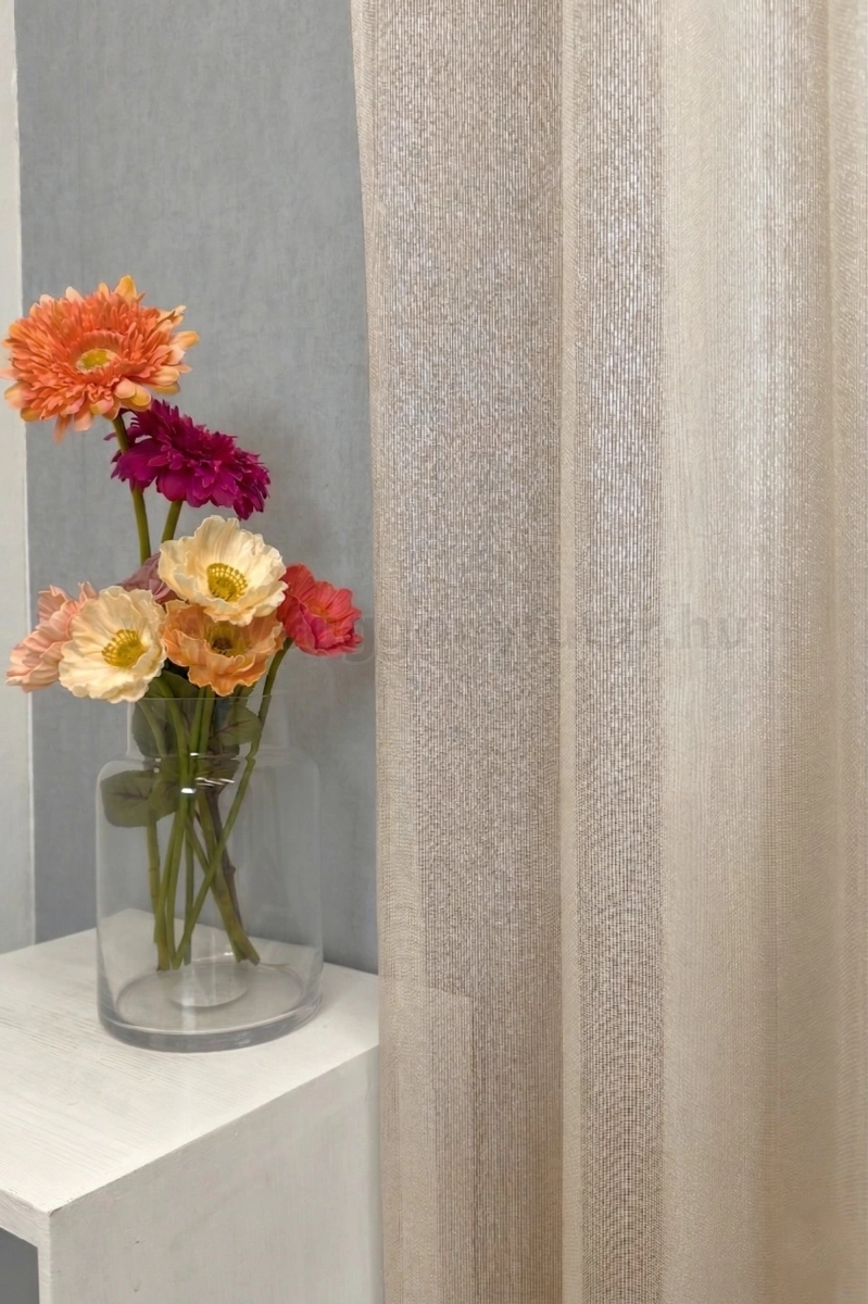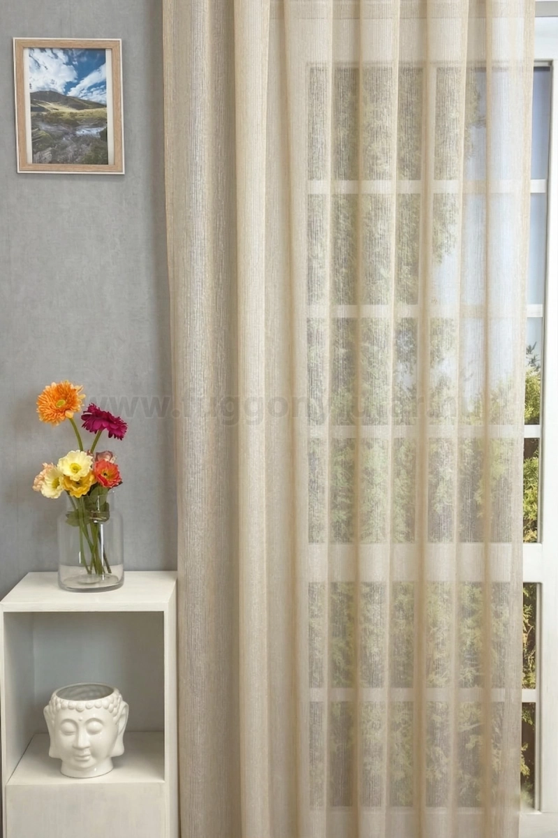 A szórt mintás anyagok izgalmas felülete bármely helyiségben jól mutat Az anyag teljes felületén elszórtan megjelenő ritkább-sűrűbb szálbeszövések izgalmas felületet hoznak létre. Bármilyen, színben harmonizáló, mintás anyagot remekül párosíthatunk hozzá. A barna és terrakotta szín a föld, a kitartás és kifinomultság jelképe A barnákat a kényelem és melegség kifejezésére használhatjuk. Élénk, gazdag árnyalatok alkalmazásával luxust és finomságot sugallhatunk. A barna, terrakotta színű fényáteresztő függönyökhöz általában a sötétbarna, bézs, sárga színű sötétítő és dekorfüggönyök illenek legjobban.Ez a függöny többféle lakberendezési stílushoz is jól illeszthető Ez a függöny több lakberendezési irányzathoz is tökéletesen illeszkedik – legyen szó a vintage nosztalgiáról, a skandináv egyszerűségről, az industrial stílus karakteréről, a mediterrán könnyedségről, az Art deco ragyogásáról, a glamour luxusáról, a minimál letisztultságról vagy a klasszikus eleganciáról. Anyaga diszkréten simul bele a térbe, miközben kiemeli a helyiség hangulatát. Ideális választás, ha olyan textilt keresünk, amely rugalmasan alkalmazkodik a meglévő bútorokhoz és kiegészítőkhöz.Anyaga: sablé Változó vastagságú szálakból szőtt anyag. Kevésbé hajlamos a gyűrődésre , mint a voile. 1.5x-es ráncolással ajánljuk.Terasz ajtókhoz, nagyobb ablakok függönyözéséhez jól használható A karnistól a felső szegéshez szükséges anyagot beleszámítva legfeljebb 318 cm hosszú függönyt lehet belőle varrni, ez alatt bármilyen méretben elkészítjük. Méreténél fogva alkalmas lehet terasz- és erkélyajtók, nagy belmagasságú helyiségek valamint normál ablakok függönyözésére is. A függöny aljába gyárilag varrt ólomzsinór megfelelő esést kölcsönöz a függönynek, megakadályozza az indokolatlan fellebbenést és az apróbb ráncokat is kisimítja.Vasalást kevésbé igénylő anyag Az anyag kevesebb vasalást igényel, mint az átlag függöny. Sokszor elég, ha mosás után még nedvesen a helyükre akasztjuk, így kilógva magát a ráncok kisimulnak és a függönyünk teljes pompájában ragyog!