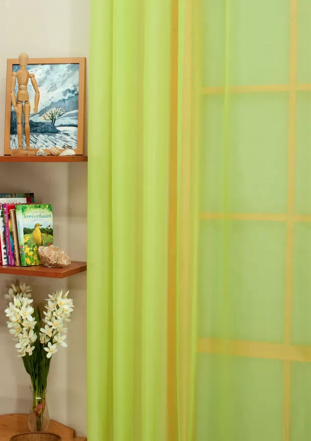 Kiwizöld egyszínű voile függöny, 180 cm magas.A minta nélküli anyagok univerzálisak, jól passzolnak bármihez A minta nélküli anyagokhoz bármilyen színben harmonizáló mintás anyagot, tapétát remekül párosíthatunk. Hozza közel a természetet a zöld szín segítségével! Friss és természetközeli szín. A természetet, az újrakezdést és az egészséget szimbolizálja. Segít frissen és harmonikusan tartani a szobát. Használjuk a konyhában és a közösségi terekben. A zöld színű fényáteresztő függönyökhöz általában a sötétbarna, zöld, bézs, ekrü és sárga színű sötétítő és dekorfüggönyök illenek legjobban.Ez a függöny többféle lakberendezési stílushoz is jól illeszthető Ez a függöny több lakberendezési irányzathoz is tökéletesen illeszkedik – legyen szó a skandináv egyszerűségről vagy a mediterrán könnyedségről. Anyaga diszkréten simul bele a térbe, miközben kiemeli a helyiség hangulatát. Ideális választás, ha olyan textilt keresünk, amely rugalmasan alkalmazkodik a meglévő bútorokhoz és kiegészítőkhöz.A megújulás energiája otthonában A tavasz típusú textíliák frissességet, optimizmust és energiát sugároznak. Színvilágukban a zsenge zöldek, a napsárgák, a barackos árnyalatok és a tiszta kékek dominálnak. Ez a stílus tökéletesen illik a dinamikus, vidám személyiségekhez. Anyaga diszkréten simul bele a térbe, miközben kiemeli a helyiség hangulatát. Ideális választás, ha olyan textilt keresünk, amely rugalmasan alkalmazkodik a meglévő bútorokhoz és kiegészítőkhöz.Anyaga: voile Vékony, könnyed, fátyolszerű anyag . Az organzához képest vastagabb szálakból szövik, így kevésbé átlátszó, nehezebben gyűrődik, bár vasalást azért igényel (gőzölős vasalóval viszonylag könnyen, sérülésmentesen vasalható). 1.5x v. 2x-es ráncolással ajánljuk.Normál ablakok függönyözéséhez használható A karnistól a felső szegéshez szükséges anyagot beleszámítva legfeljebb 178 cm hosszú függönyt lehet belőle varrni, ez alatt bármilyen méretben elkészítjük. Méreténél fogva normál méretű ablakok függönyözésére alkalmas. A függöny aljába gyárilag varrt ólomzsinór megfelelő esést kölcsönöz a függönynek, megakadályozza az indokolatlan fellebbenést és az apróbb ráncokat is kisimítja.