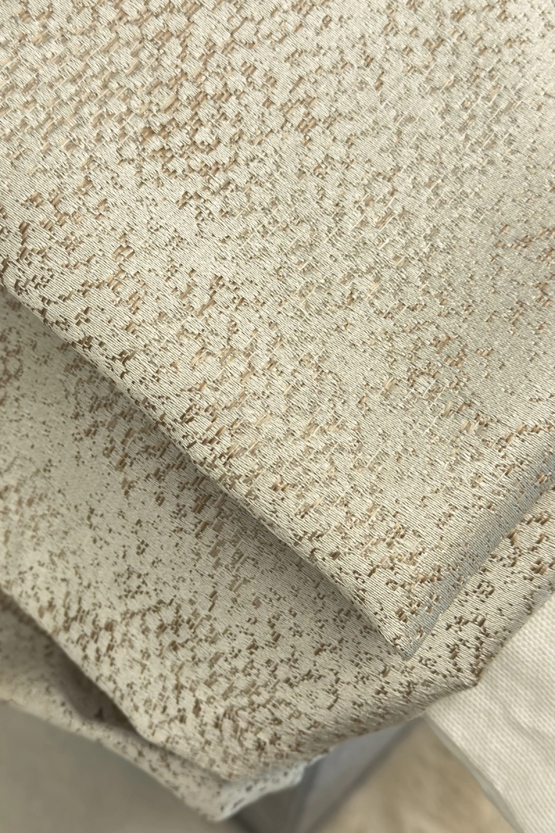 Az anyag teljes felületén elszórtan megjelenő ritkább-sűrűbb szálbeszövések izgalmas felületet hoznak létre. Bármilyen, színben harmonizáló, mintás anyagot remekül párosíthatunk hozzá.