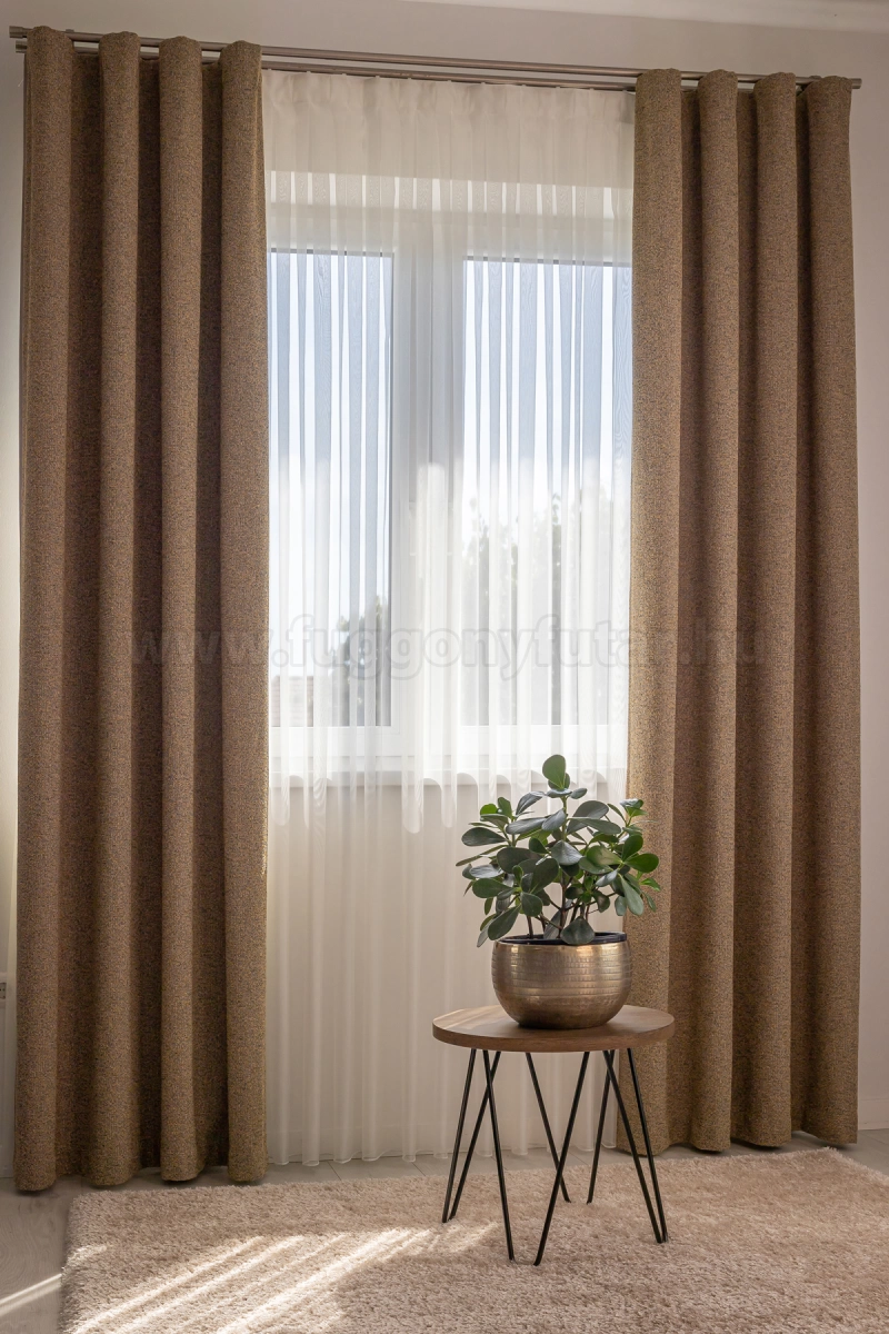 A barna, terrakotta színű sötétítő anyagokhoz általában a bézs, ekrü, sárga, fehér, színű fényáteresztő függönyök illenek legjobban.