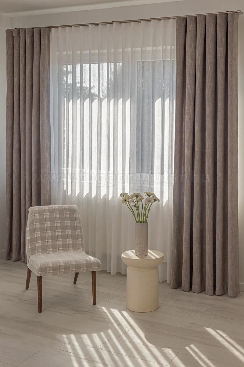A barna, terrakotta színű sötétítő anyagokhoz általában a bézs, ekrü, sárga, fehér, színű fényáteresztő függönyök illenek legjobban.
