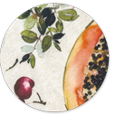 Papaya - Homokszínű alapon színes mediterrán gyümölcsmintás vászon dekor és abrosz anyag