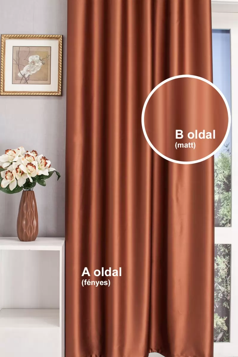 Elegáns, sokféle stílushoz illeszthető ez a dimout sötétítő függöny. Egyik oldala fényes rézbarna, másik oldala matt narancsos barna, alkalmas ágyterítő, párna készítésére is.