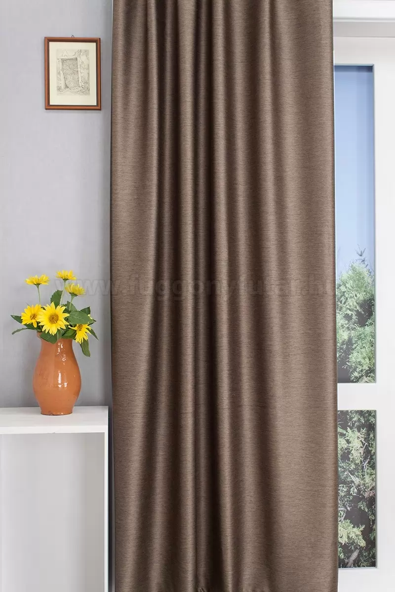 Minden stílushoz jól illik ez a sötétbarna, cirkás szövésű dimout függöny. A csokoládébarna, és a kávébarna szálak teszik érdekessé a felületét. A hátoldala egyszínű bézsbarna. Könnyen kezelhető, kezelhető, egyéb dekorációs célokra is alkalmas: ágytakaró, díszpárna is készülhet belőle.