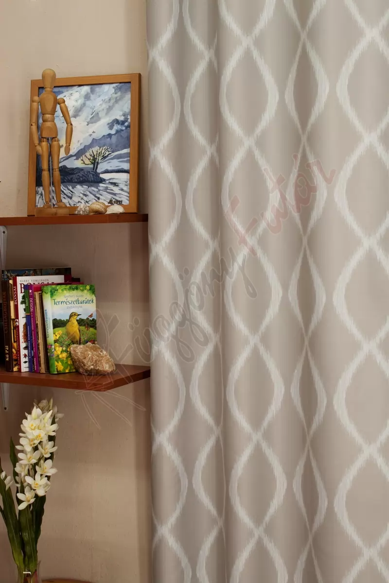 Nappaliba, hálószobába ajánljuk. Ehhez a függönyhöz legjobban a minta nélküli, vagy világos alapon csíkos, hullámmintás fényáteresztő függönyök illenek, leginkább azok, amelyek színe megegyezik a sötétítő függöny valamelyik árnyalatával.