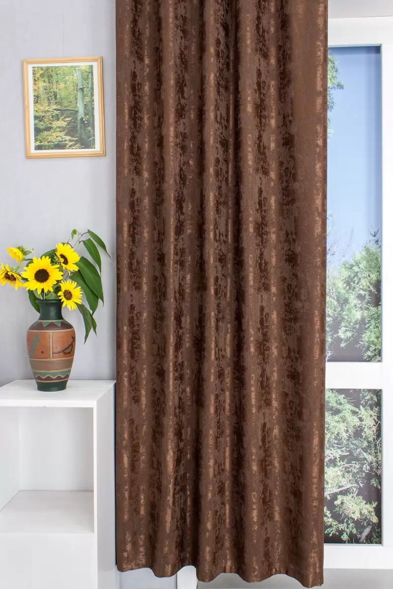 Sötétbarna színű, kétoldalas jacquard sötétítő. Márványozott hatású minta bársonyos és sima szövésű felelületek váltakozásával. Mindkét oldala színoldalként használható.