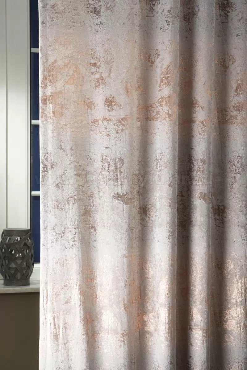 Különleges, gyűrt hatású dekoratív anyag. Fémesen csillogó és matt szálakból készült, a hátoldalán fordított mintával. A taftnál puhább tapintású. Elegánsan ünnepélyes , mégis sokféle stílusú berendezéshez illeszthető. Szürkésbarna, őzbarna alapon csillogó bronz szálakból szőtt kelme, mely függönynek, díszpárnának is használható, sokféle dekorációs célra alkalmas.