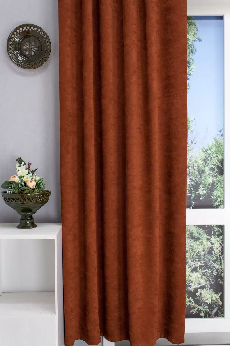 Nagyon otthonos, meleg hatású ez a narancsos barna színű, egyik oldalán bársonyos tapintású sötétítő függöny. Ágytakaró, díszpárna is készíthető belőle.