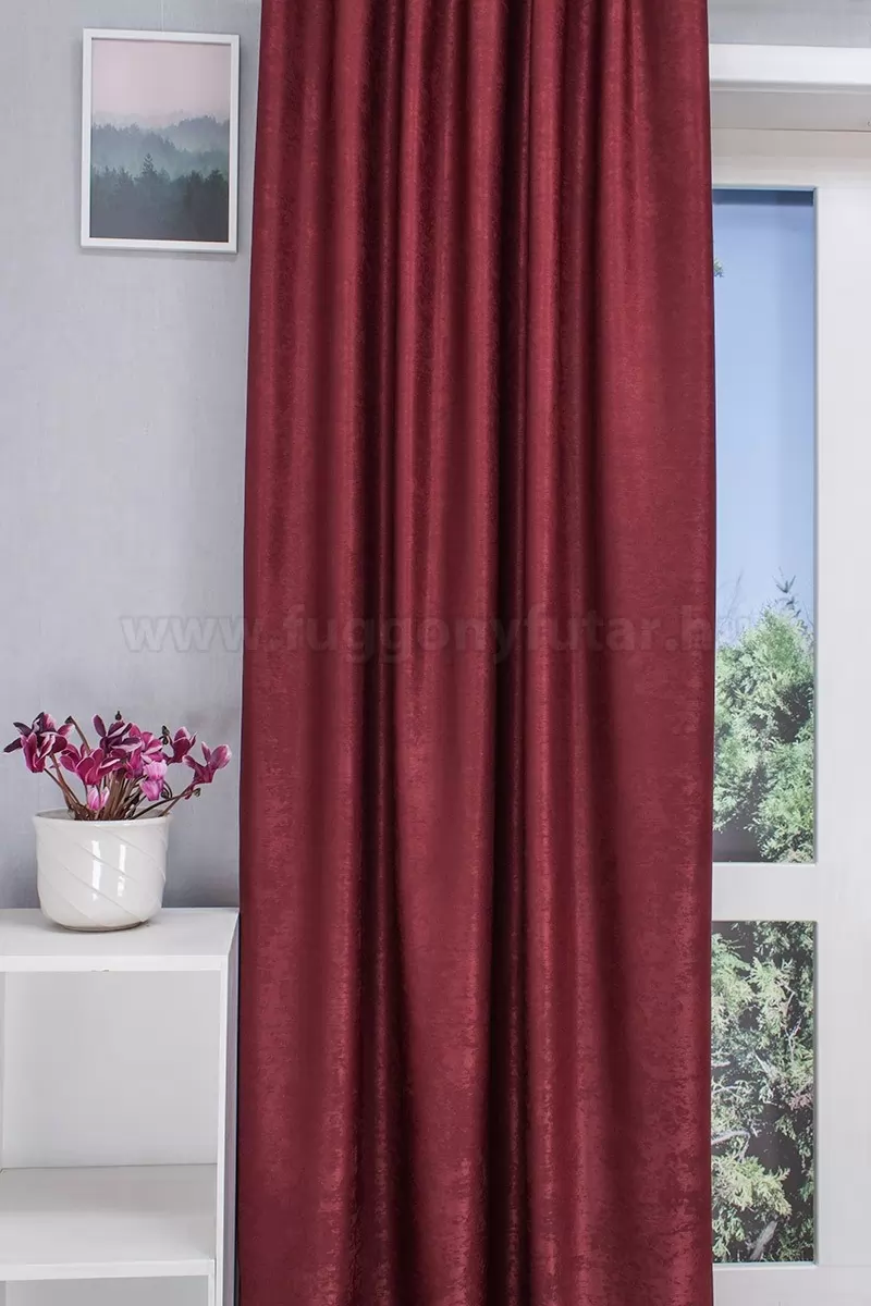 Az anyagról: Minden stílushoz jól illeszthető ez a mikroplüss dekorációs, sötétítő függöny. Borvörös bársonyos felületén simább szövés ad cirkás mintát. Egyéb dekorációs célokra is alkalmas. Ágyterítő, párnahuzat is készíthető belőle.