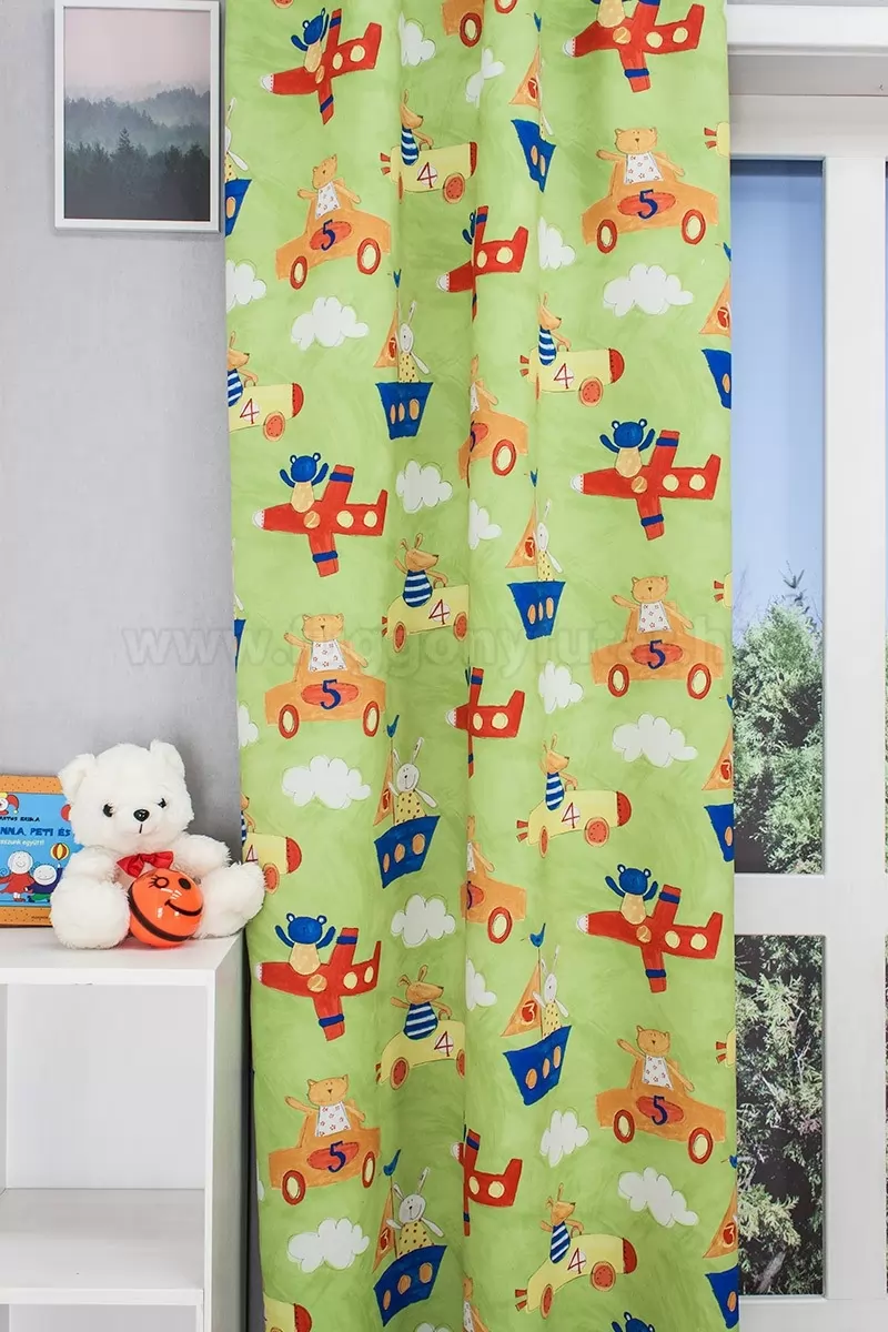 Kisgyermekek szobájába ajánljuk ezta zöldessárgasárga dekorációs, sötétítő függönyt. Az élénk színű , piros, sárga ,kék figurák: kutya, nyuszi, hajó, autó, kedves mesevilágot varázsolnak . Az anyaga dimout , ezért nagyon jó dimout, könnyen kezelhető. A hátoldala egy színű.